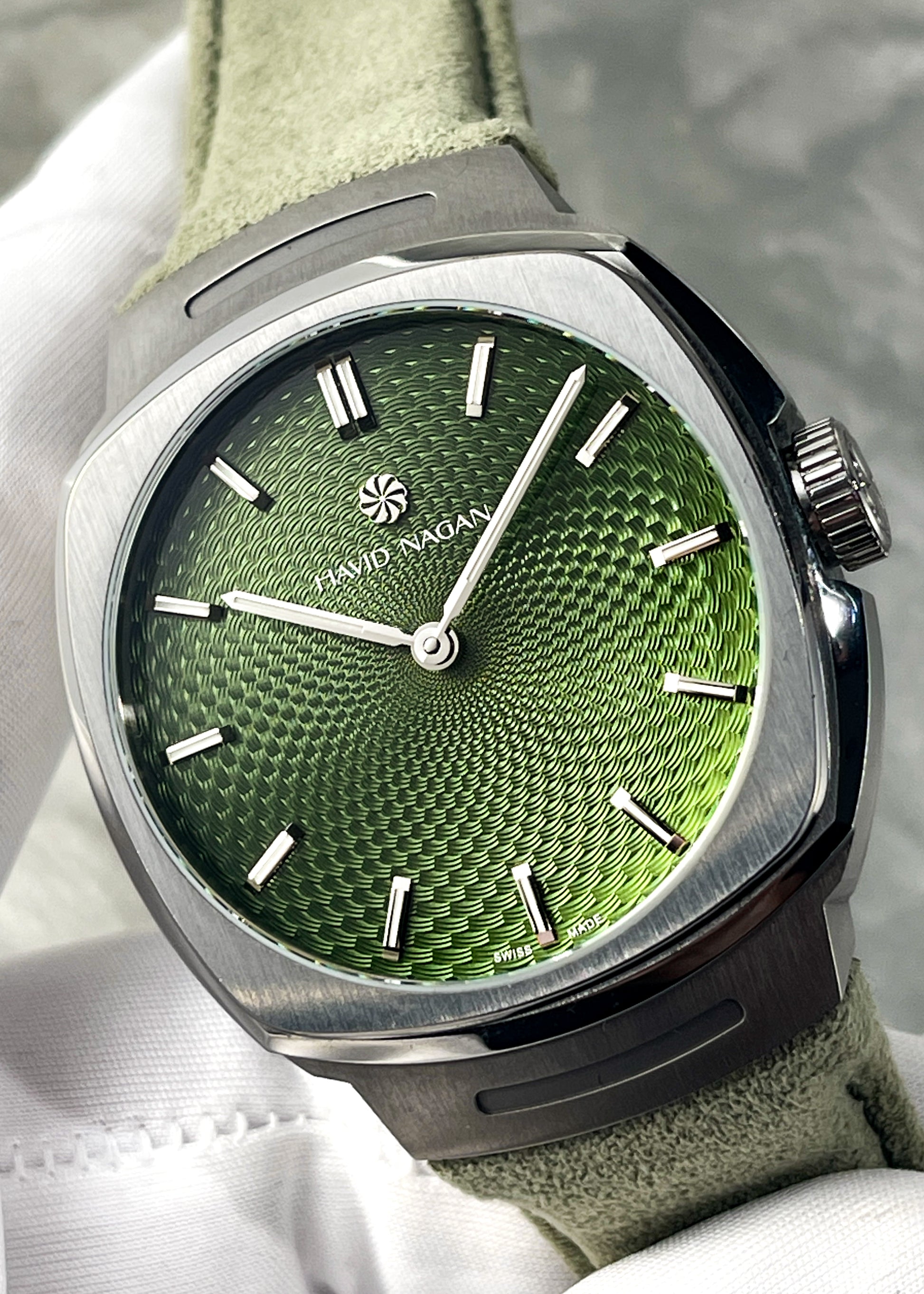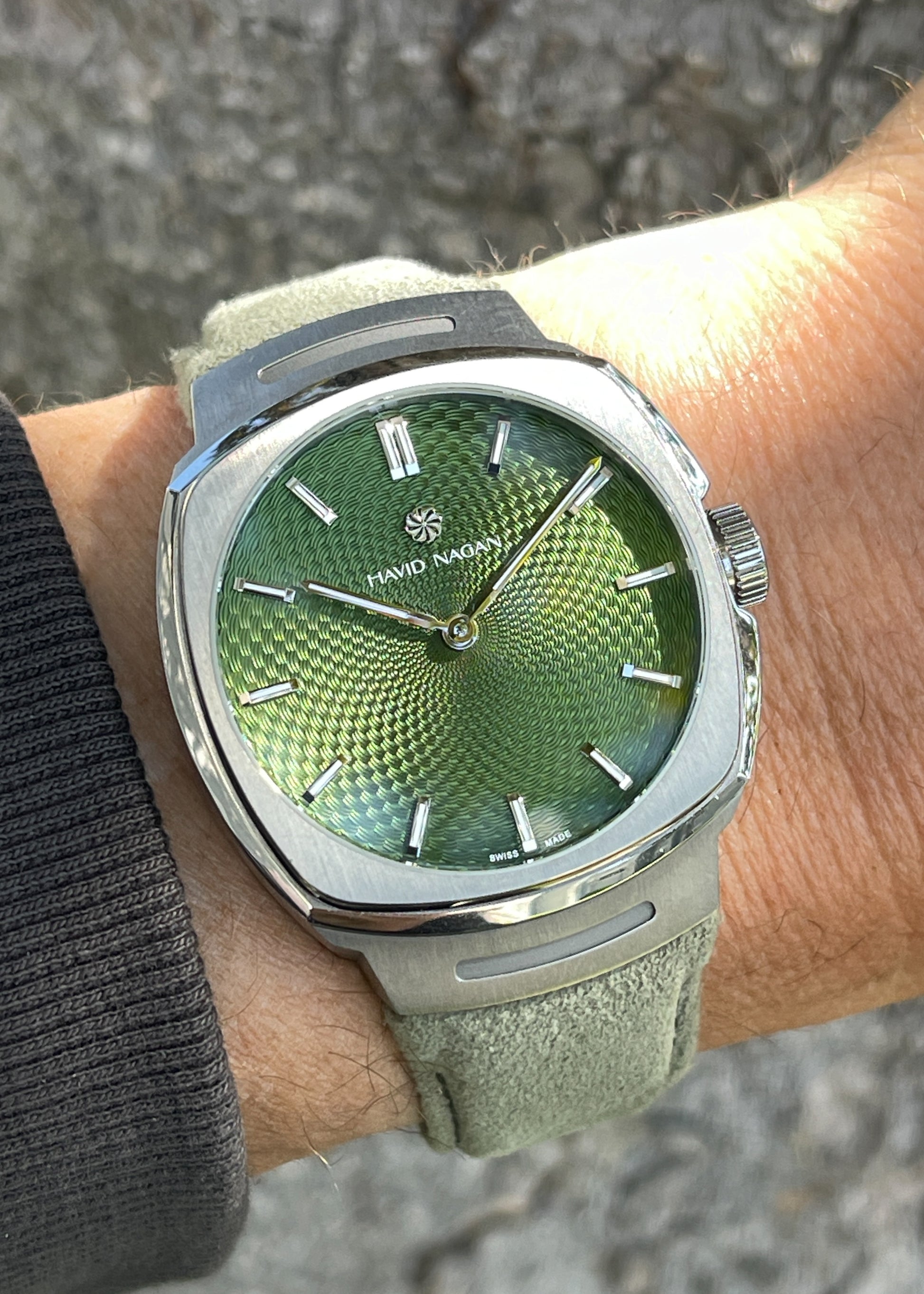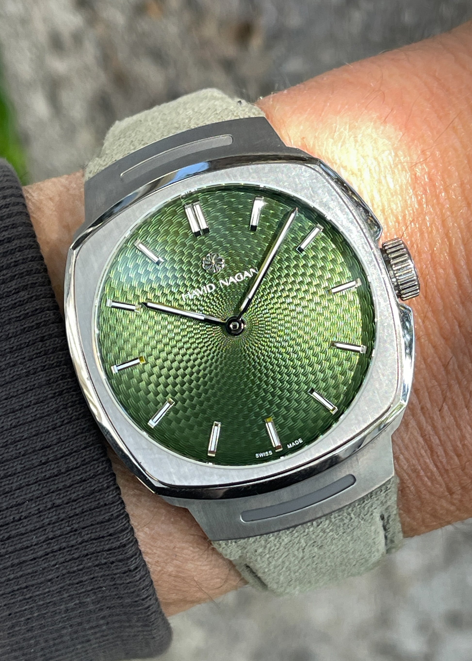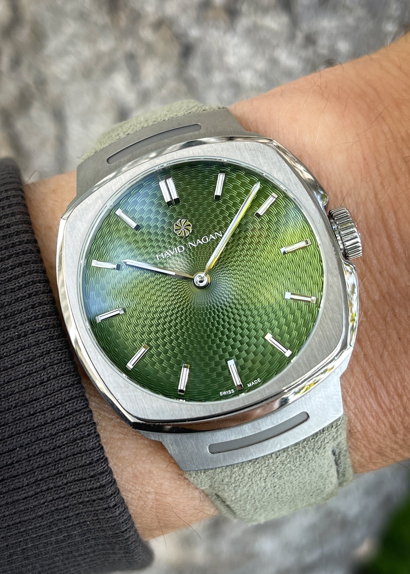 This piece features a lovely "Jade" dial with a circular Grain d' Orge guilloché pattern. The Grade 5 titanium case measures 40.7mm in diameter x 12.2mm thick at its slimmest point, and 14.8mm at its thickest. This may sound a little thicker than most prefer, however the entire caseback (sapphire crystal included) curves in a way that makes this watch super comfortable on the wrist.