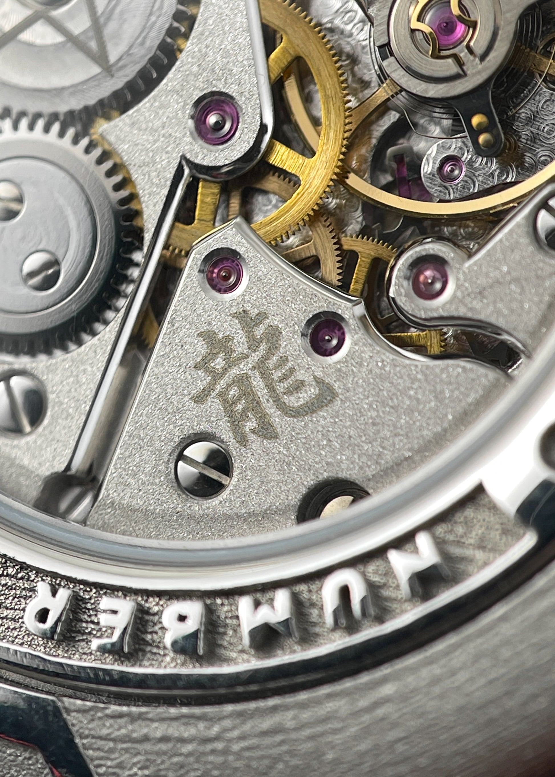 The reverse side reveals an ETA/Peseux 7001 hand wound caliber which exhibits beautiful hand finishing on the bevels. As a nod to Revolution, a star motif was added to the ratchet wheel. Additionally, the original owner requested to have the Dragon Chinese character on a bridge. The power reserve is approximately 45 hours and operates at 3 Hz.