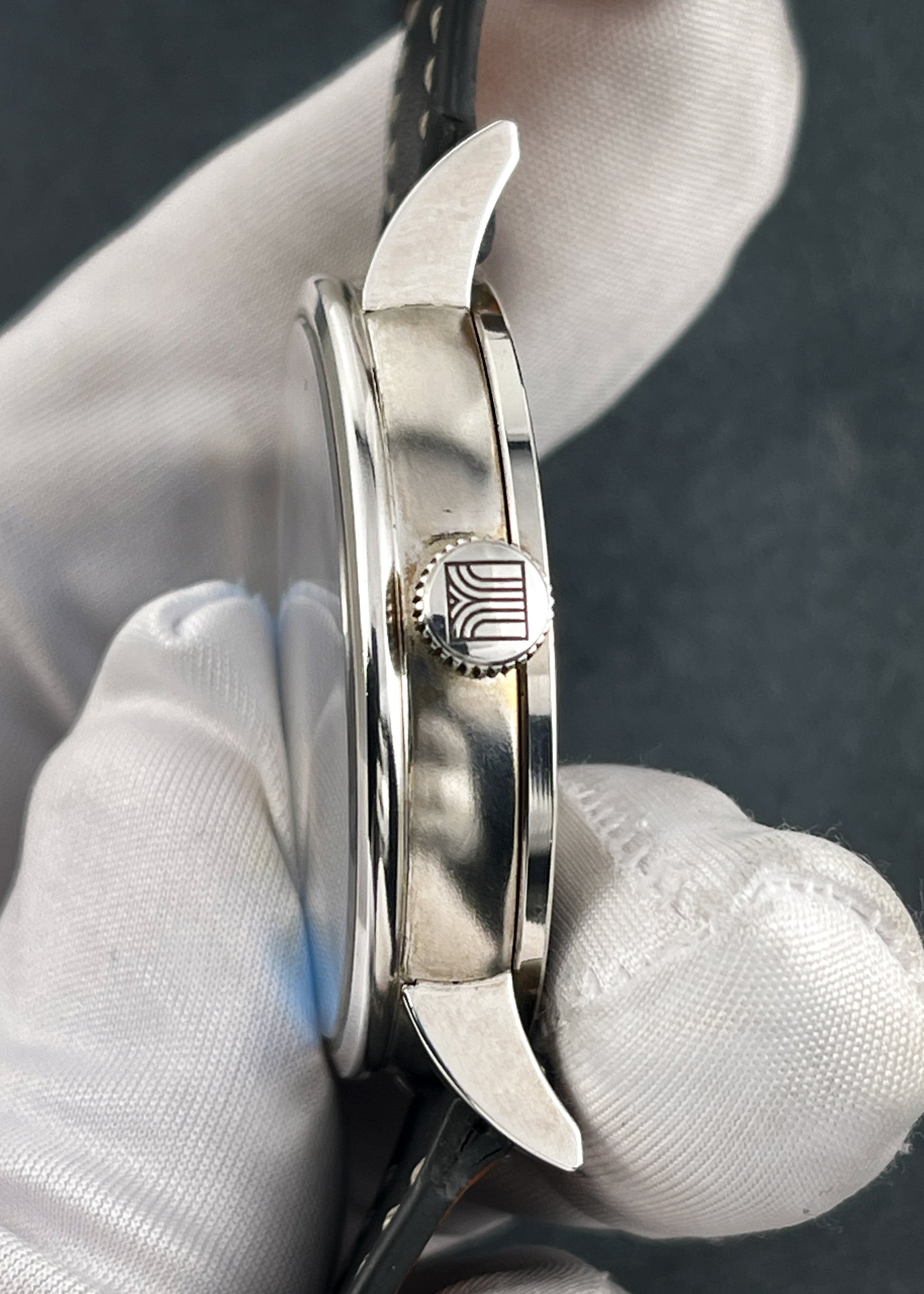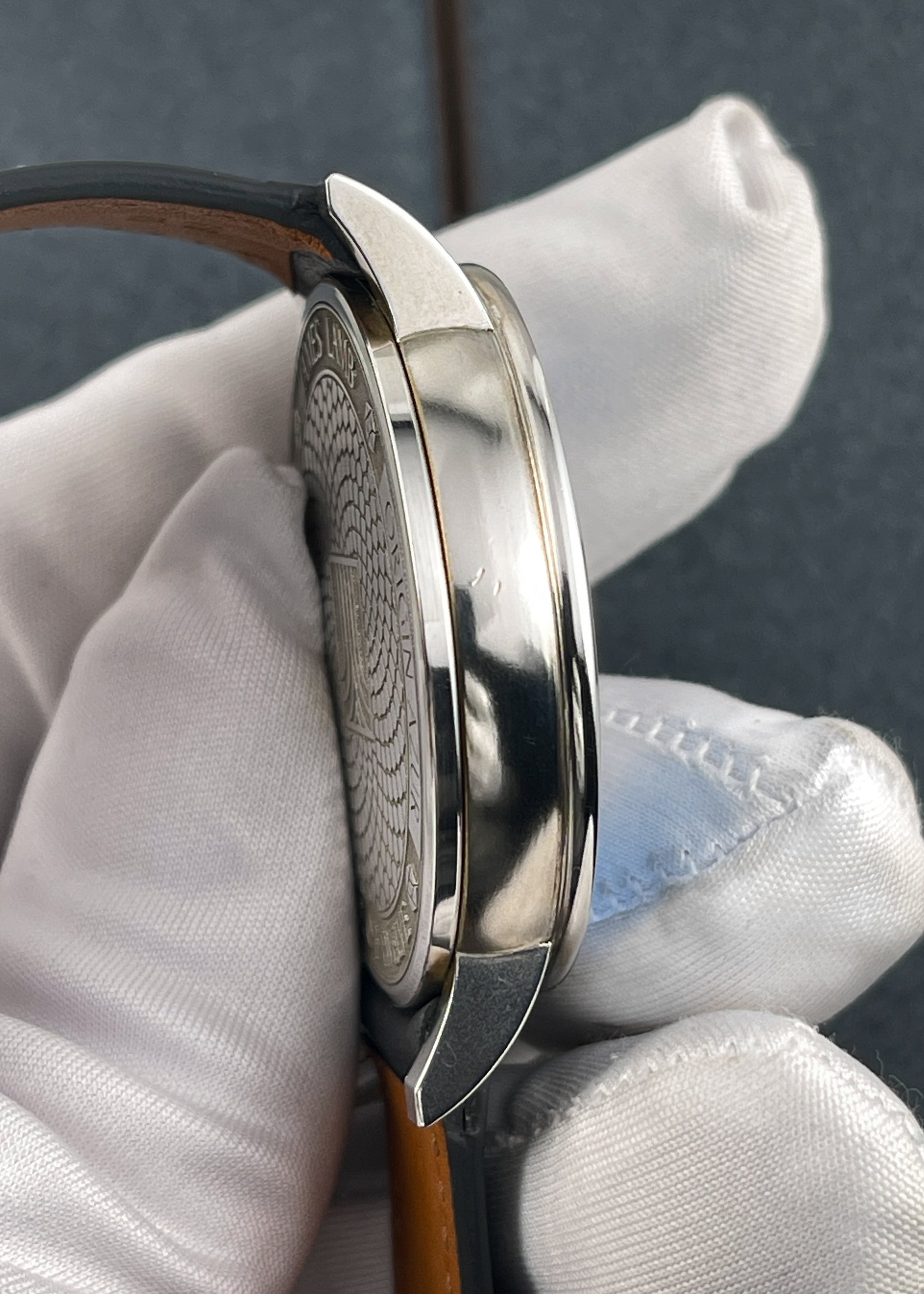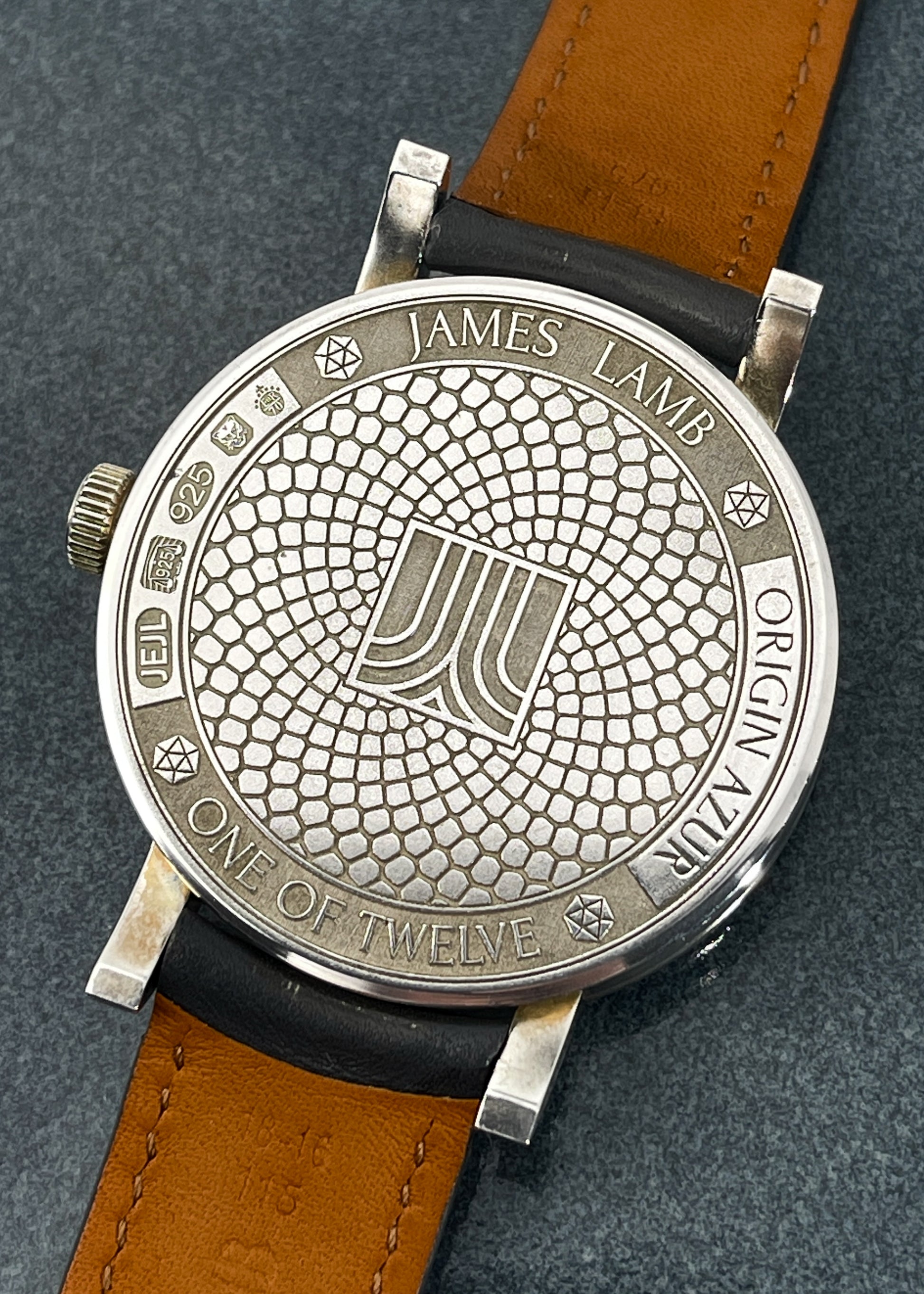 The .935 Argentium Silver case measures 39mm x 9.75mm x 48mm lug-to-lug and exhibits a small amount of patination throughout the case, bezel, and solid silver caseback. Complete with Box and Warranty Card dated January 2023. From time of listing 9 months remain of the 3 Year James Lamb Warranty.