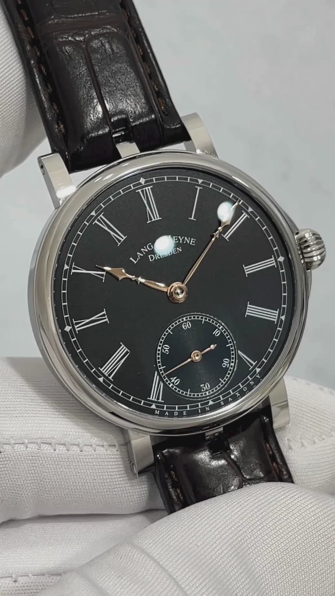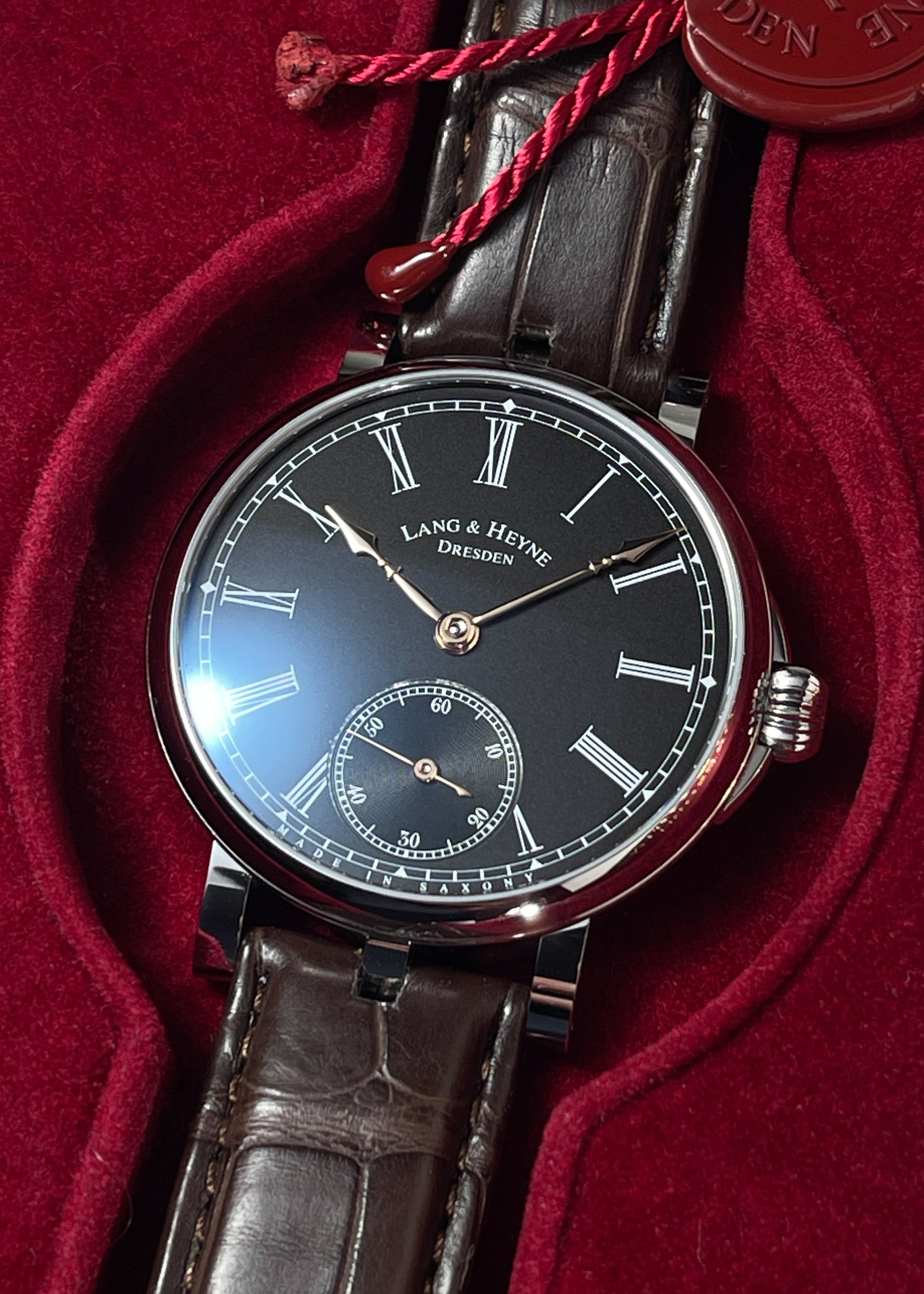 With great pleasure I'm happy to announce the arrival of this beautiful Lang & Heyne Friedrich III assembled in my favorite configuration: rose gold Cathedral hands set atop a black dial with elongated Romans crafted from solid silver. The dark brown alligator strap shows signs of limited use and the case is in excellent condition.