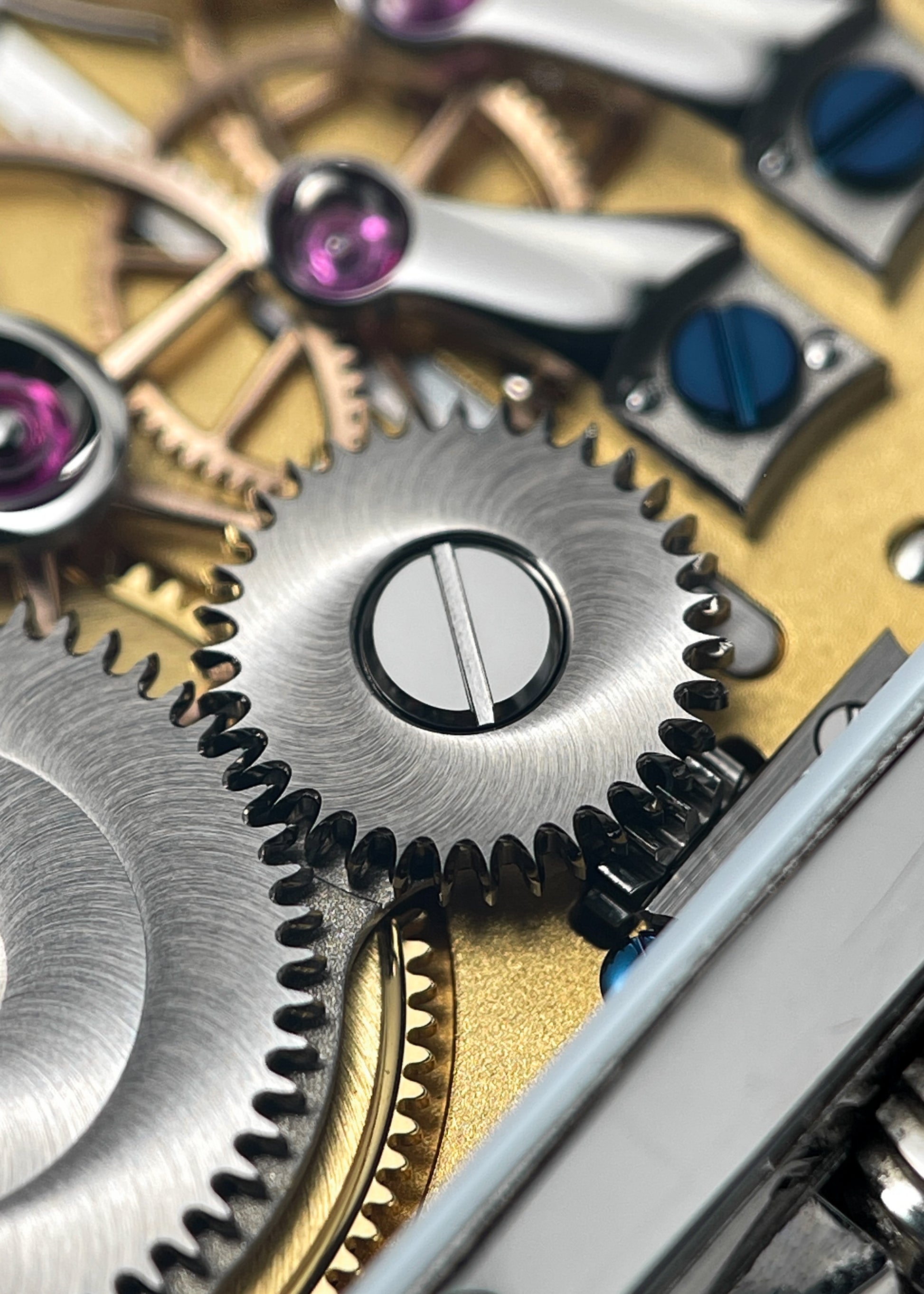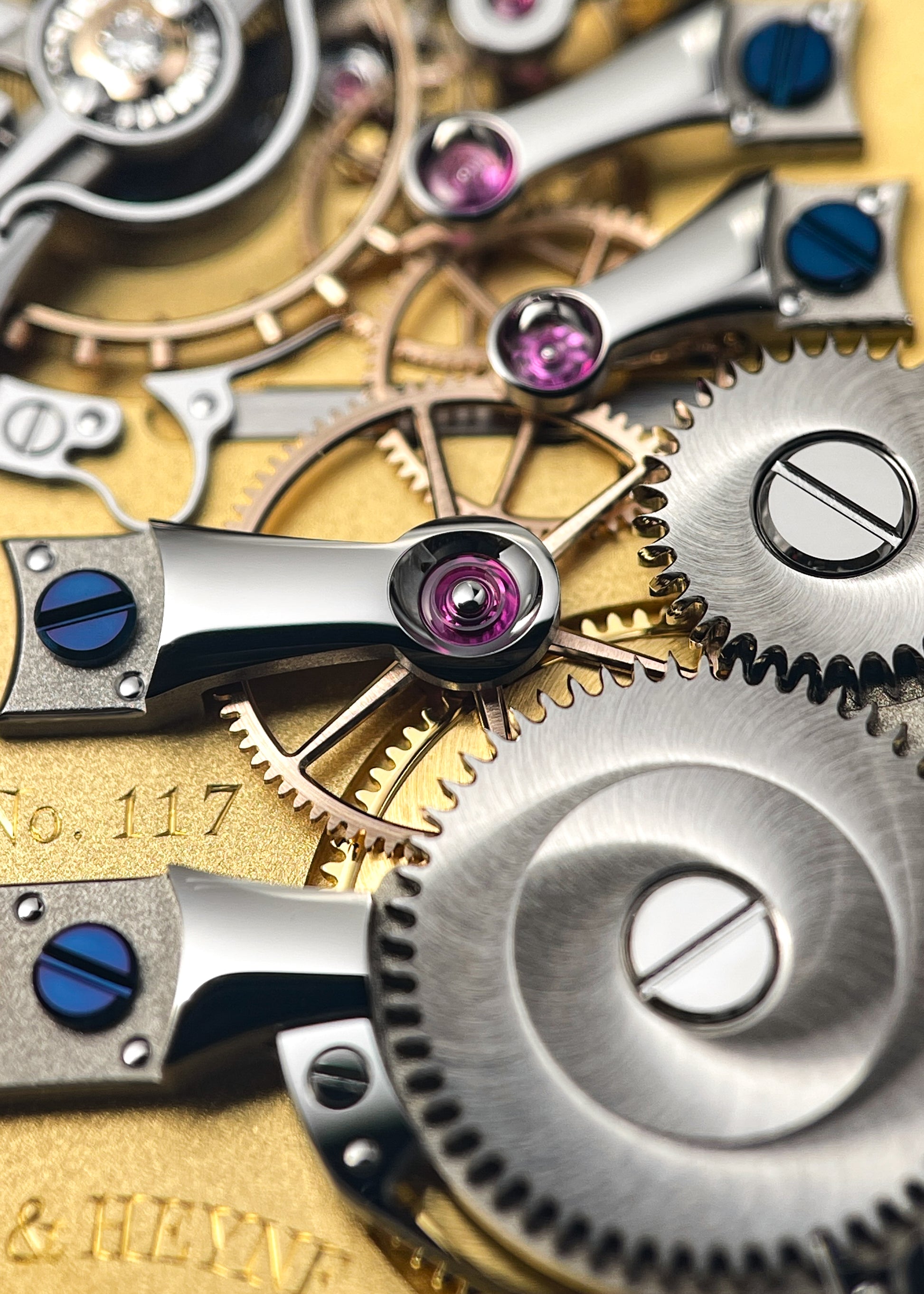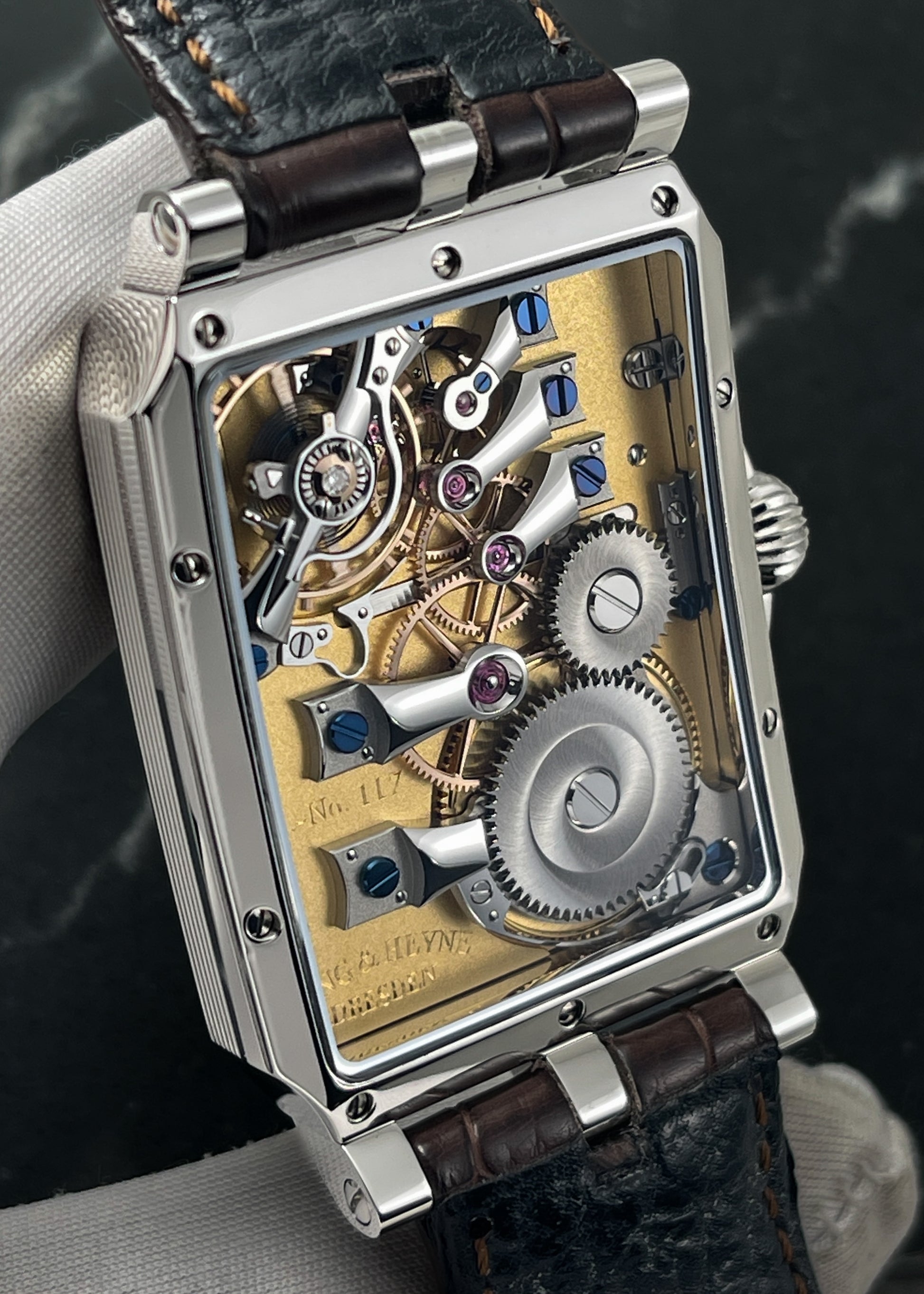 The reverse side reveals the perfectly designed open architecture of Lang & Heyne's Caliber VIII manual-winding movement. Personally, I can't think of a watch with a more attractively laid out gear train. This layout not only provides for the clearest understanding of the interaction of wheels and components, but also affords the user the most unobstructed view of the finely finished solid gold wheels, blued screws, and exquisitely polished curved stainless steel bridges. The Caliber VIII operates at 2.5 Hz and carries a 55-hour power reserve.