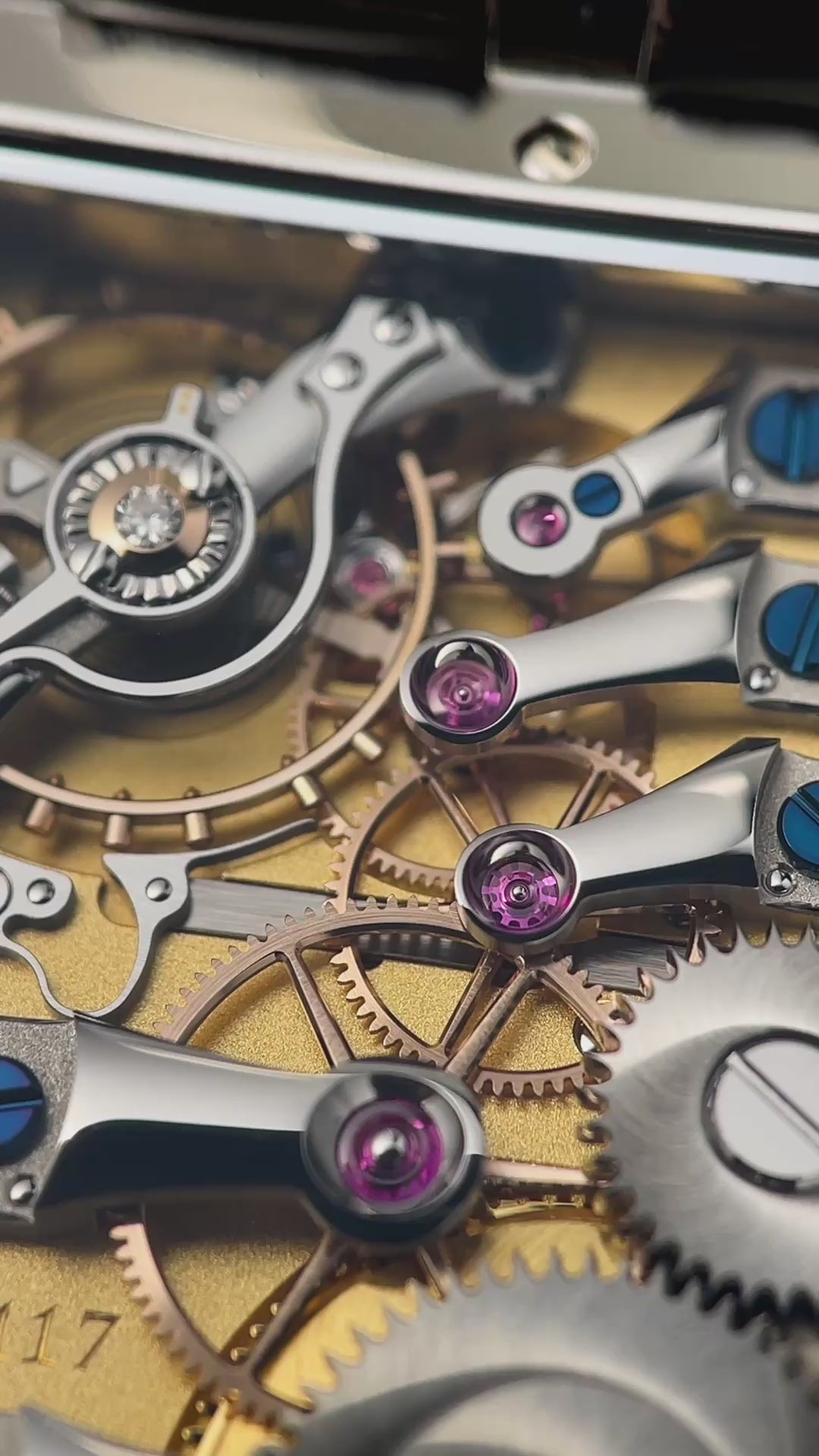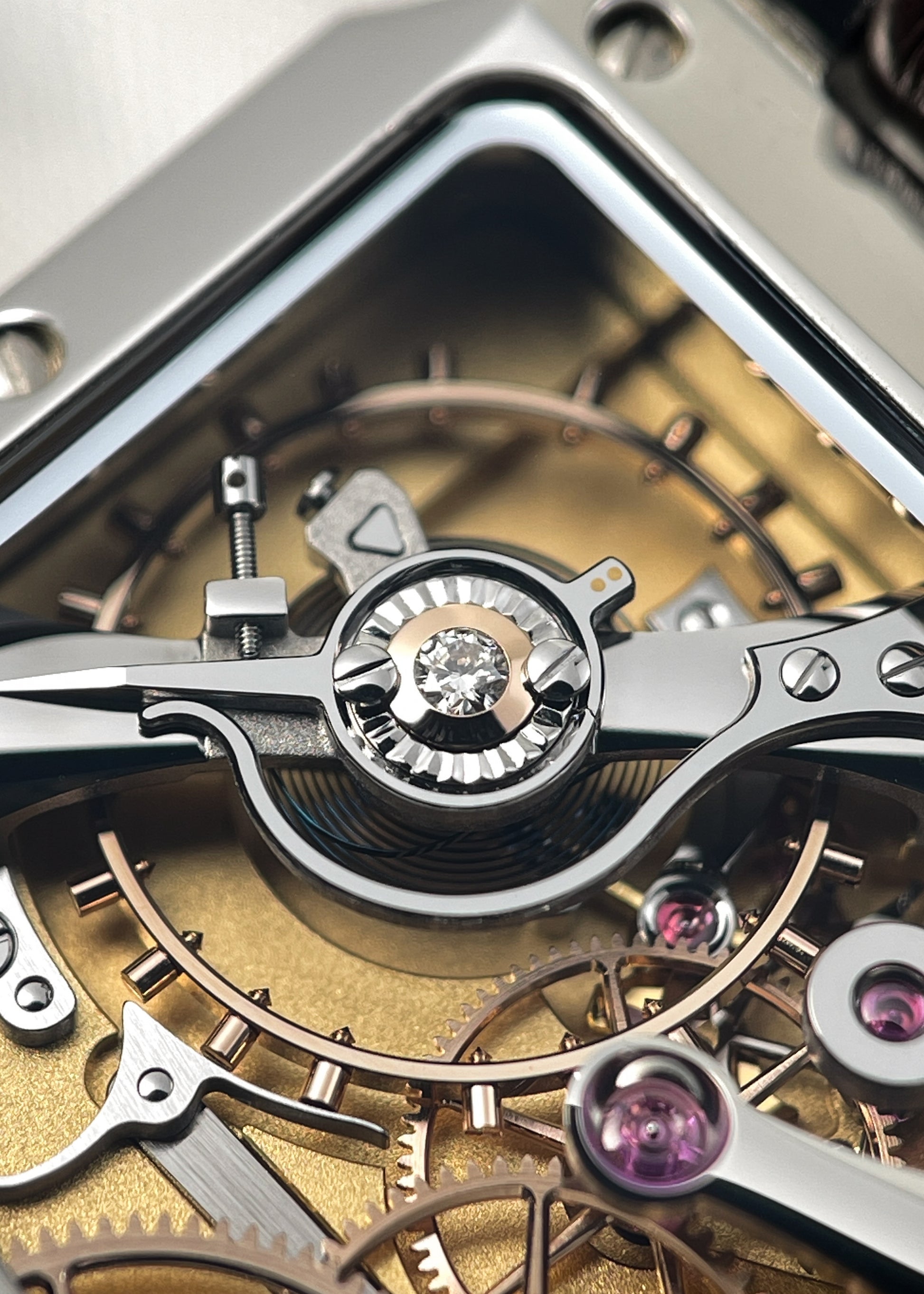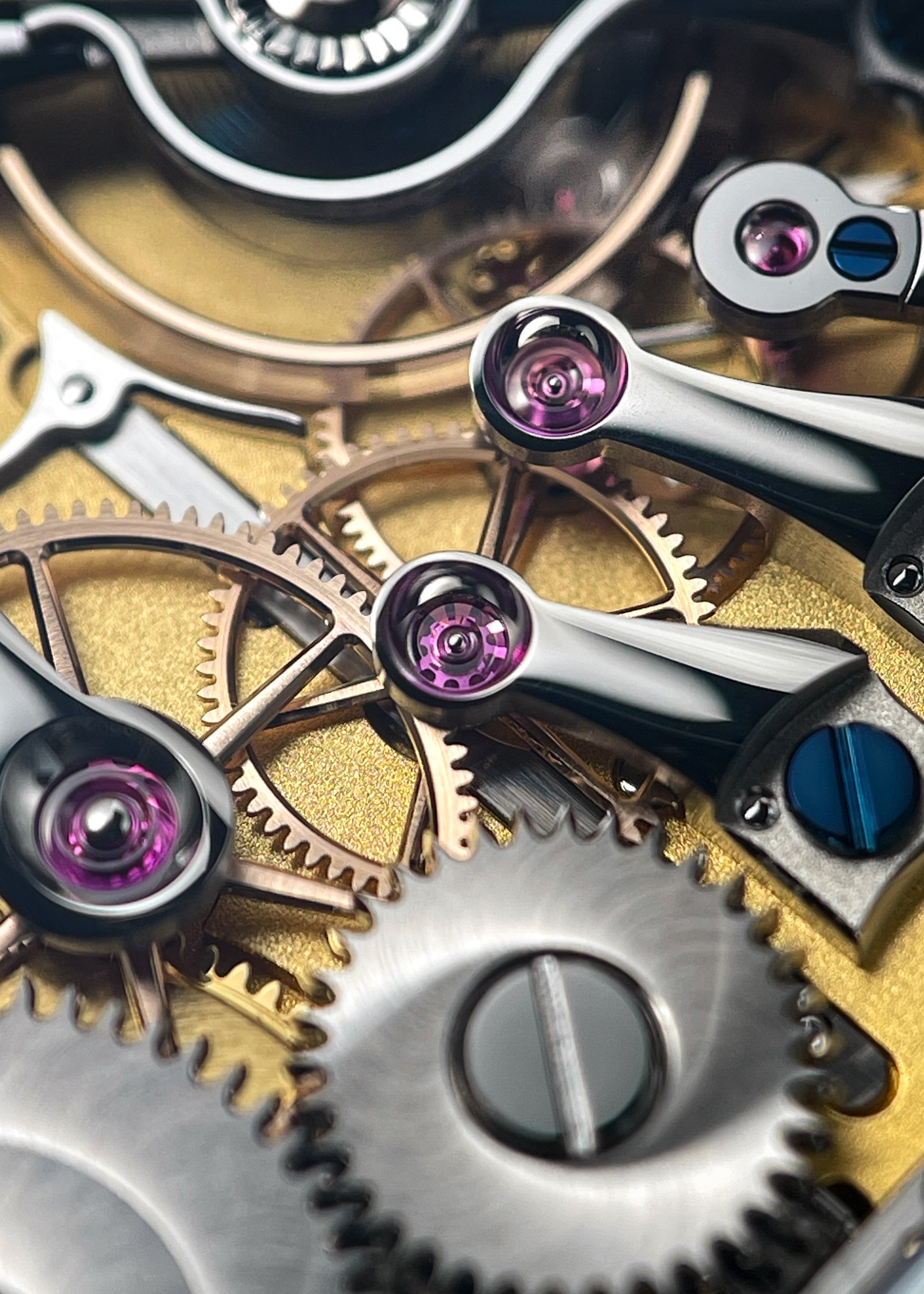 The reverse side reveals the perfectly designed open architecture of Lang & Heyne's Caliber VIII manual-winding movement. Personally, I can't think of a watch with a more attractively laid out gear train. This layout not only provides for the clearest understanding of the interaction of wheels and components, but also affords the user the most unobstructed view of the finely finished solid gold wheels, blued screws, and exquisitely polished curved stainless steel bridges. The Caliber VIII operates at 2.5 Hz and carries a 55-hour power reserve.