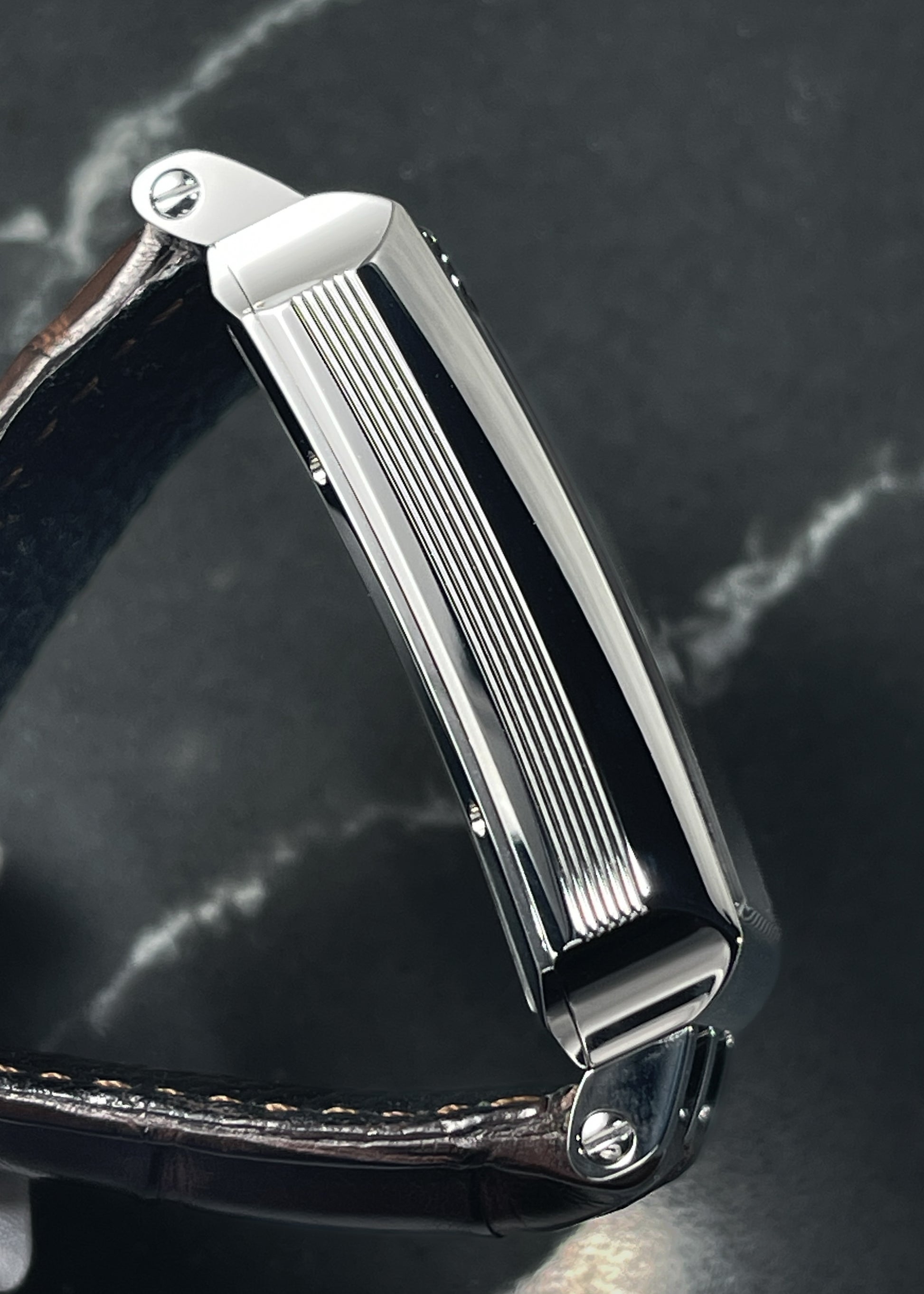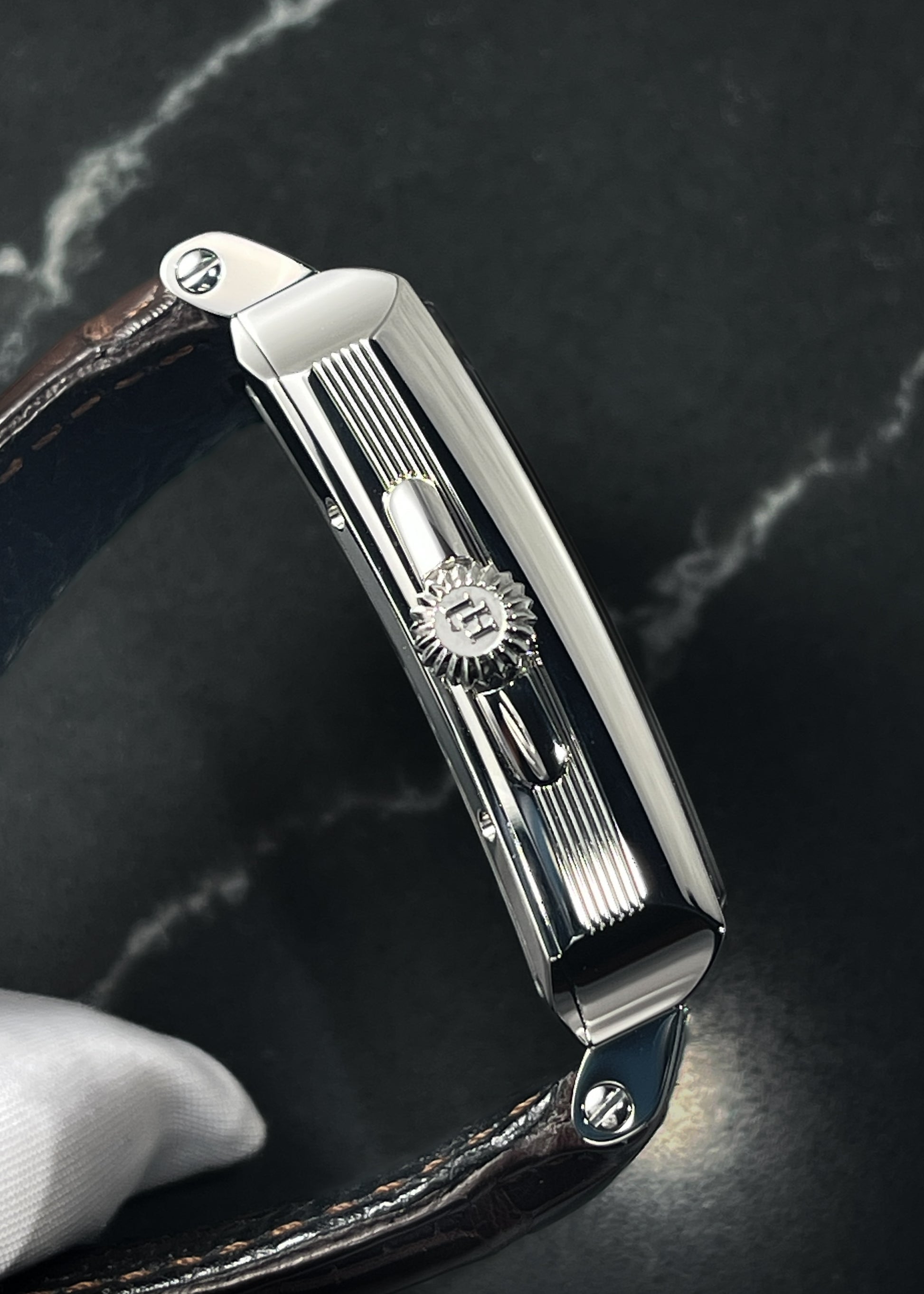 The stainless steel case is in mint condition and measures 40mm long x 32mm wide x 9.4mm thick and 49mm lug-to-lug. Paired with a dark brown alligator strap and furnished with complete Box and Papers.