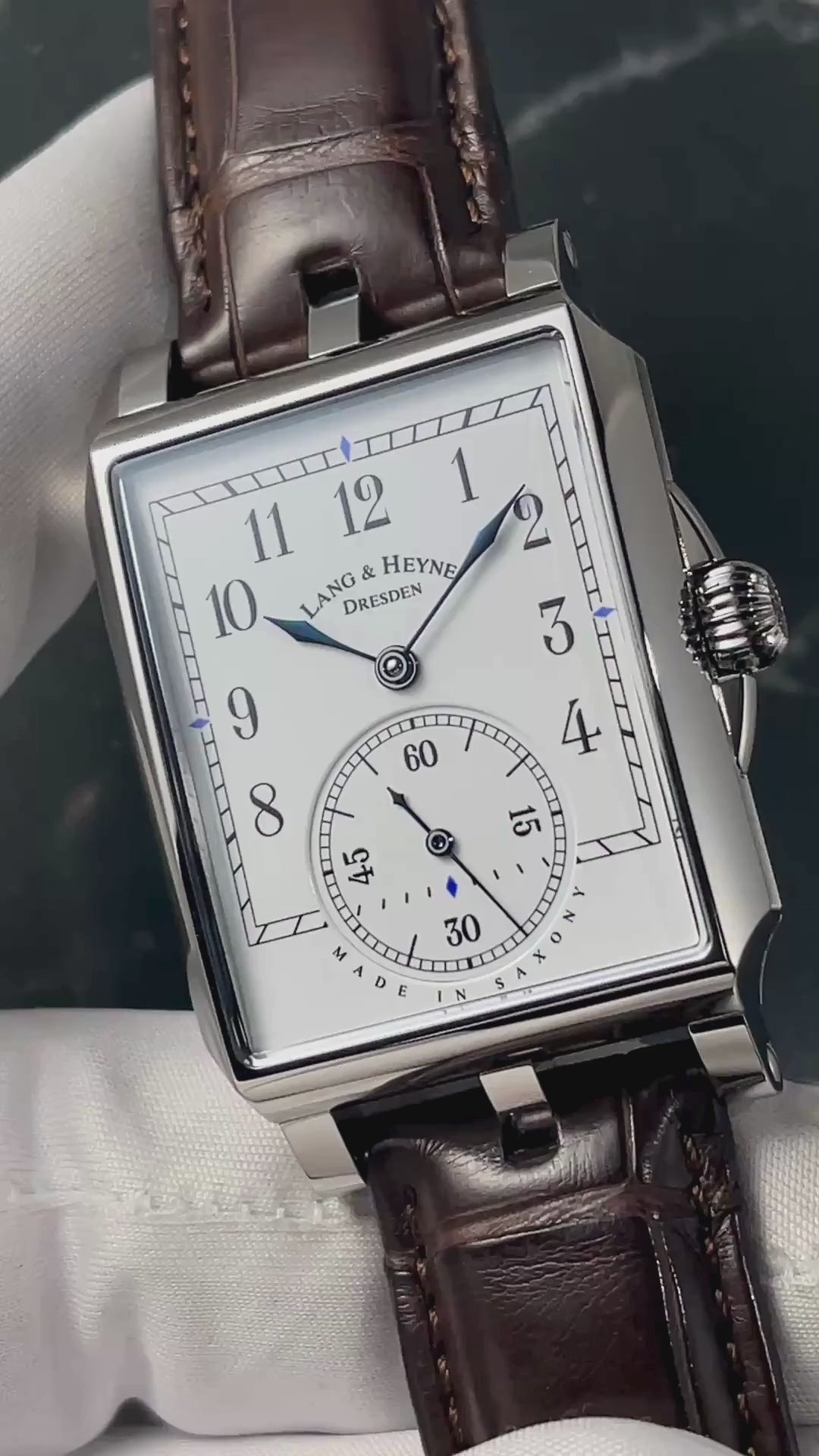 Sitting below the blued steel Lancet hands is a lovely white enamel dial with Arabic numerals. The seconds are contained in an oversized subdial at the 6 o'clock position.