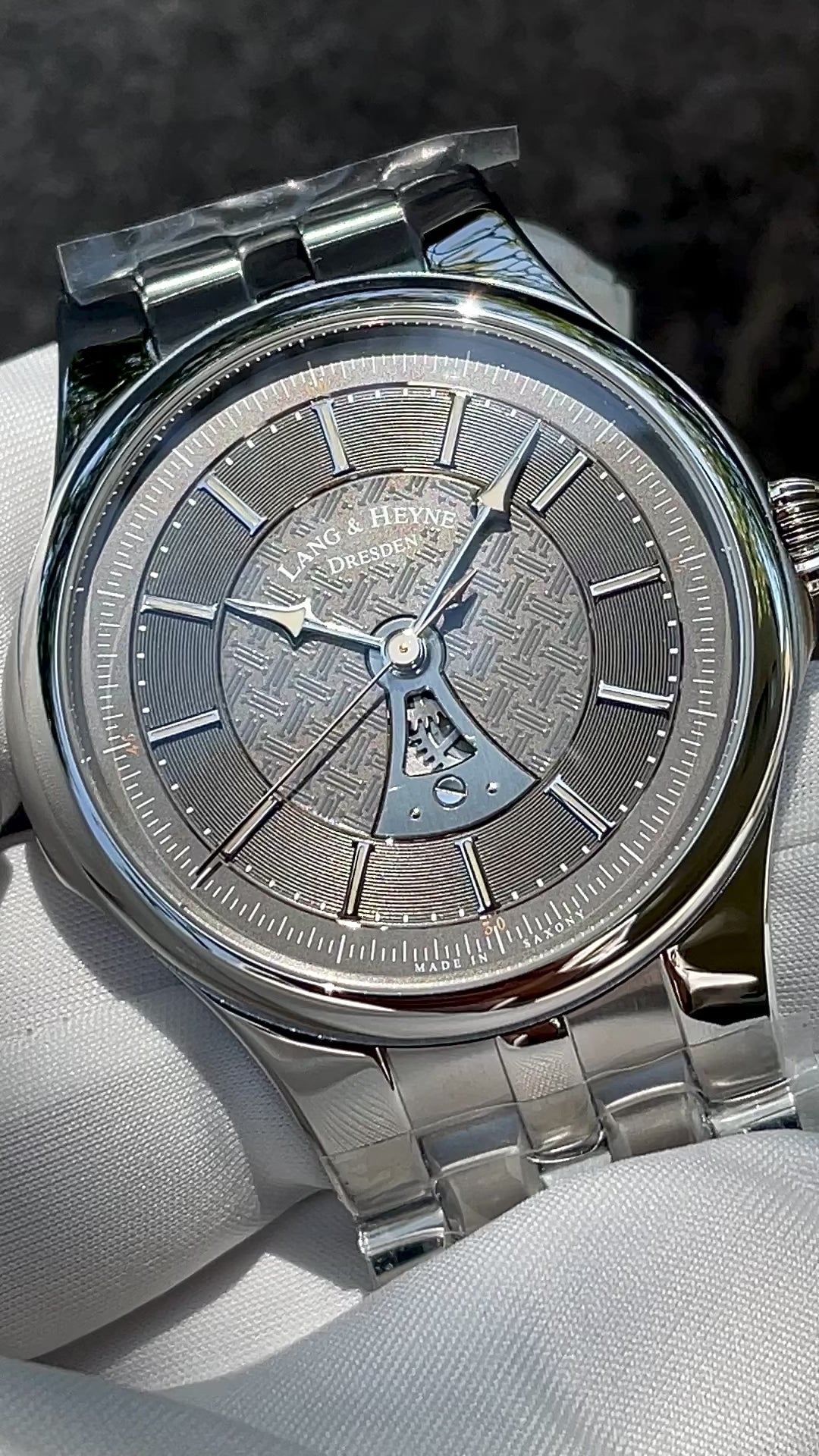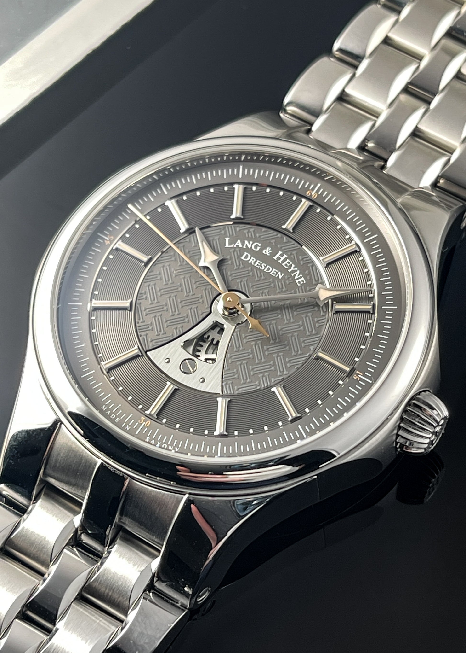 A very unique offering from the extraordinary Lang & Heyne, the Hektor is the first and only watch they have constructed with a steel (integrated) bracelet. Released in 2022, Hektor was created in a limited edition of 99 pieces evenly spread across three dials (grey, blue, and green). Here we have the grey dial which features a pattern I can't recall ever seeing on any other watch. The pattern shifts around light in a beautiful manner which can be viewed in the provided video.
