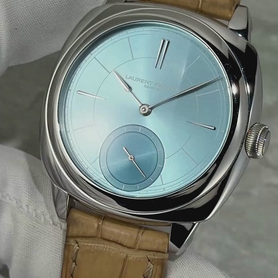 Note: This watch began its life with a dark blue dial and the client later requested to have the dial changed to the Ice Blue dial for a sum of $2,500. This listing is for the watch as pictured with the Ice Blue dial AND the additional Dark Blue dial saved in a plastic membrane case. Complete with Box and Papers dated 11/24/17, and supplementary papers issued by Laurent Ferrier indicating the dial change 7/1/2019.