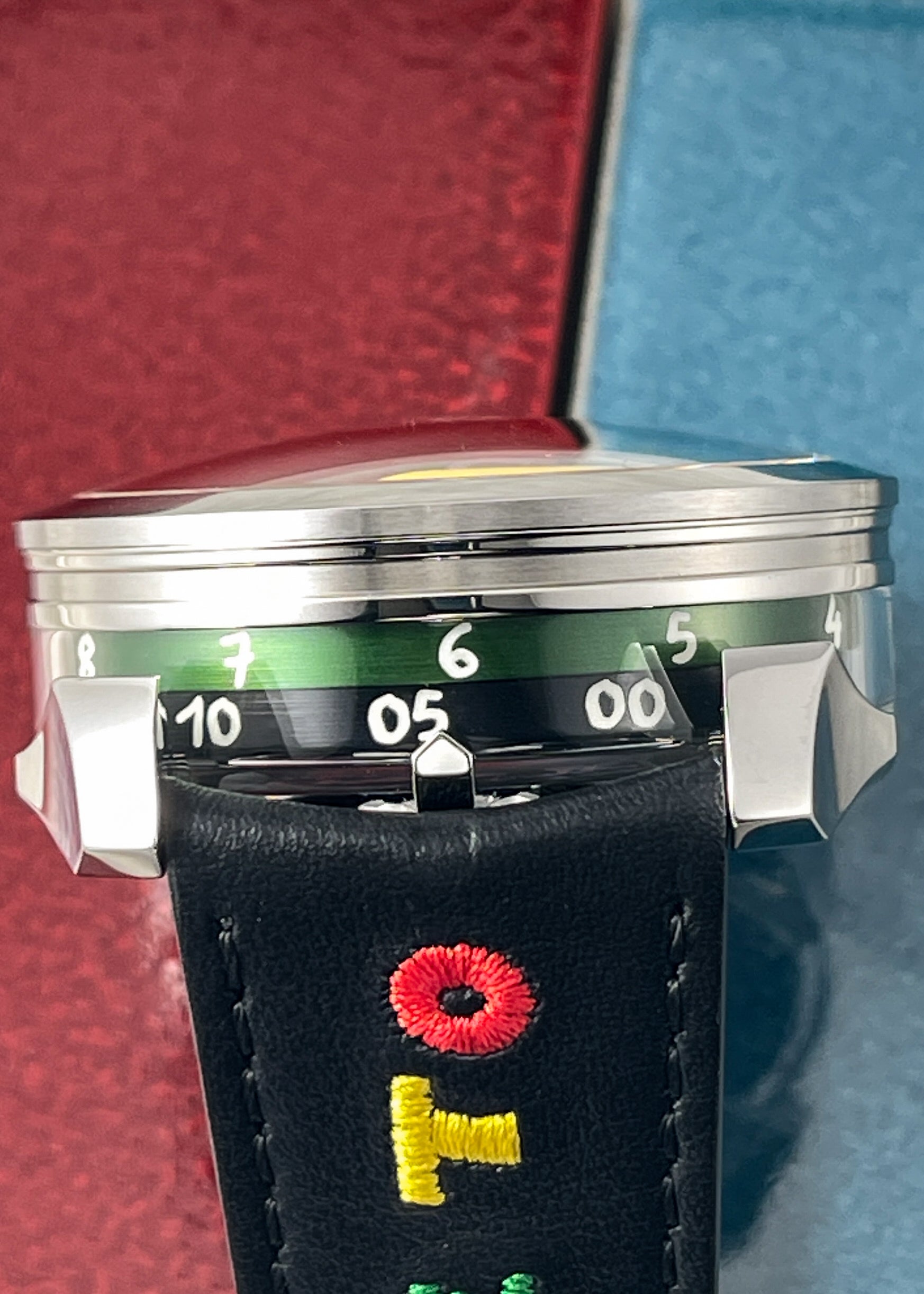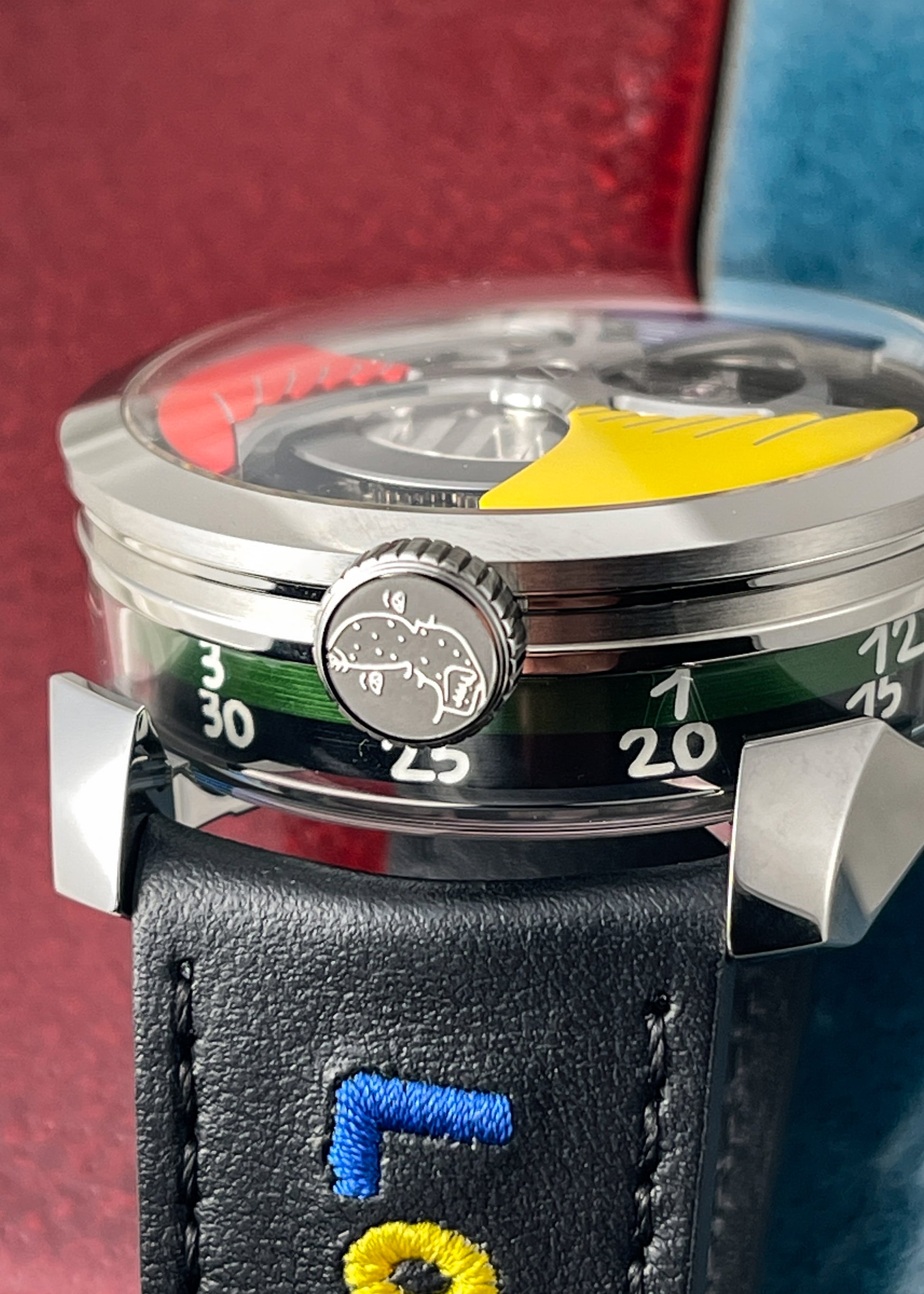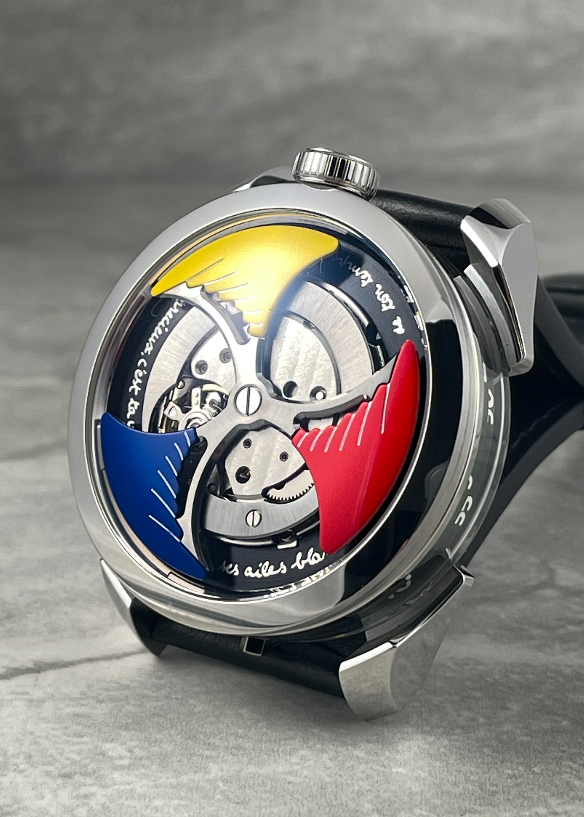 Good fun from Max Busser is this M.A.D.1 "Time to Love" with collaboration with artist Jean-Charles De Castelbajac for the most colorful M.A.D. edition to date. Time is read via two spinning discs underneath crystal of the middle case.