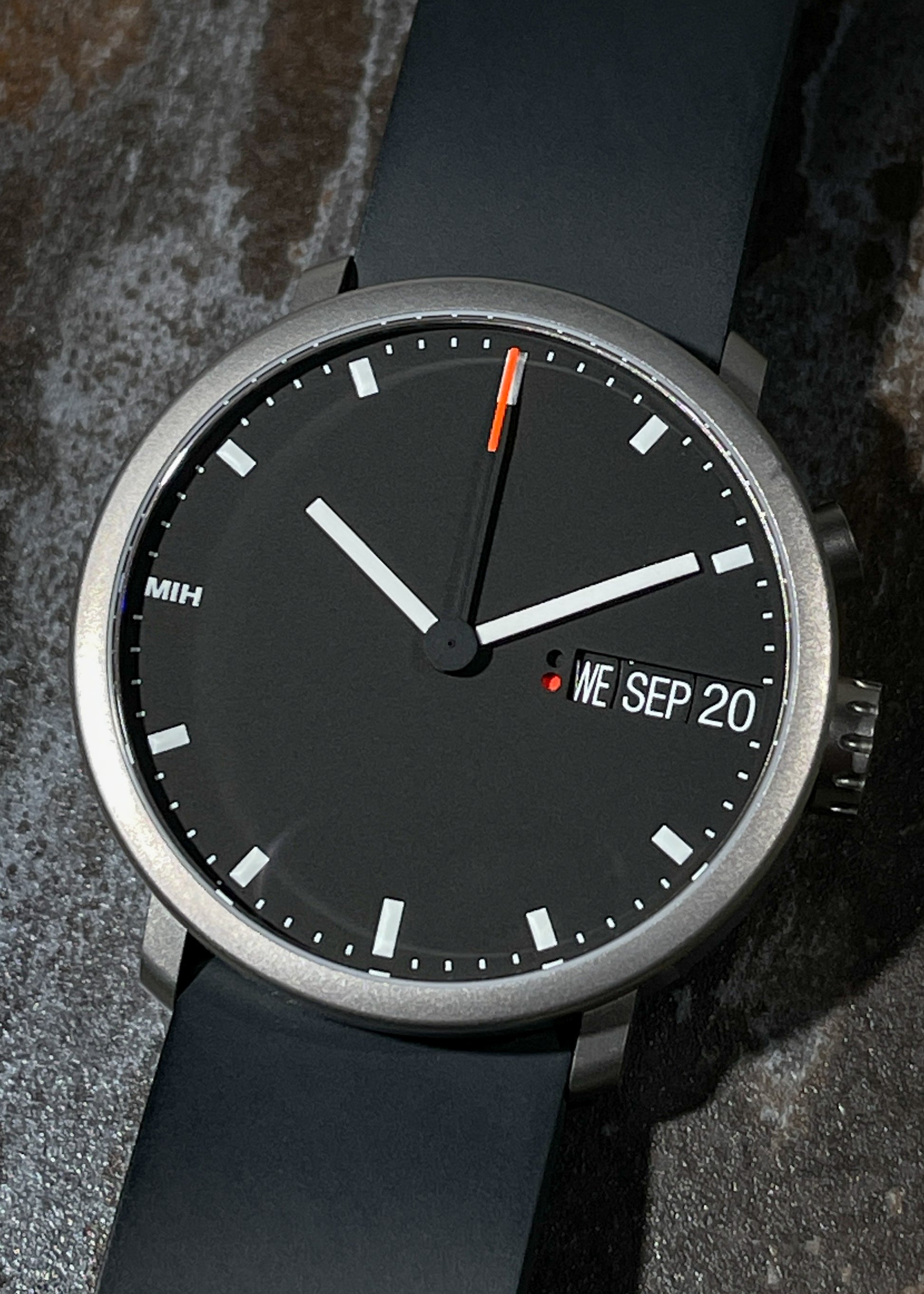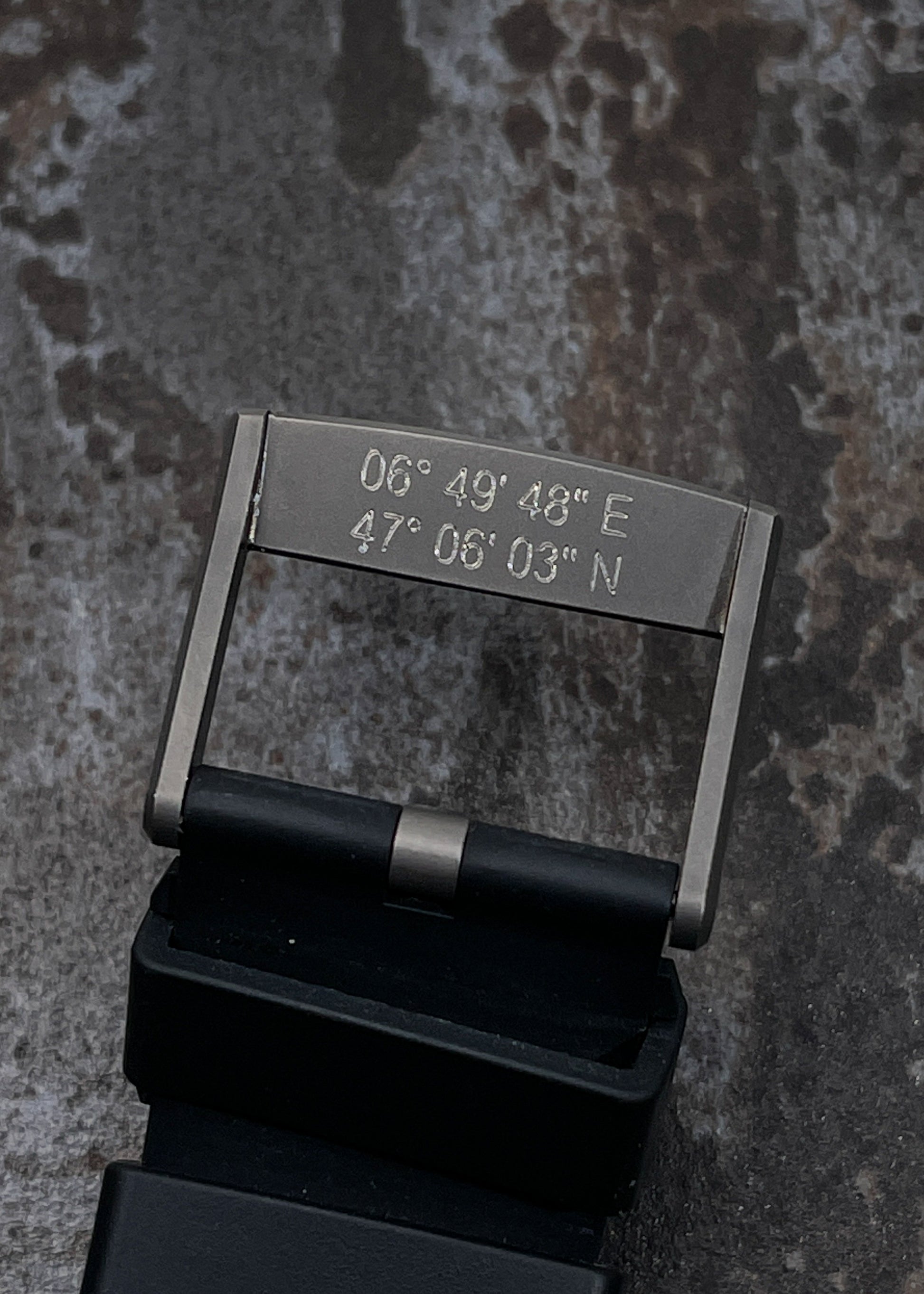 Titanium Case is in excellent condition and measures 42.2 x 14.7mm and a compact 45.5mm lug-to-lug. Fitted to original MIH rubber strap and MIH titanium buckle with geographical coordinates of MIH Museum engraved underneath. Original MIH watch catalog but without the German daily newspaper which would have served as its birth certificate.