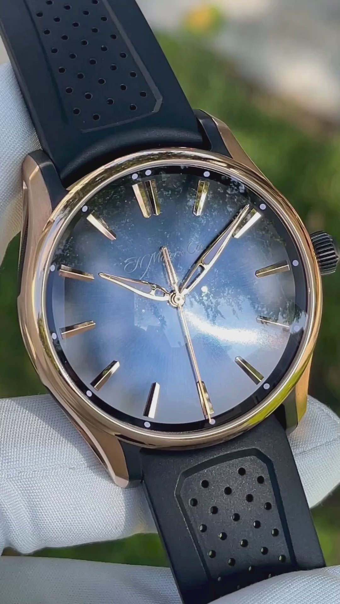 First and foremost you will notice the beautiful midnight blue fumé dial sizzles in the light, and in the dark the hands and indices are lumed. Strapped on the wrist - just like every Moser I've experienced thus far - the 18k Rose Gold and DLC-coated Titanium Case is comfy as hell, and at 120M WR they've got you covered for even the most intense snorkel sessions.
