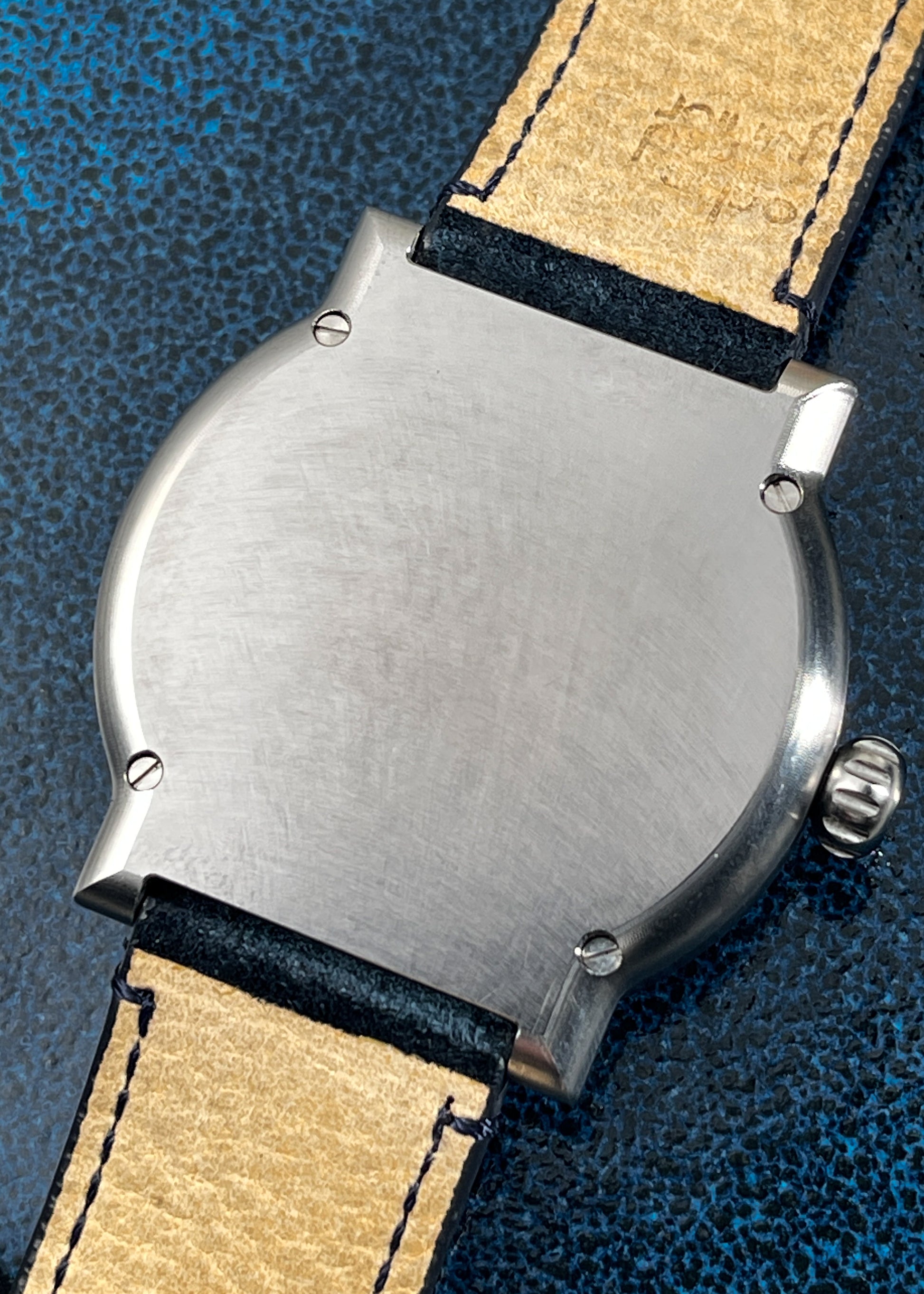 Just above the 6 o’clock marker is a seconds disk with a milled eccentric dot. This rotating disk indicates that the watch is running.