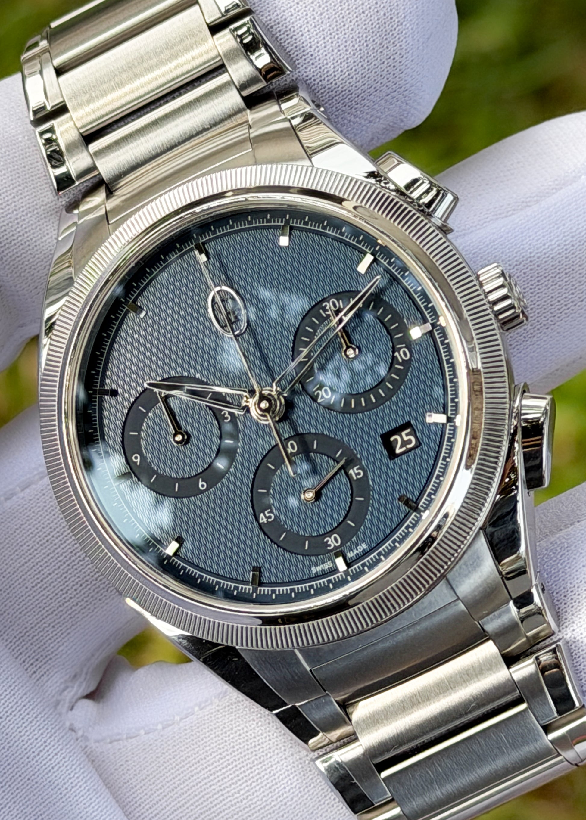Underneath the delta shaped hour and minute hands lies a Milano blue dial with barley corn pattern guilloché, complimented with white gold baton indices. The dial exhibits an excellent range of color spanning from a very deep blue to light grey depending on the lighting conditions.