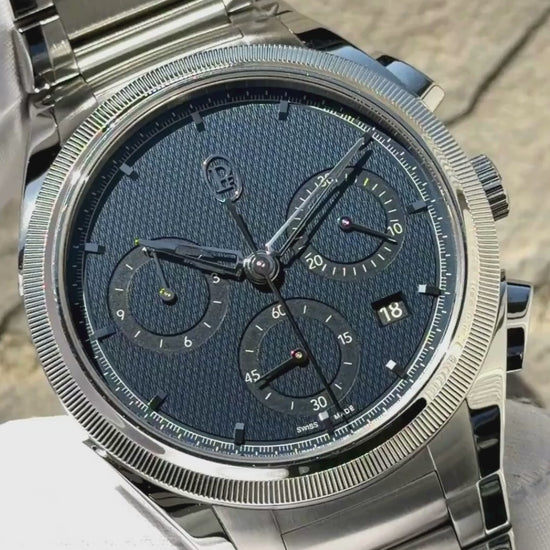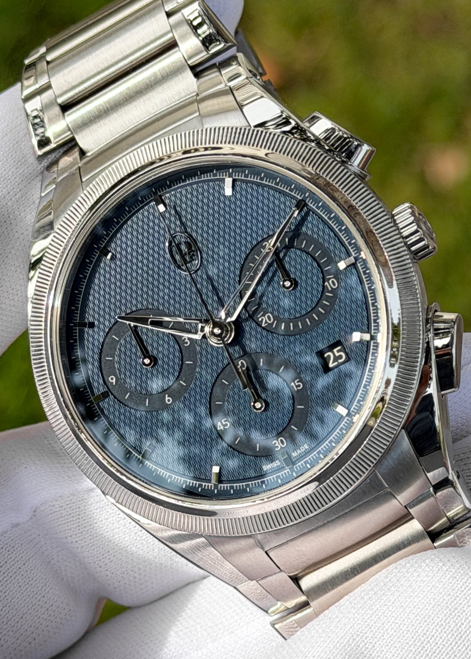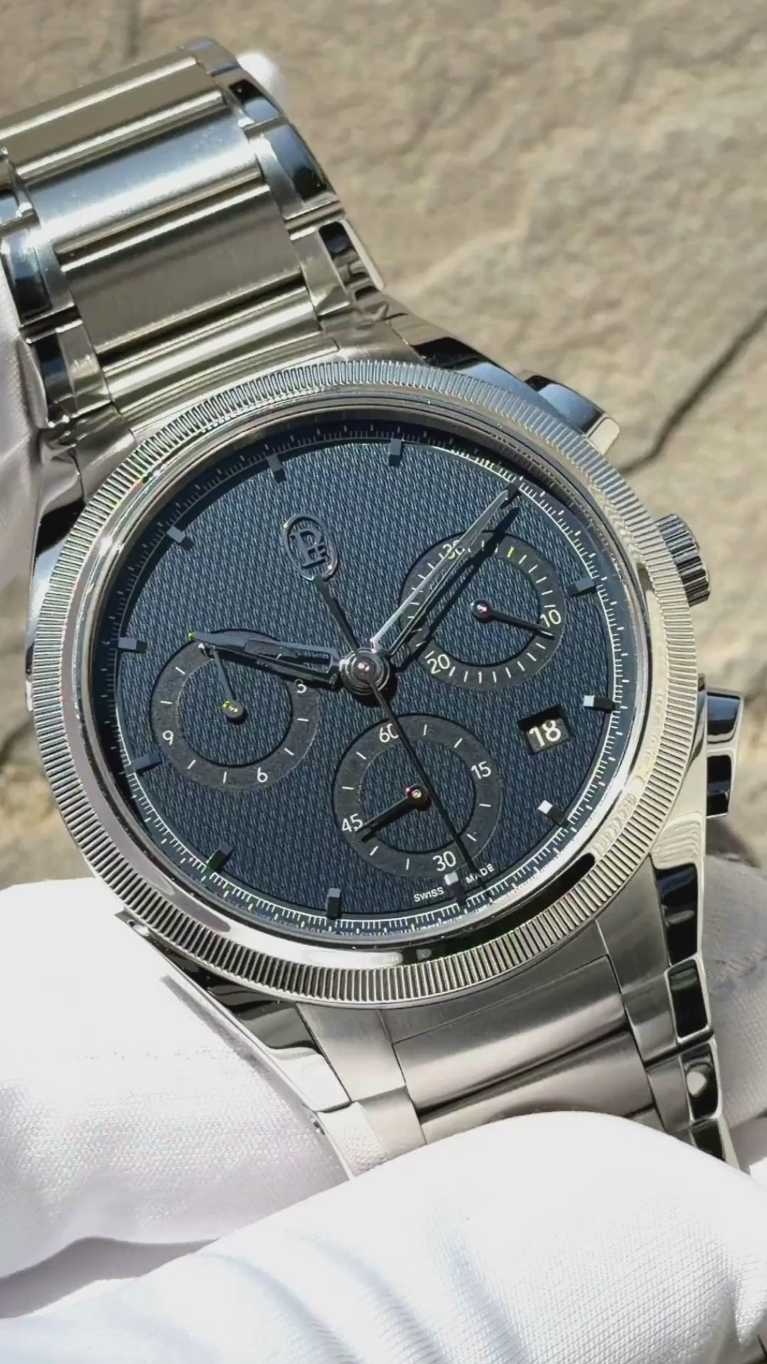 Horology By The Sea is proud to present a beautiful example of the Parmigiani Fleurier Tonda PF Chronograph. The stainless steel case is crowned by a platinum bezel which has been knurled by hand. The fit and feel of the case and bracelet on the wrist is one of the nicest watches I've experienced.