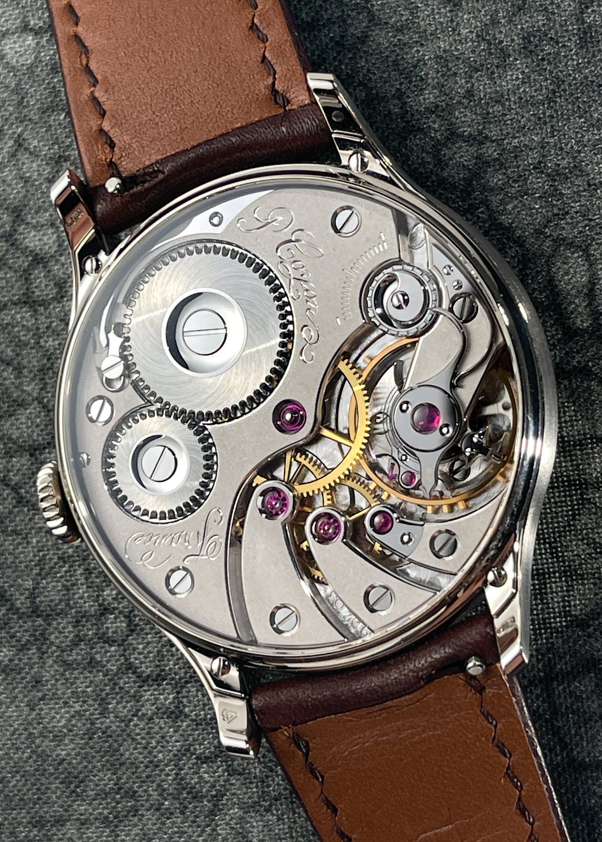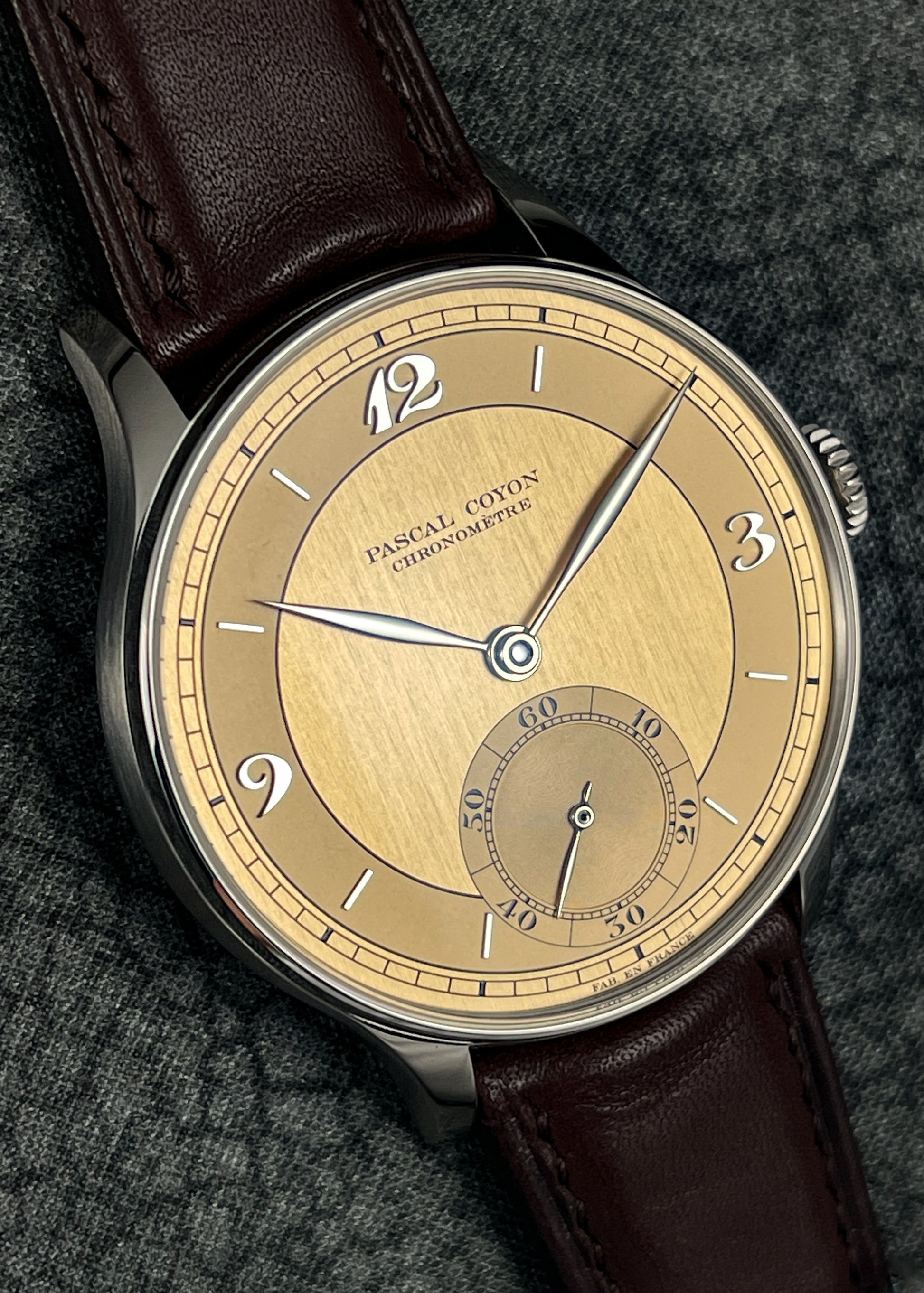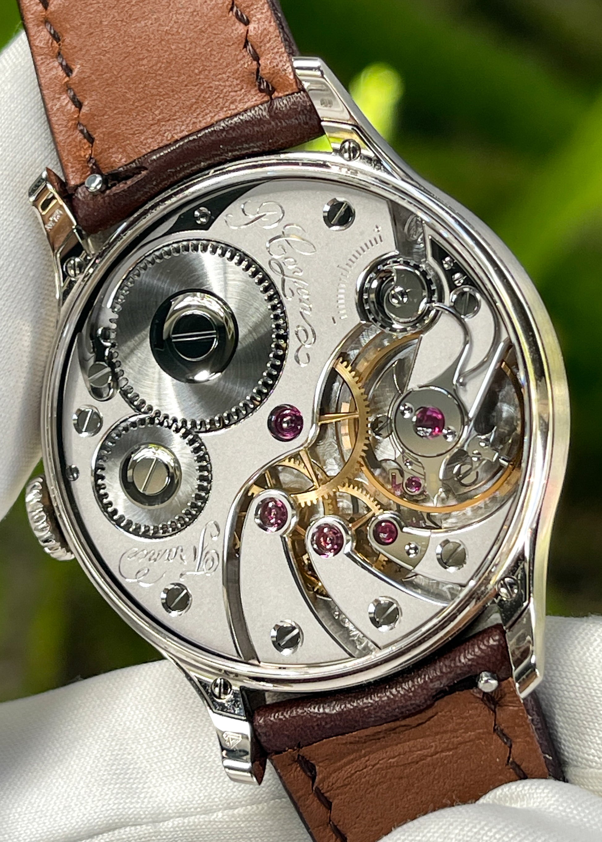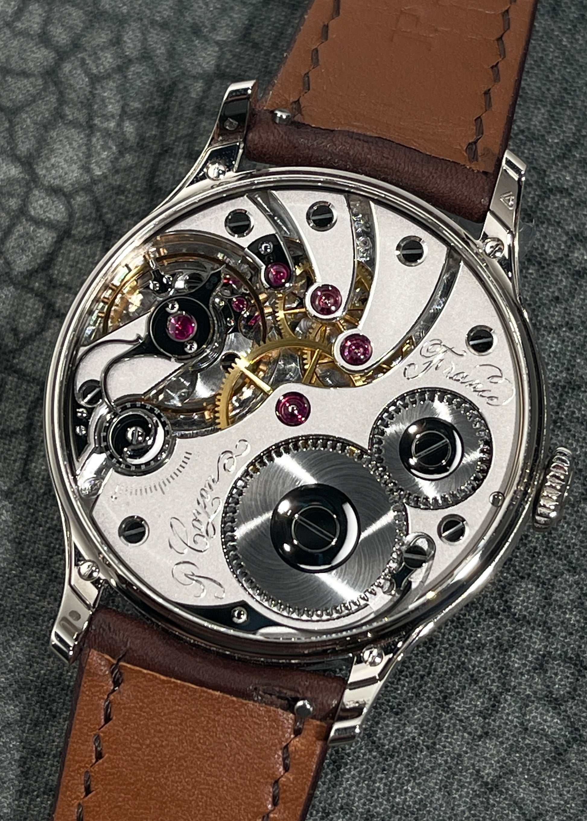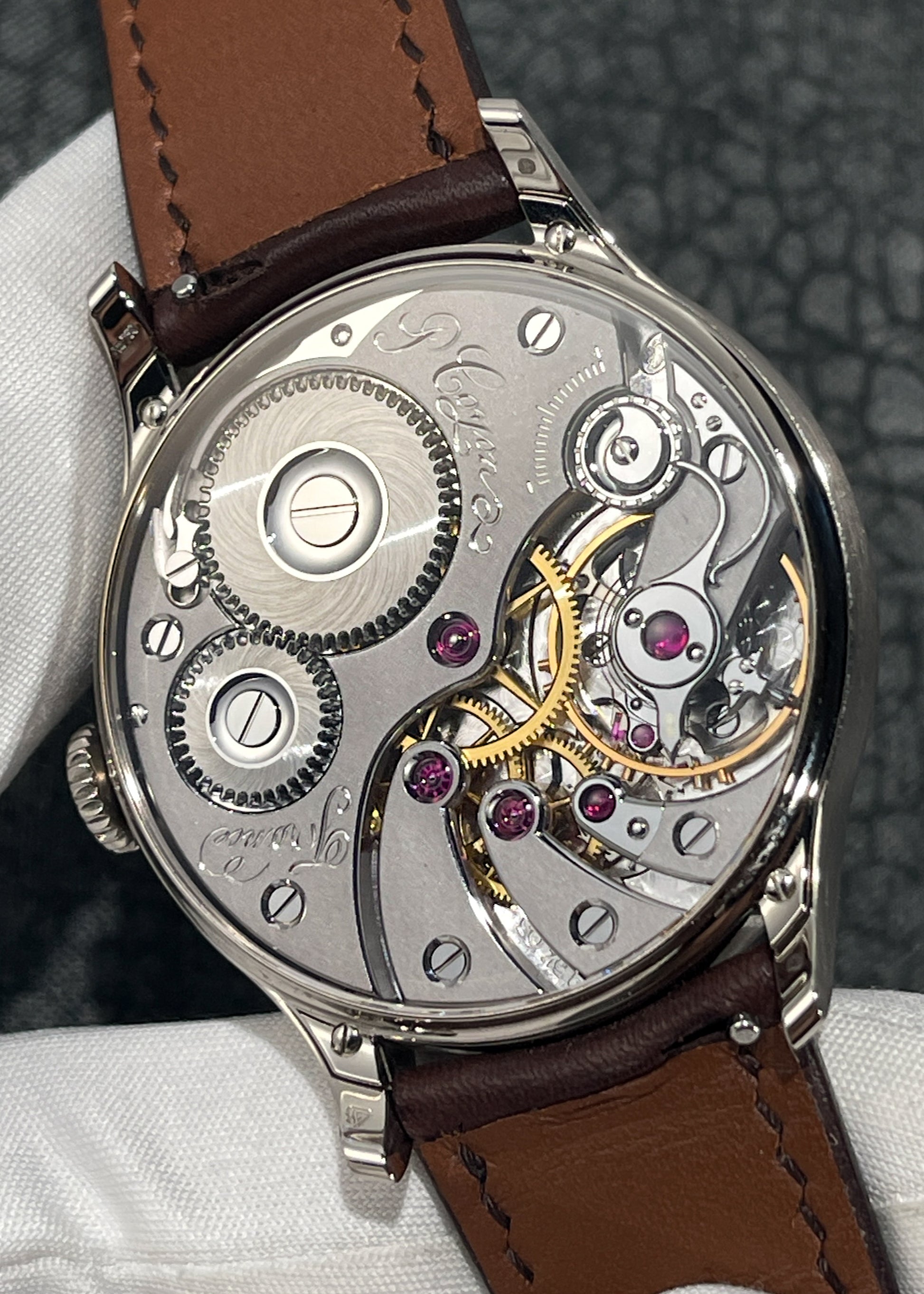 The magnificence of Pascal Coyon is on full display with this exceptionally finished limited edition of Mr. Coyon's "Series 2" for the Hong Kong market. The in-house Caliber 19 measures 16 lignes and is exhibits exemplary hand-finishing. The movement operates at an eye pleasing 2.5Hz and carries a power reserve of 40 hours. Upon completion, the movement was submitted to the Besançon Observatory where it underwent testing to achieve Chronometer certification.
