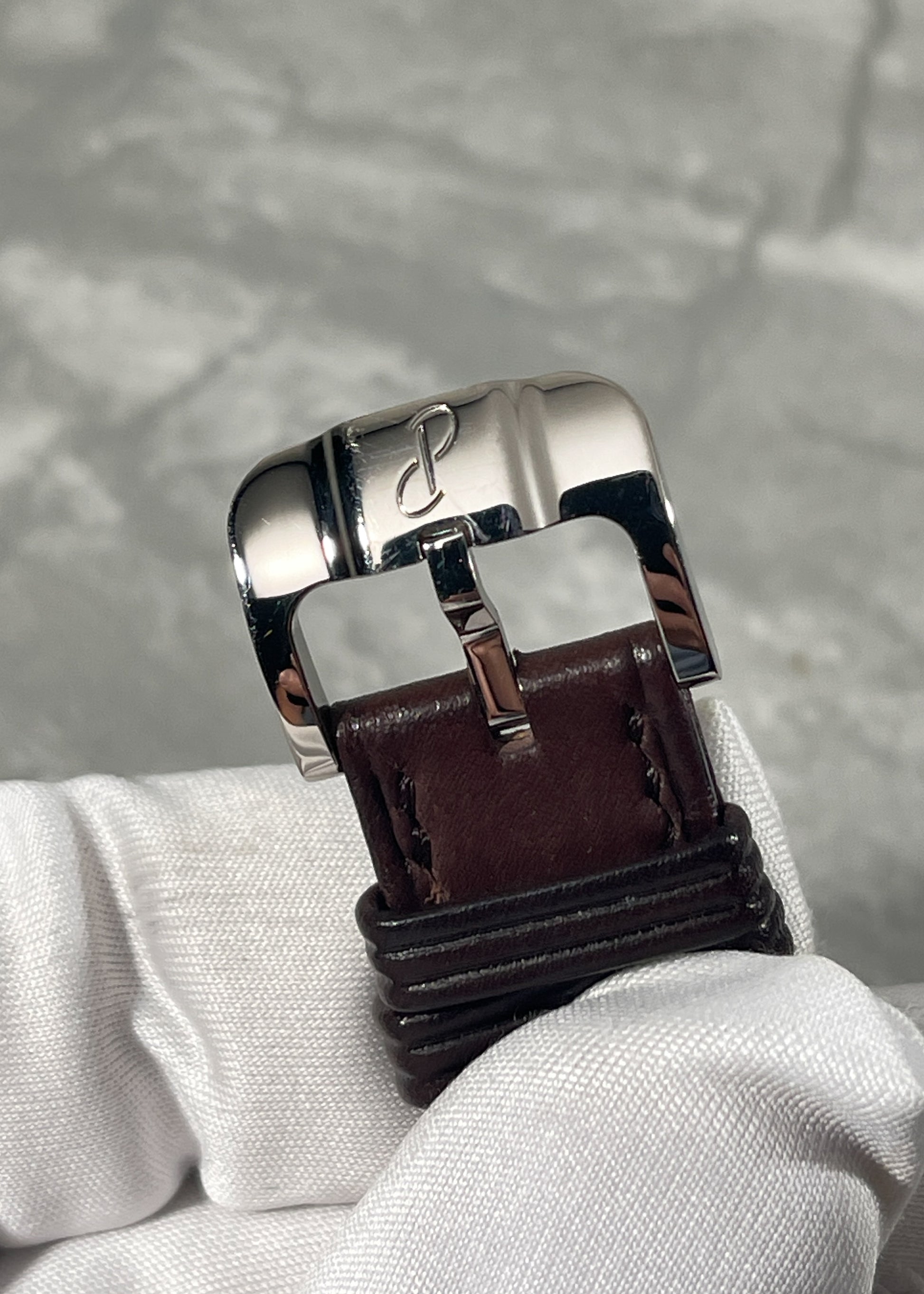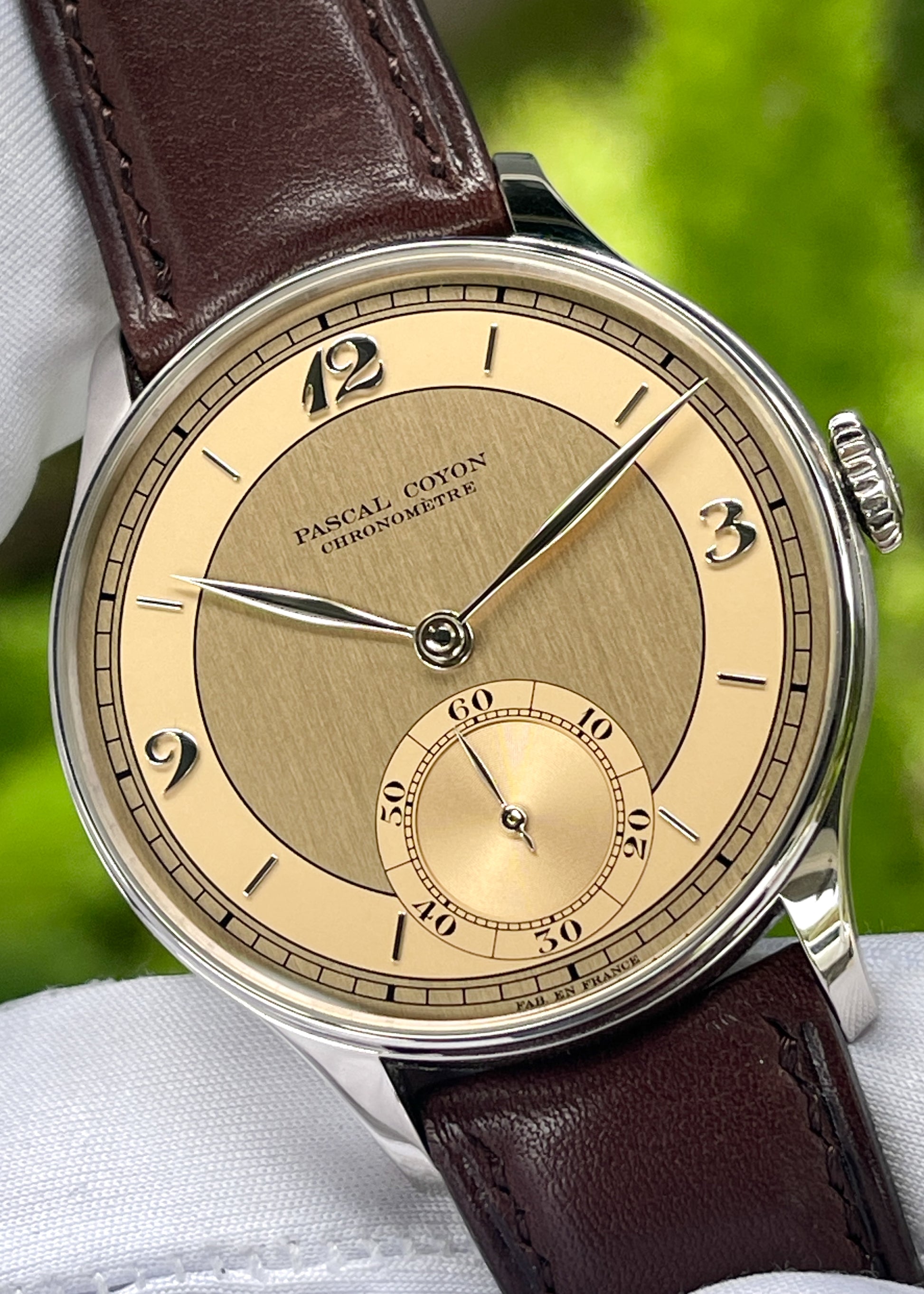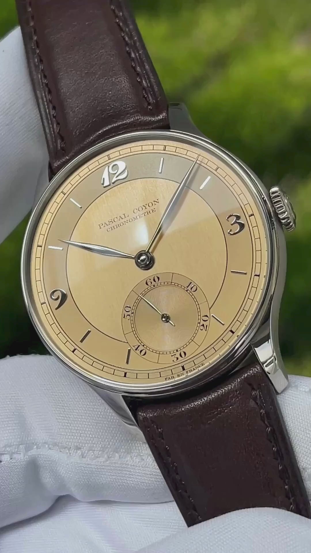Underneath the leaf shaped hands crafted in solid white gold lies a gorgeous champagne colored sector dial with Breguet numerals. Small seconds exist in the subdial located at 6 o'clock.
