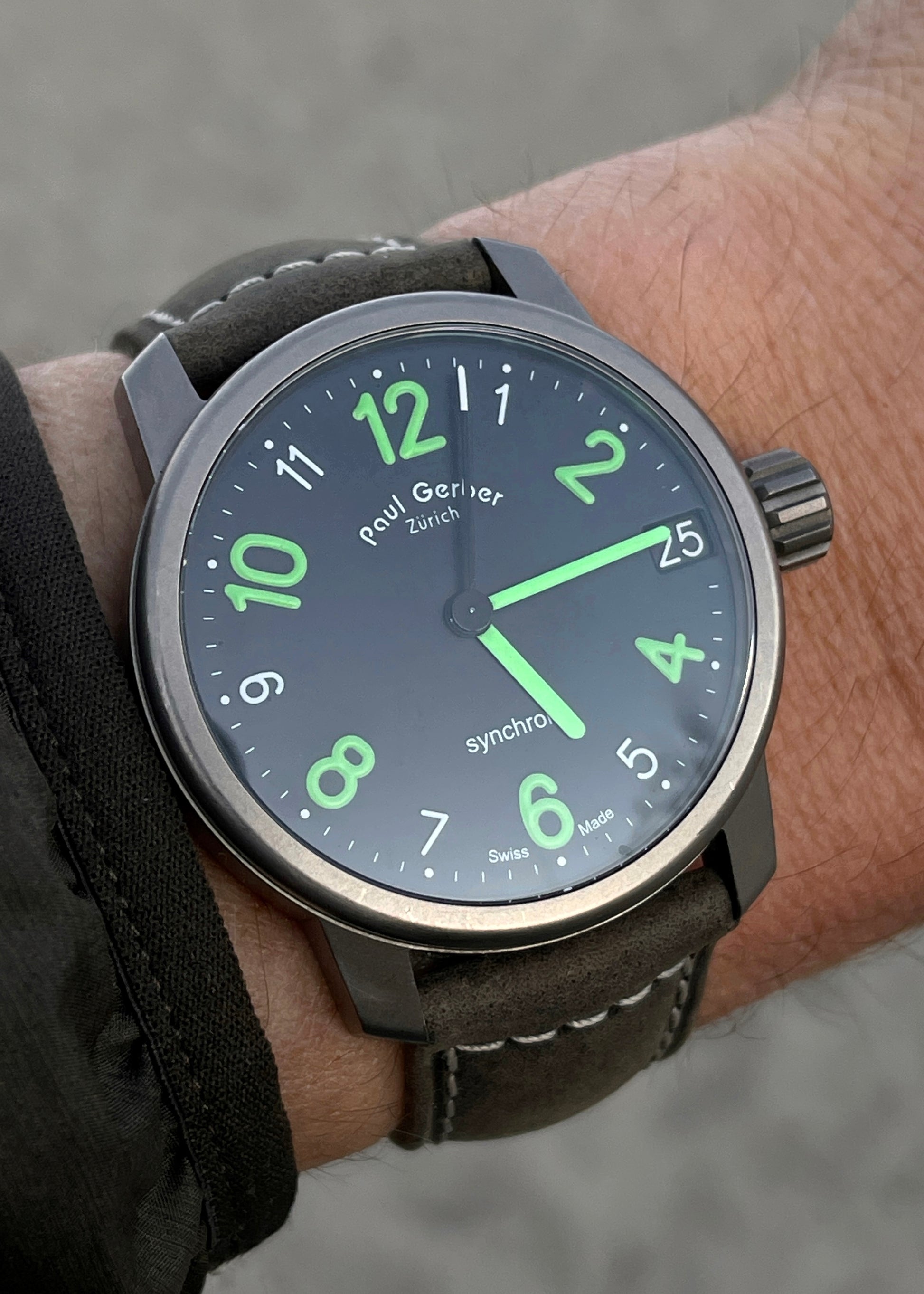 The Titanium Case measures 42mm x 12mm x 48mm lug-to-lug and is in excellent condition. Furnished with the original signed titanium Paul Gerber buckle and OEM black calfskin strap with green stitching. Complete w/ Box & Papers.