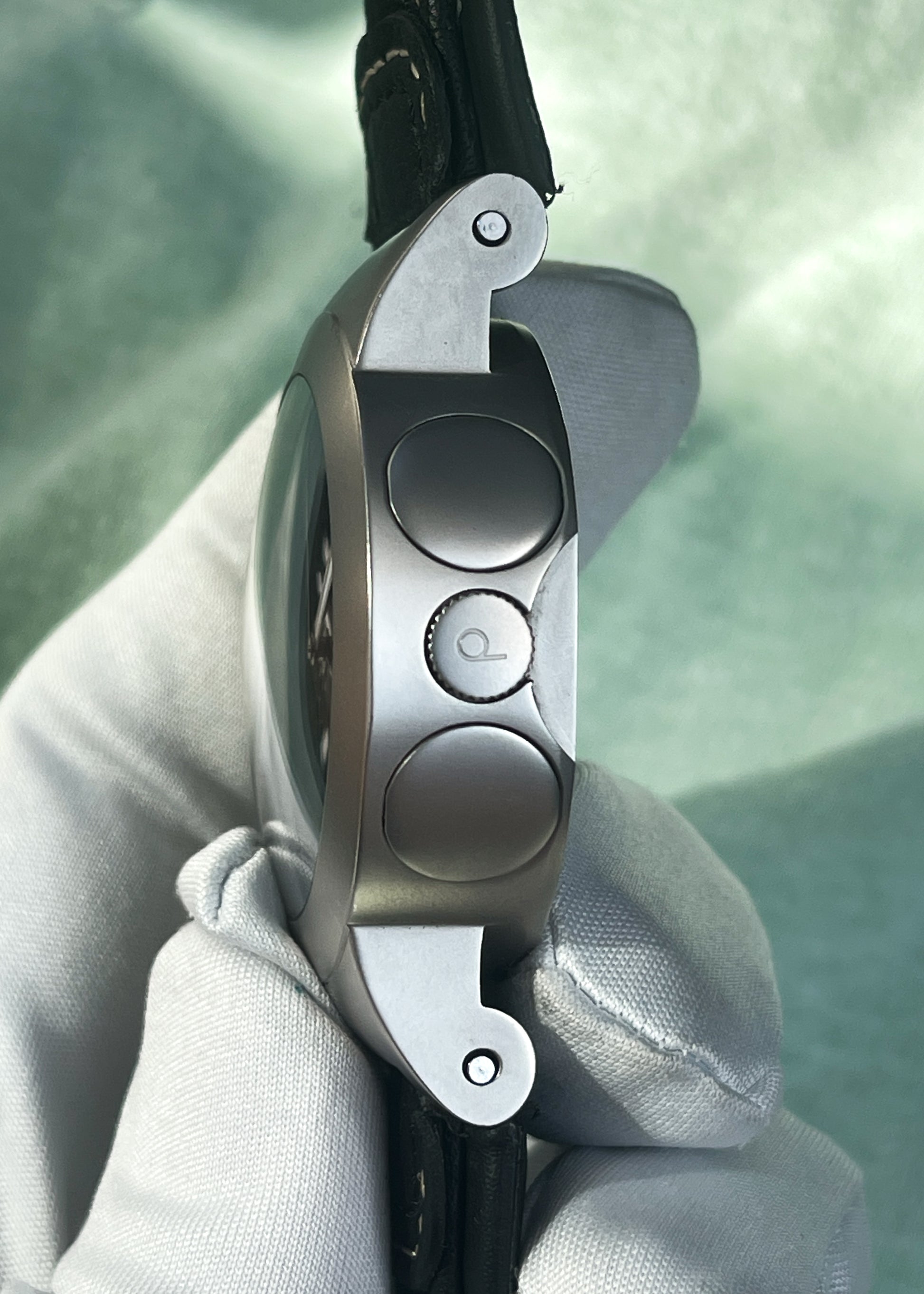 From the bench of AHCI member and legendary Independent Watchmaker Aniceto Pita is this Special Edition Chronograph w/ Day and Date complication, featuring a fascinating case design without any protrusion of the crown and chronograph pushers.