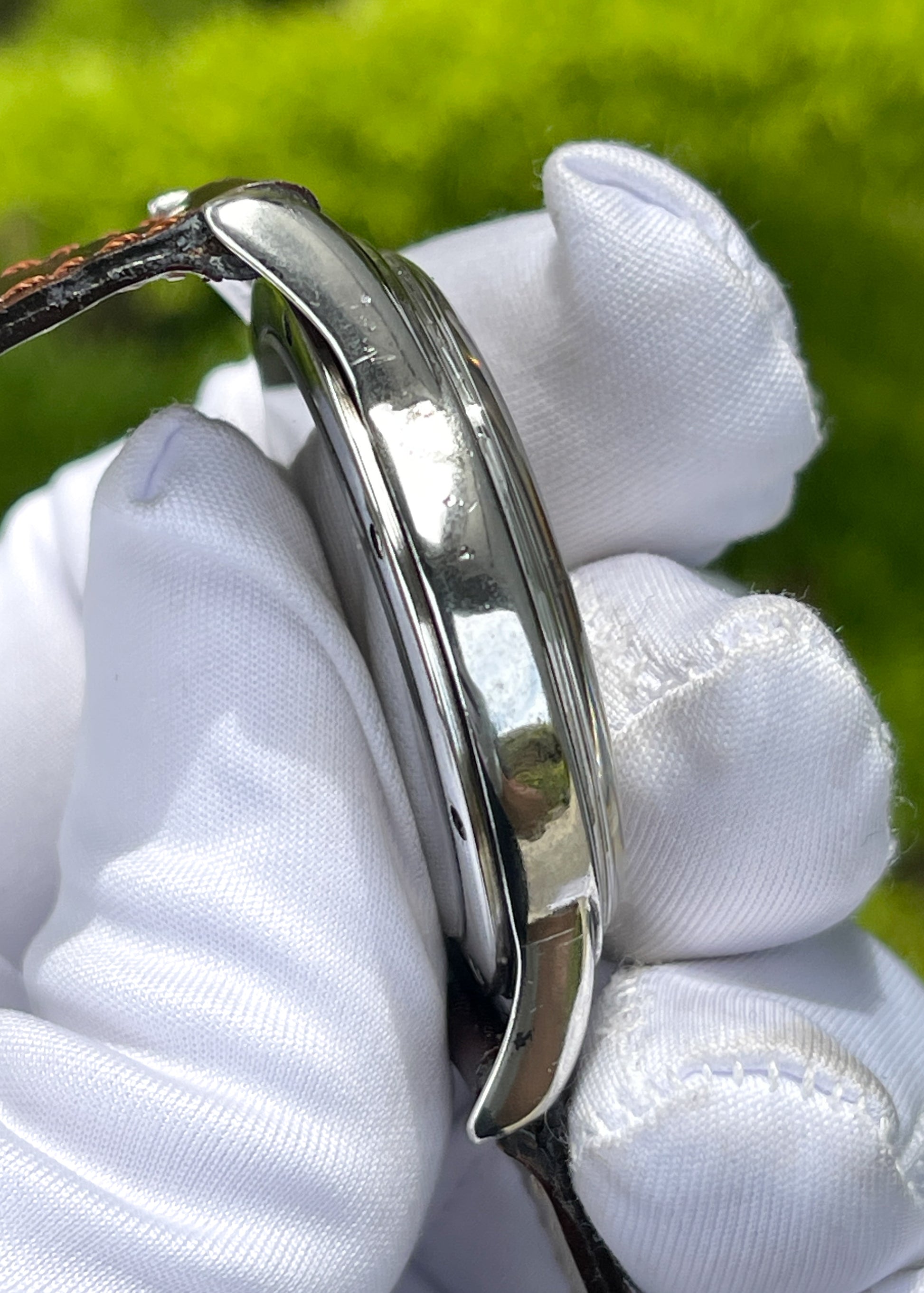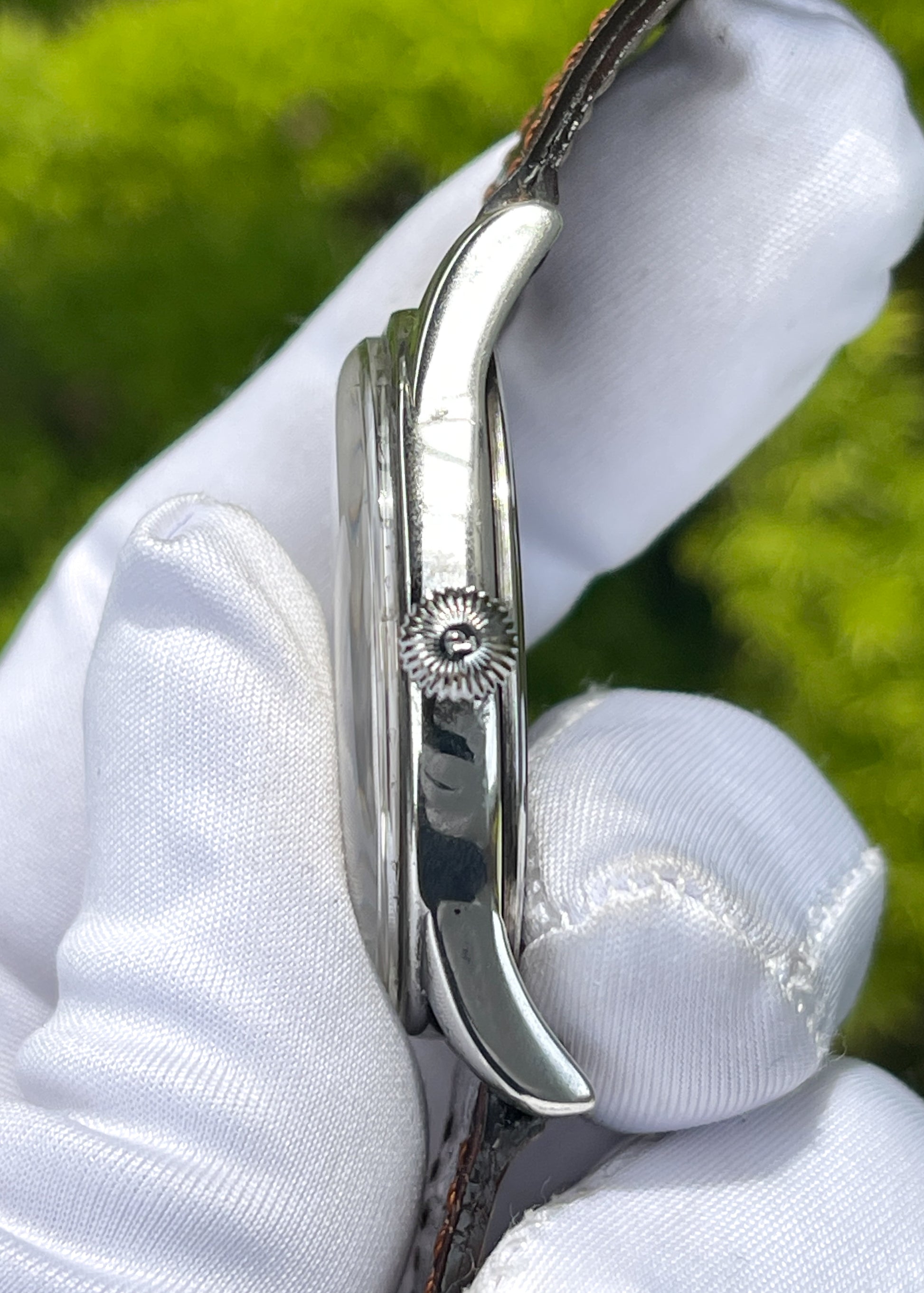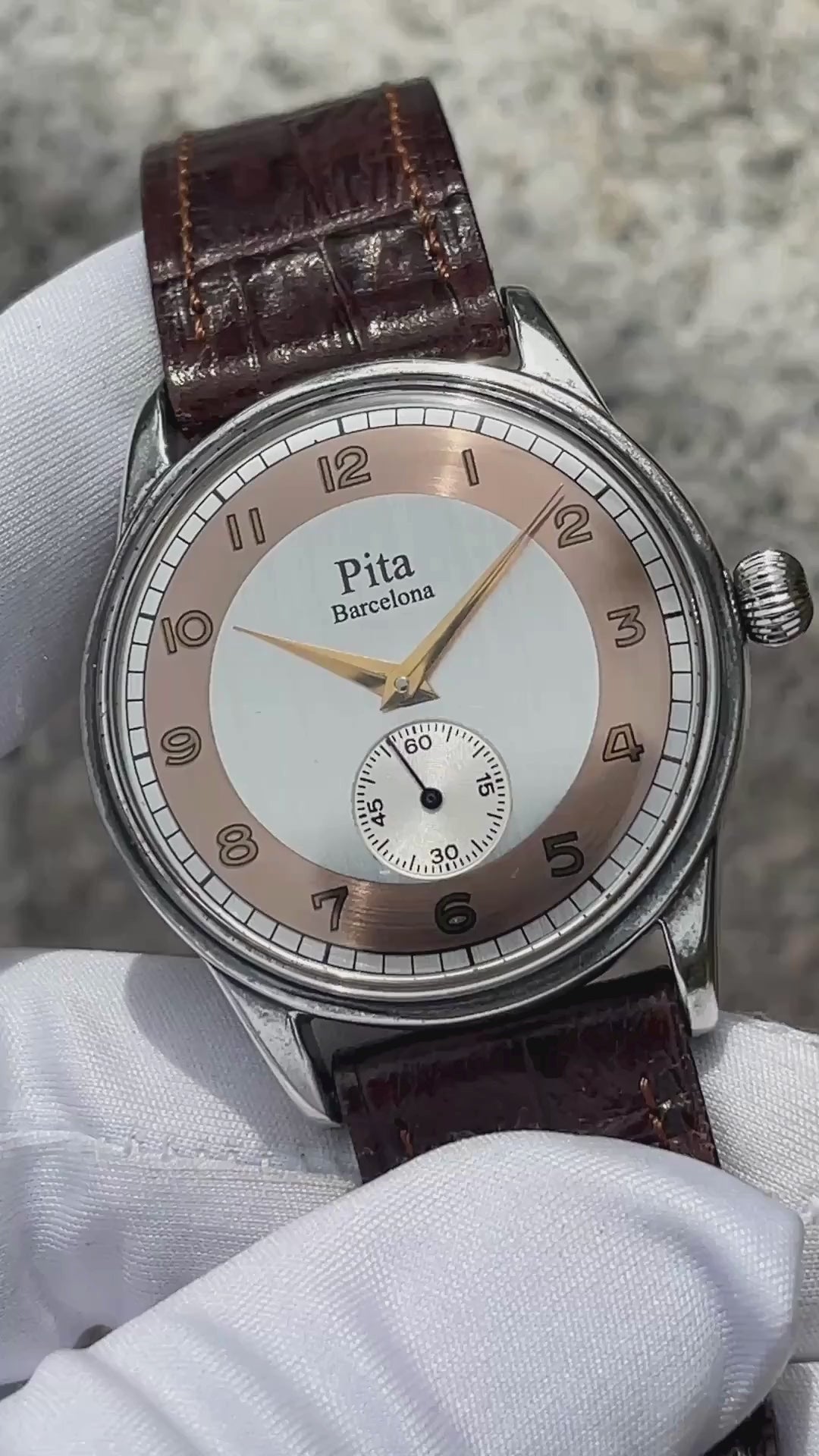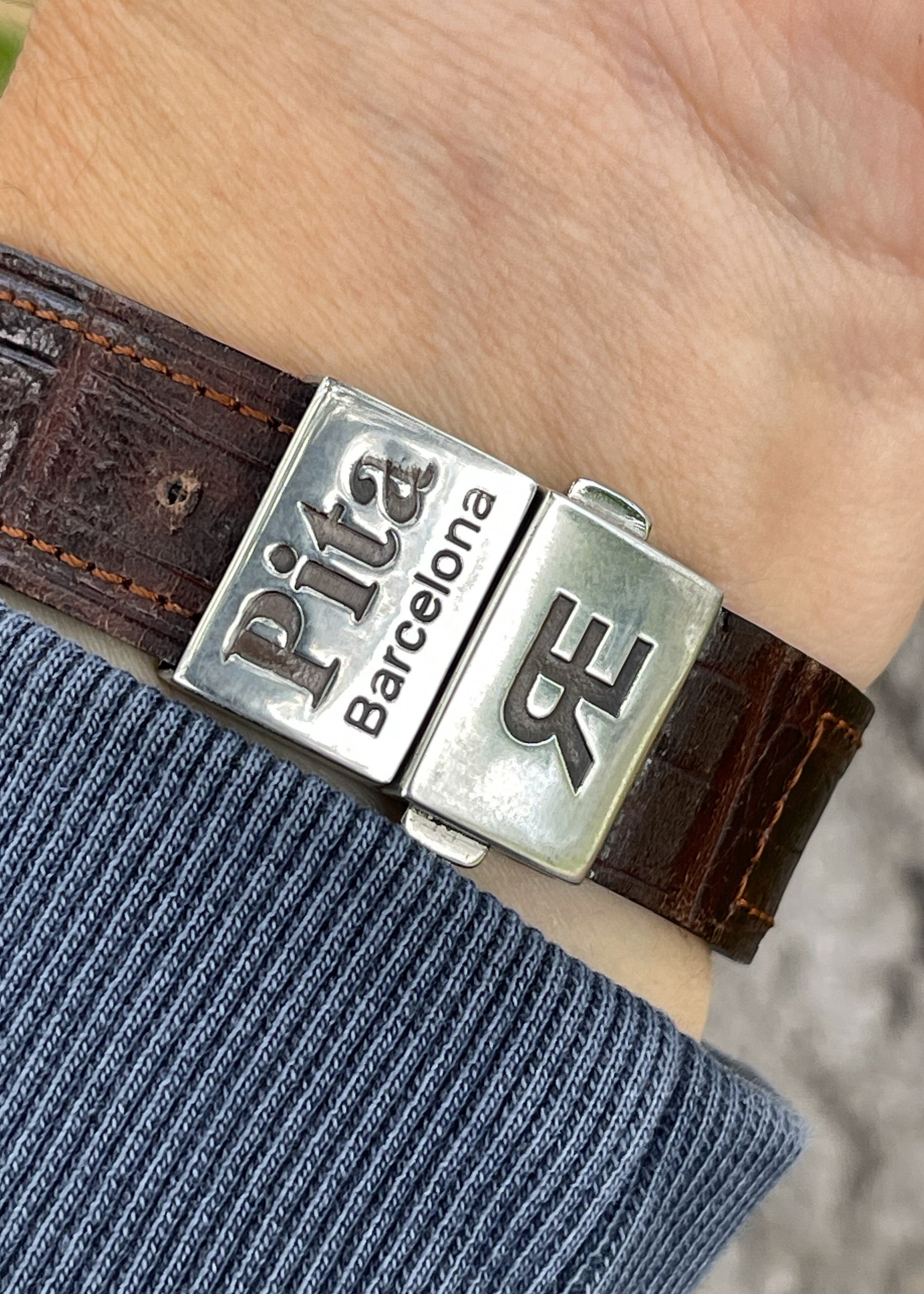 The solid .925 silver case measures 37.5mm x 8.8mm including crystal x 44.5mm lug-to-lug. Furnished with original Pita box, original alligator strap and silver two part buckle signed Pita Barcelona.