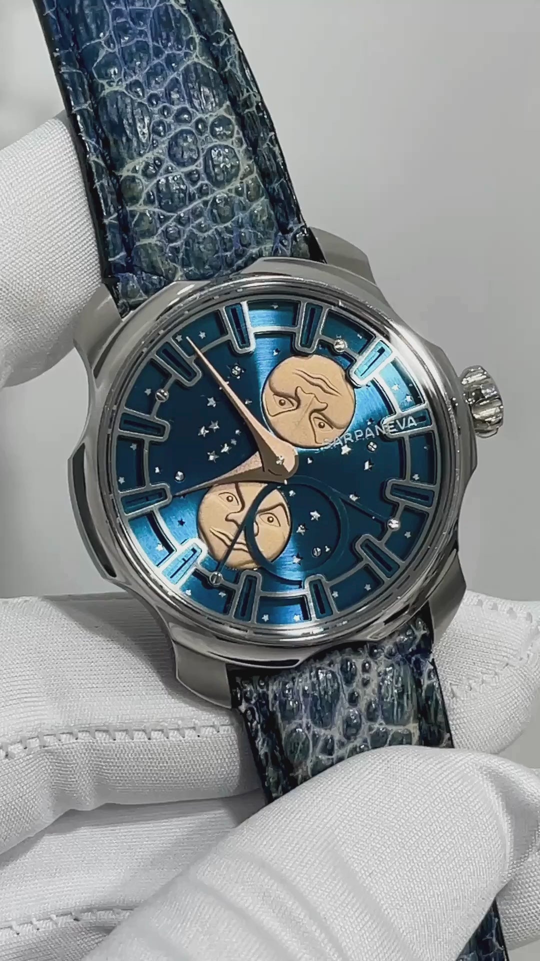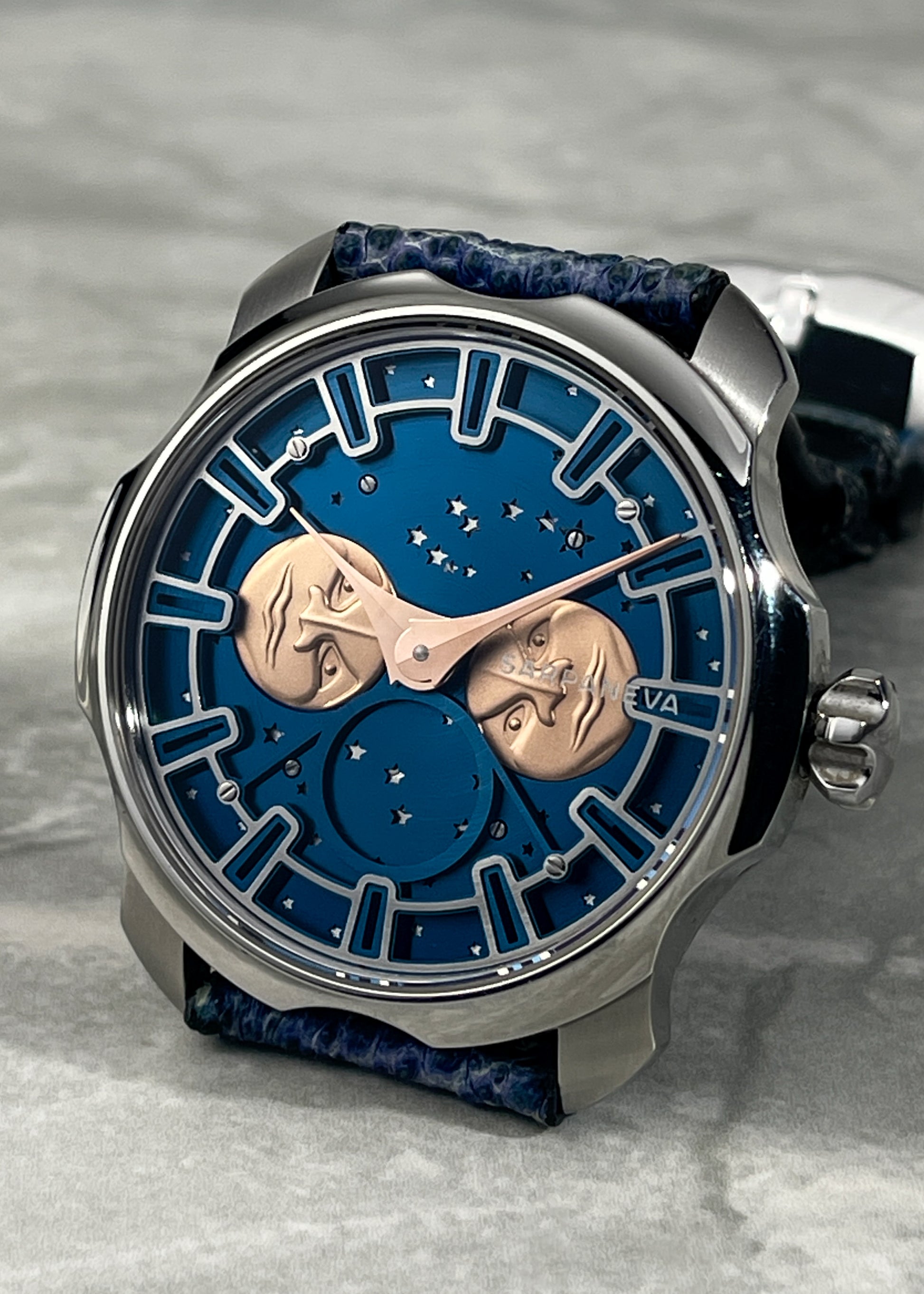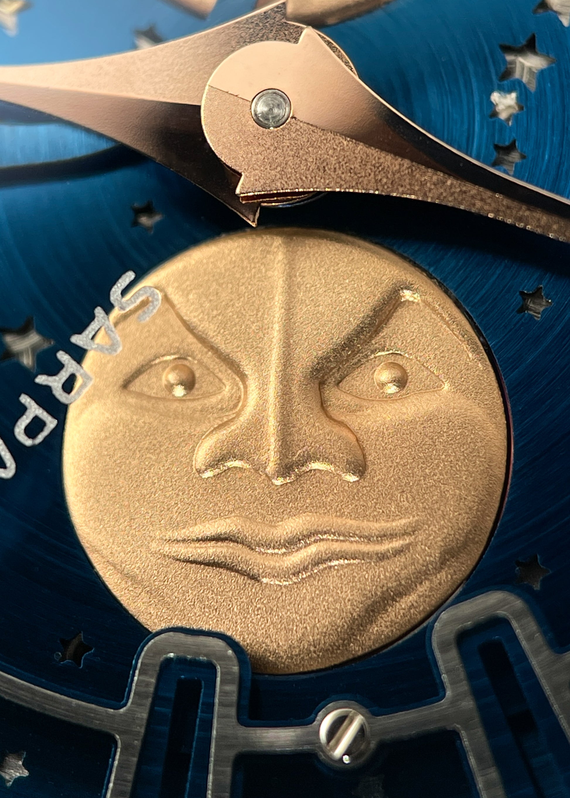 For his iconic moon phase watches, Stepan modifies the quick set calendar mechanism of the Soprod A10 caliber to work perfectly as a moon phase complication. Stepan introduces a wheel with 59 teeth (two teeth for each day of the 29.5 day cycle) in place of the date wheel which ordinarily has 31 teeth. He then takes added steps to ensure the mechanism will not break should the hands move in an anti-clockwise direction. On the reverse side we find yet another solid gold Moonface on the winding rotor with lattice pattern.