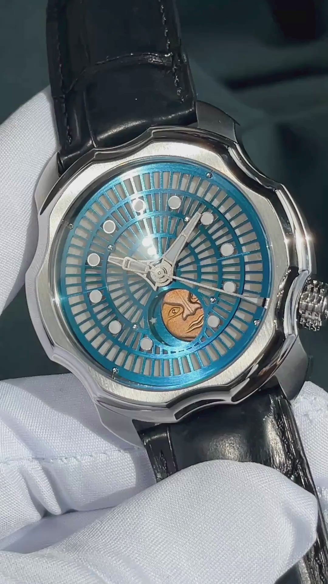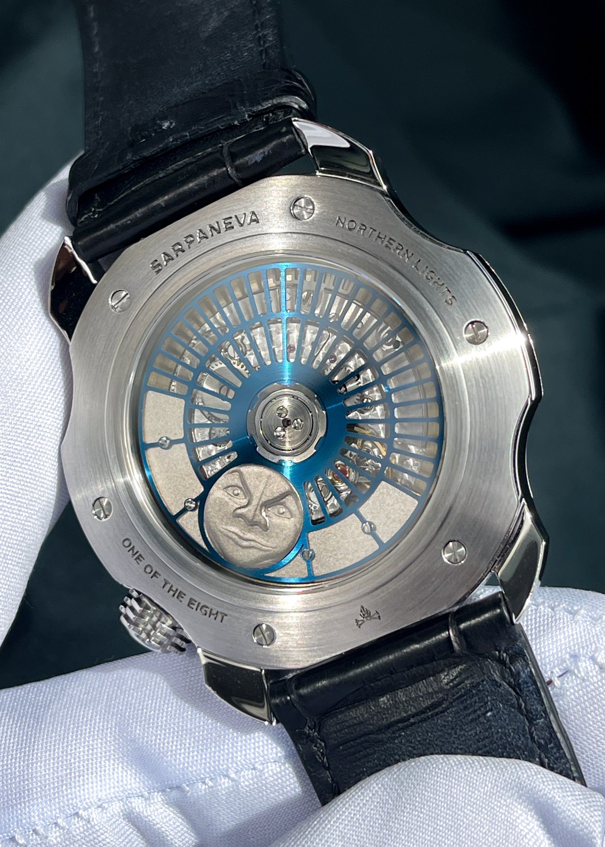 A sight to behold is this Sarpaneva Korona K0 Northern Lights special edition in stainless steel featuring a special dial created in collaboration with James Thompson of Black Badger. Underneath the recognizable Sarpaneva skeletonized blue grille lies a plate coated with Black Badger's insanely bright proprietary luminescence inspired by the Northern Lights over Finland. At 6 o’clock, an aperture reveals one of two solid gold “Moonfaces”... one Moonface crafted in 18k white gold, the other in rose gold tracking the 29.5-day lunar cycle.