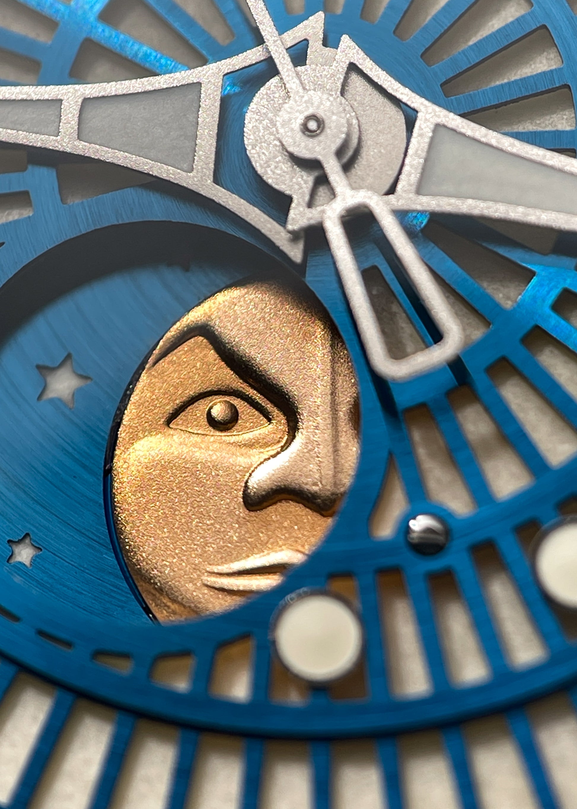 The reverse side reveals Sarpaneva's grille-style rotor mounted with 4 large and 2 small solid gold weights and yet another white gold Moonface. Underneath the rotor is the modified Soprod A10 movement which operates at 4 Hz and carries a Power Reserve of 42 hours.