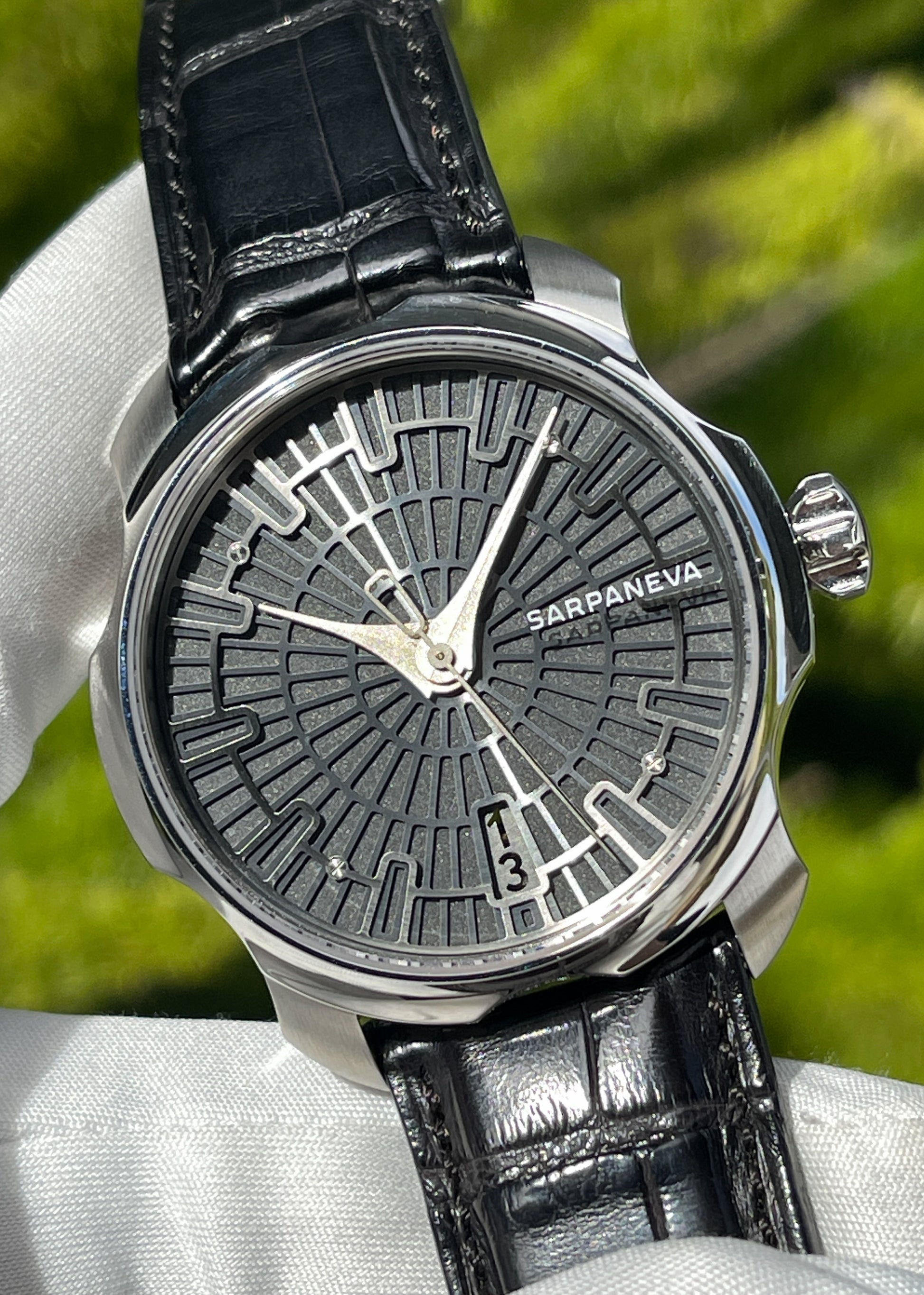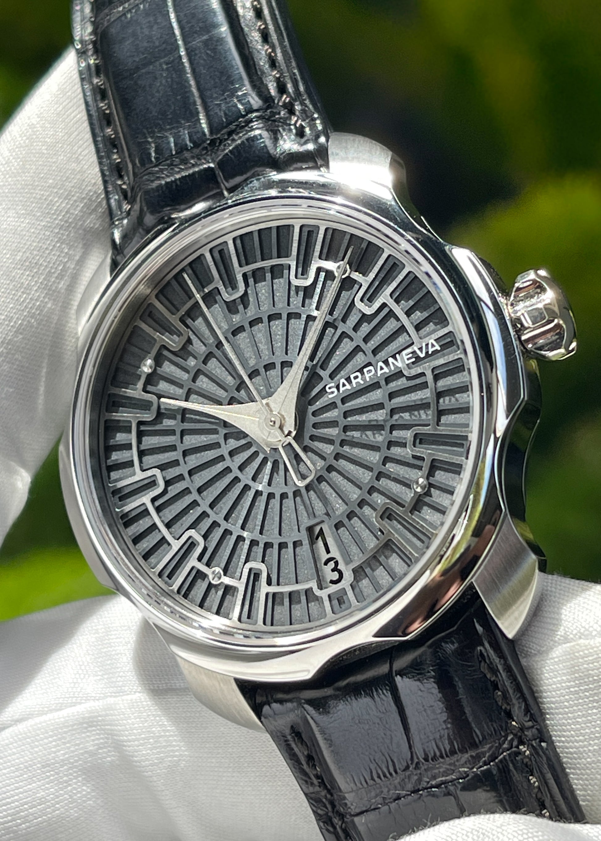 A super convincing watch from Stepan's atelier in Helsinki is this automatic winding Korona K1. The mixture of greys and silvers against the stainless steel case creates a very sophisticated look and is quite stunning to view as light reflects off the hour chapters and grill below. The date discreetly placed at 6 o'clock and is hollowed out providing a small view of the escapement. I'm a giant fan of Sarpaneva's scalloped case and bezel as well as his unique hand set.