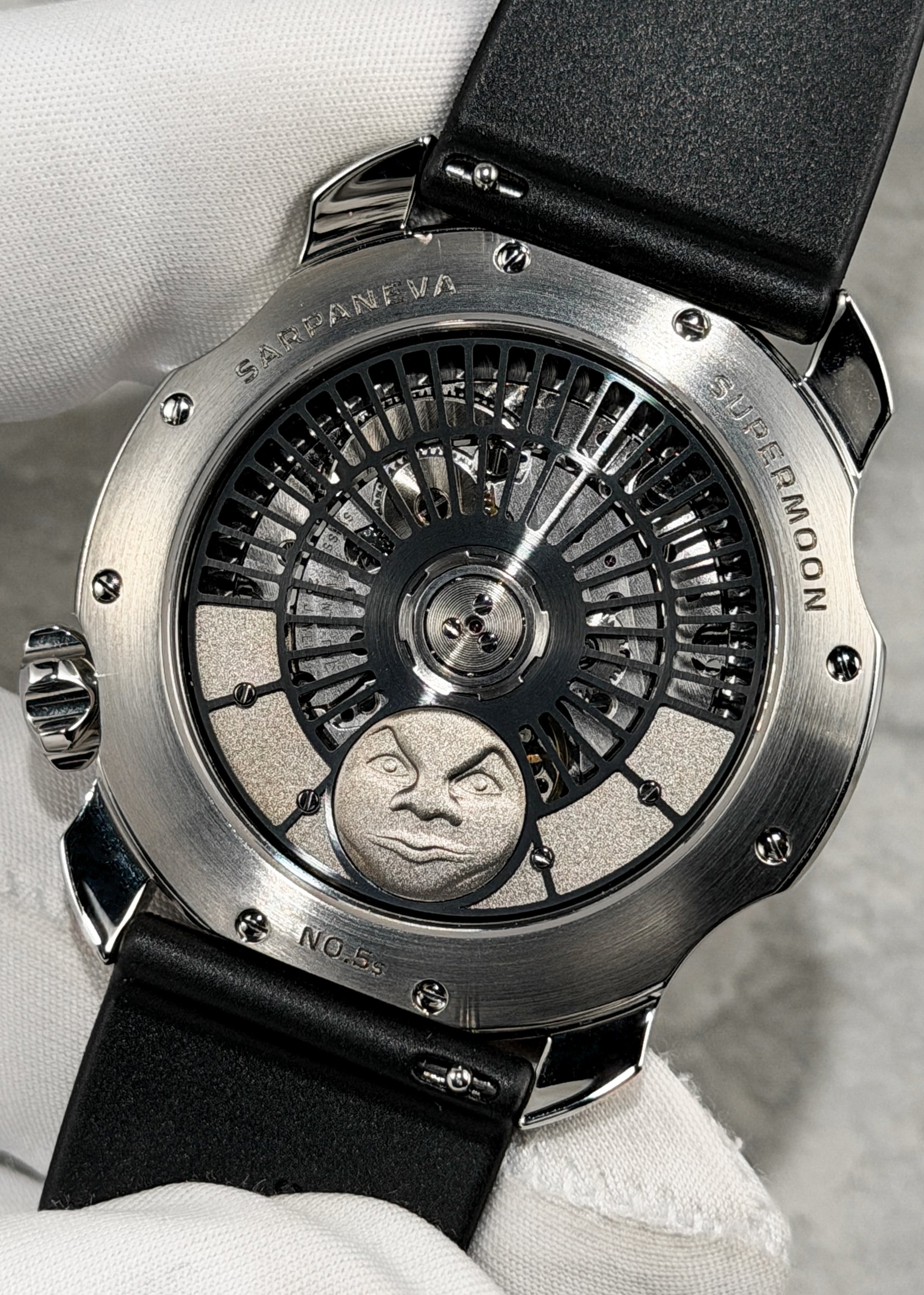 Fast forward 17 years, Stepan Sarpaneva has paid tribute to the aforementioned watch with the Supermoon Blue, measurably improving his original icon. One of the most striking enhancements is the larger solid white gold Moons, now 12 millimeters in diameter which takes center stage under the dial to pair with SARPANEVA's white gold plated hands which are frosted on one side and polished on the other for excellent legibility.
