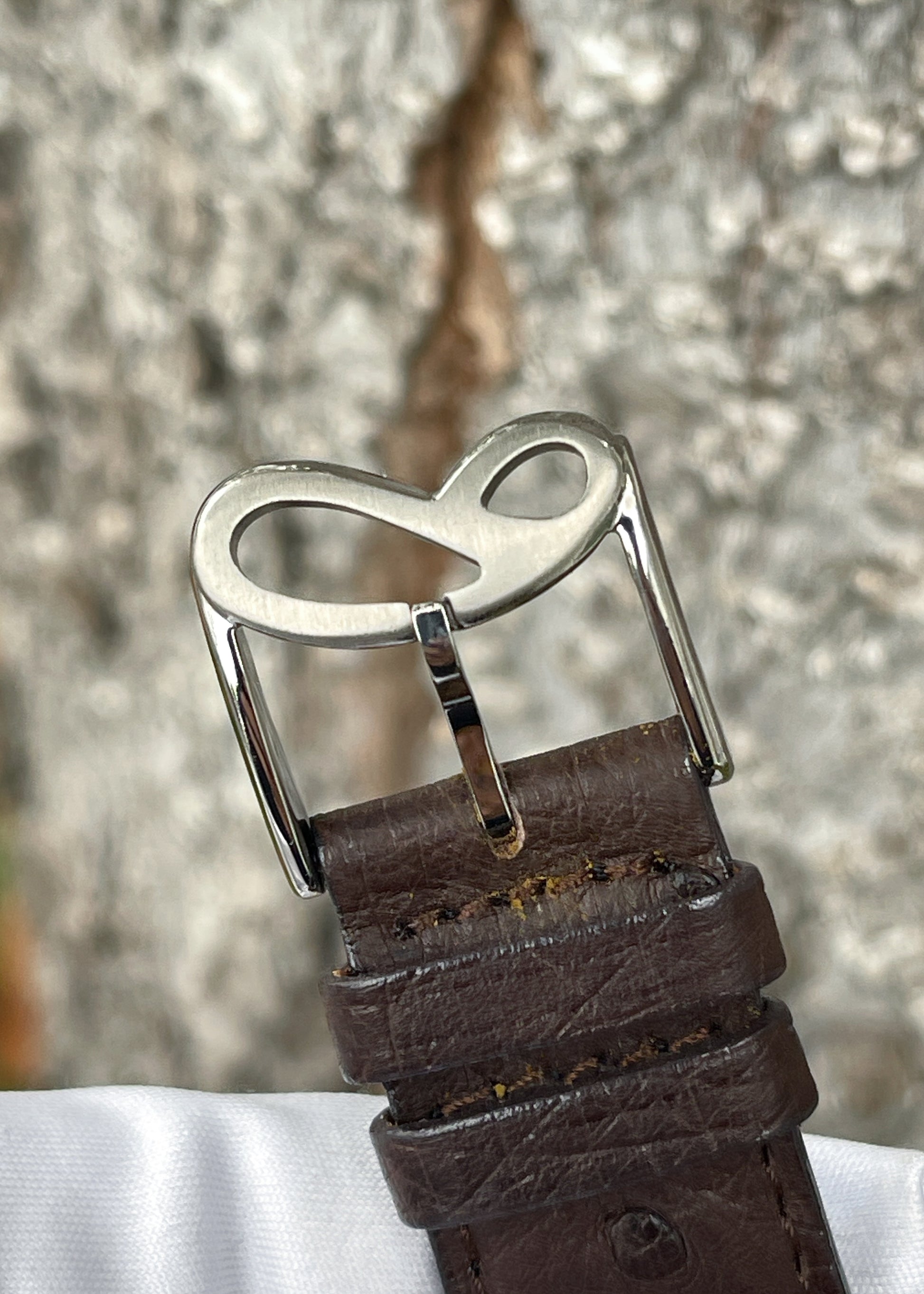 The polished Grade 5 Titanium case (an additional upgrade) measures 38.5mm x 8.5mm x 45.5mm lug-to-lug and is in excellent condition. Furnished on a dark brown ostrich strap with OEM Sartory Billard buckle. Complete with Box & Papers dated December 2023.
