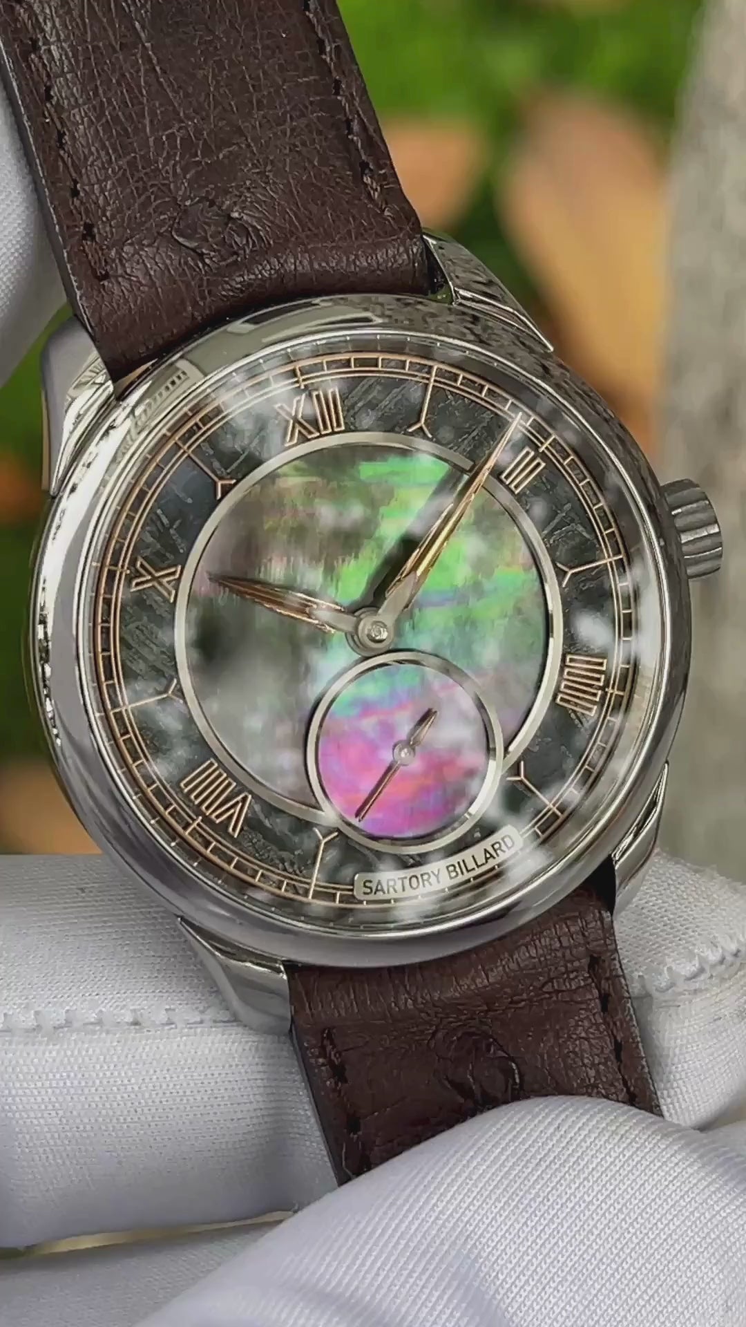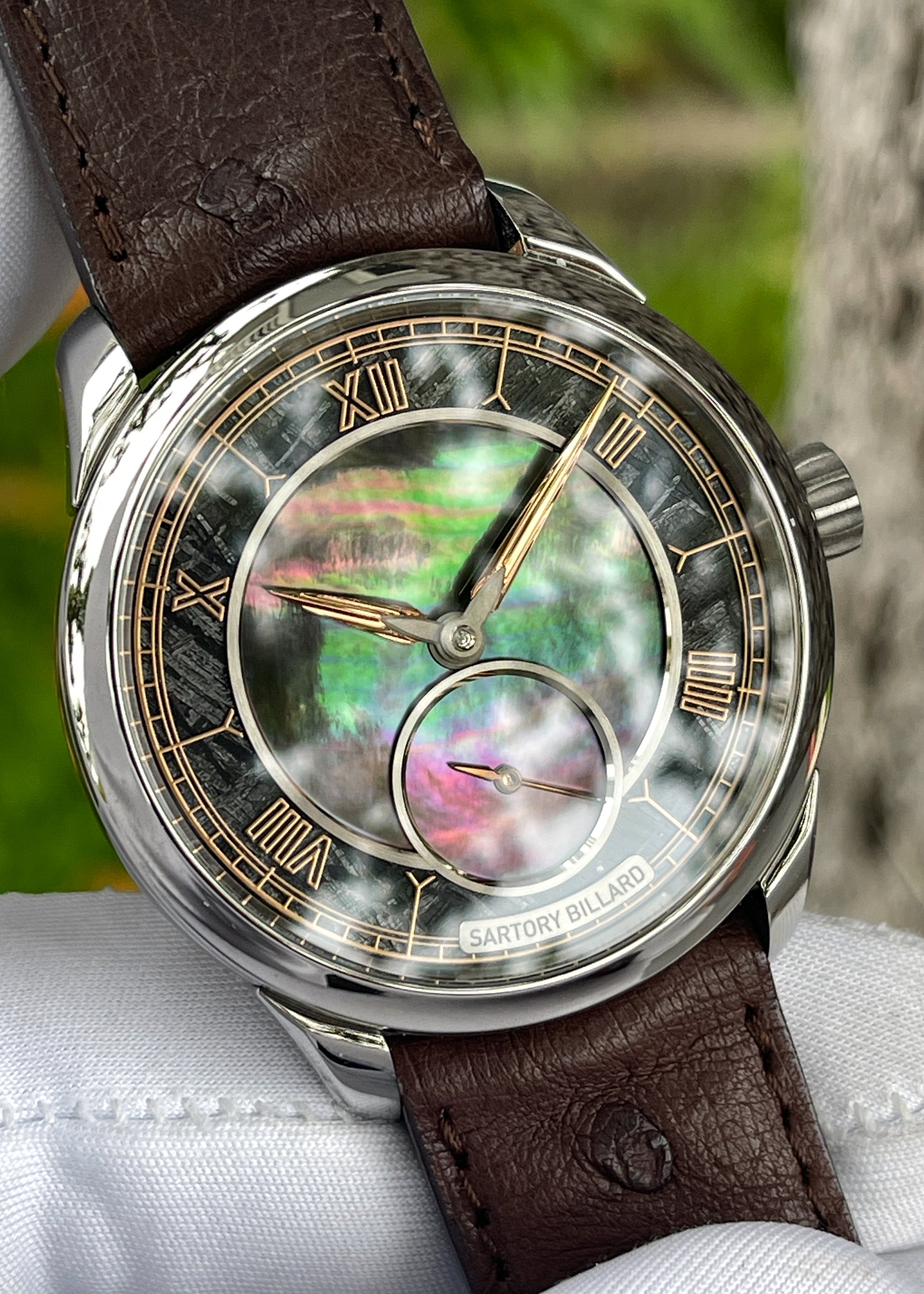 At Horology By The Sea we are thrilled to present this bespoke SB05 from the master of materials, Sartory Billard. For this special project, Armand crafted a dial featuring an intense slice of black mother-of-pearl flanked with stunning black meteorite. Elevated over the black meteorite lies rose gold Roman numerals pad-printed on a sapphire disk for a floating, ethereal effect. My kudos to Armand for his unique and immediately recognizable hands. Bead-blasted bases with fluted spines connect to spear shapes of rose gold for a highly sculptural aesthetic.