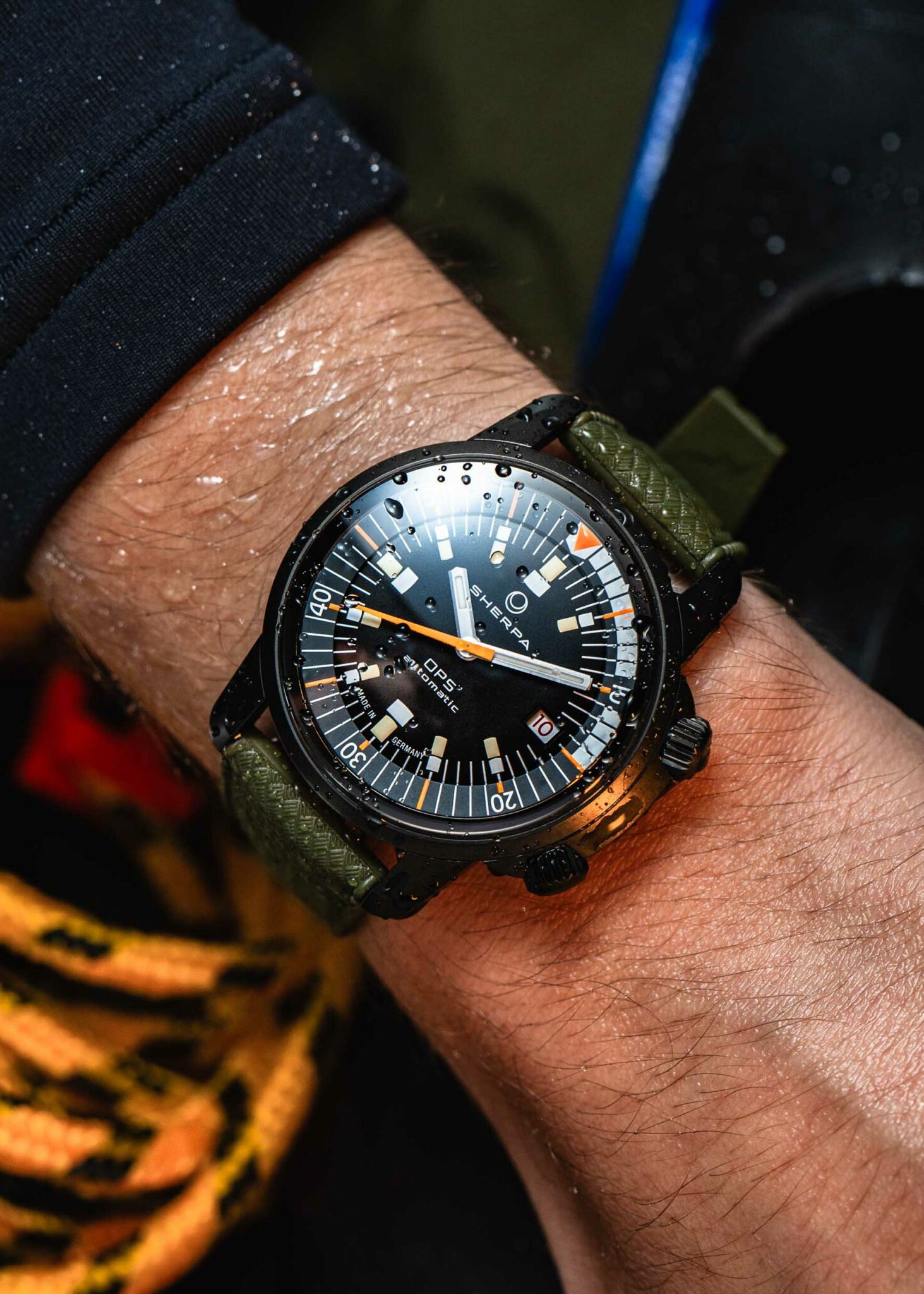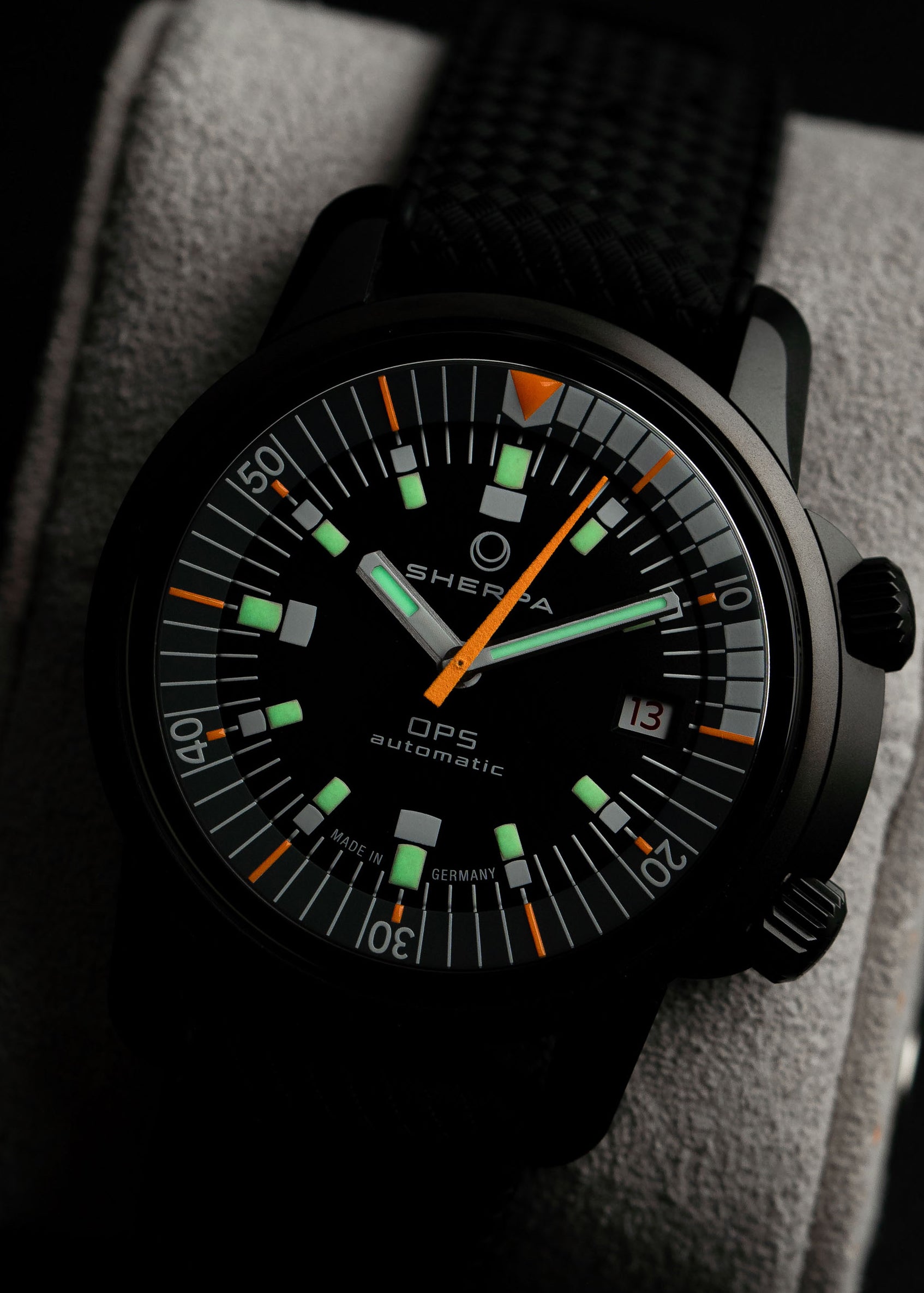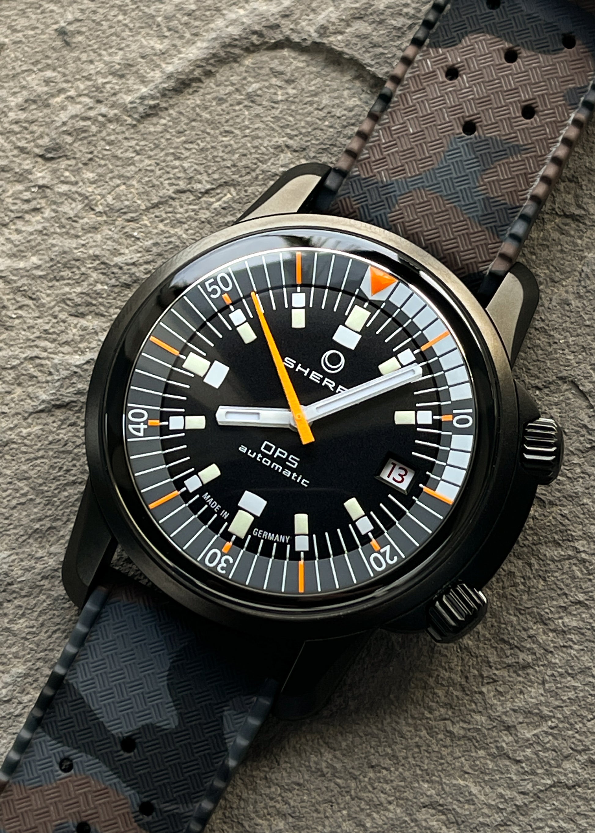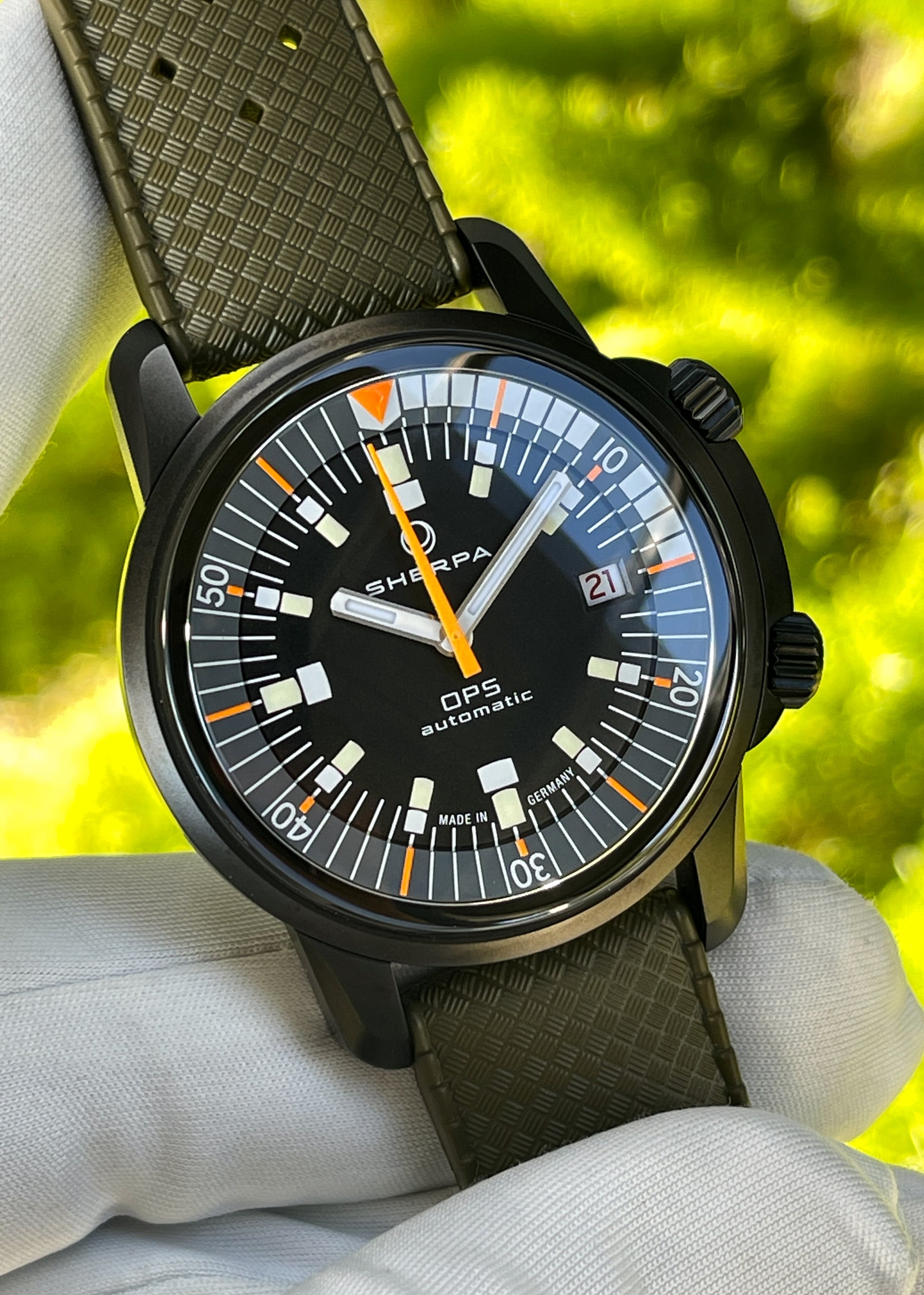 With its satin finished dark anthracite watch case, the OPS is the rebirth of a model that was favorited by several Navy Forces in the 1960s. The elegantly domed sapphire box glass with internal anti-reflex coating adds to the sleek appearance on the wrist, which enables the rugged tool watch to be worn on any occasion.