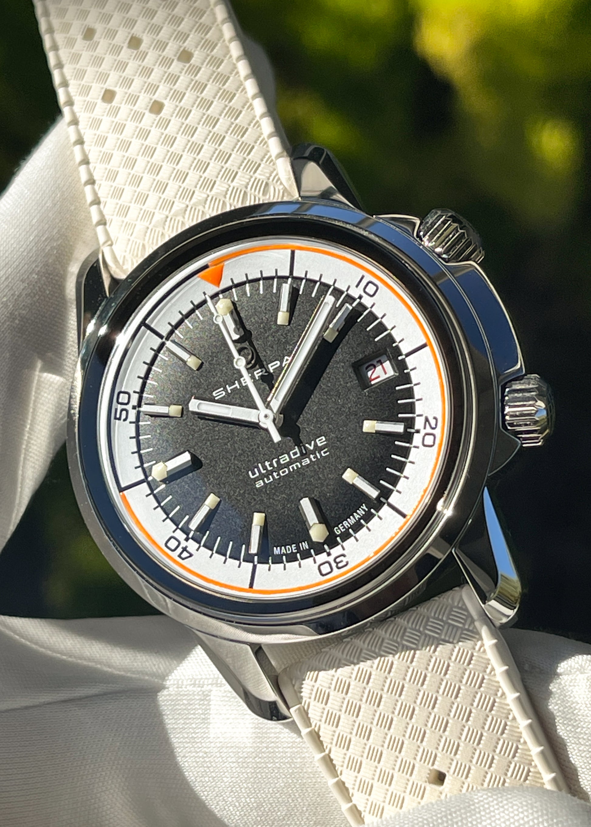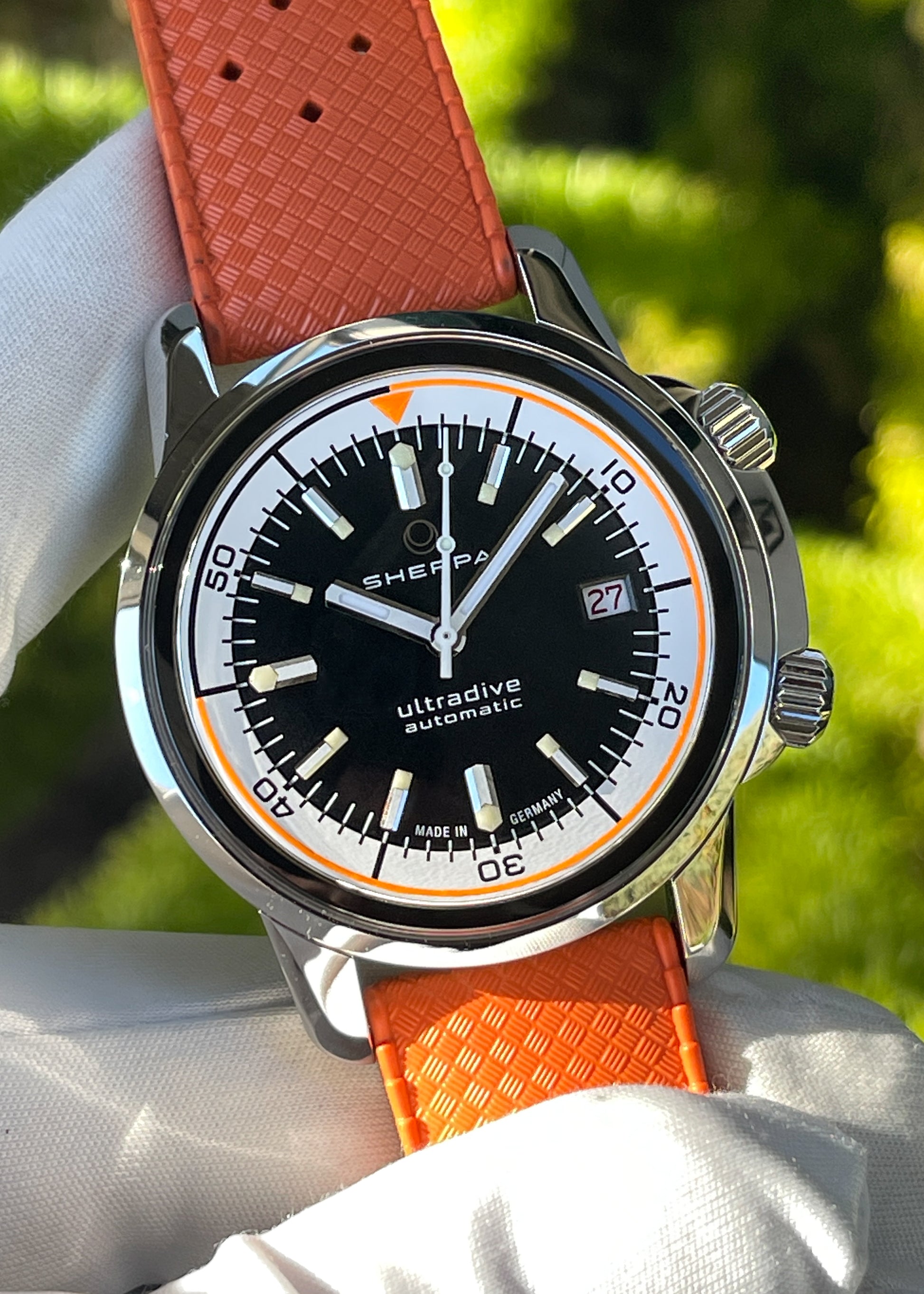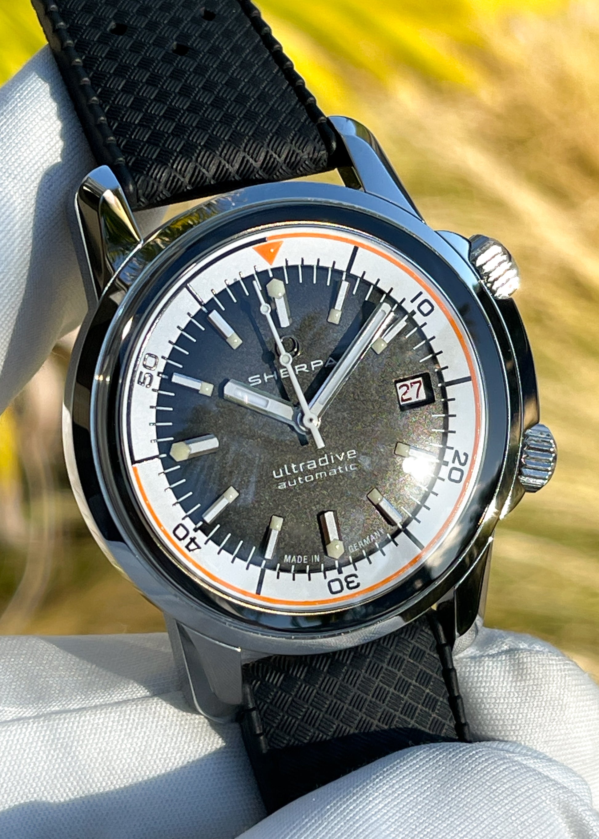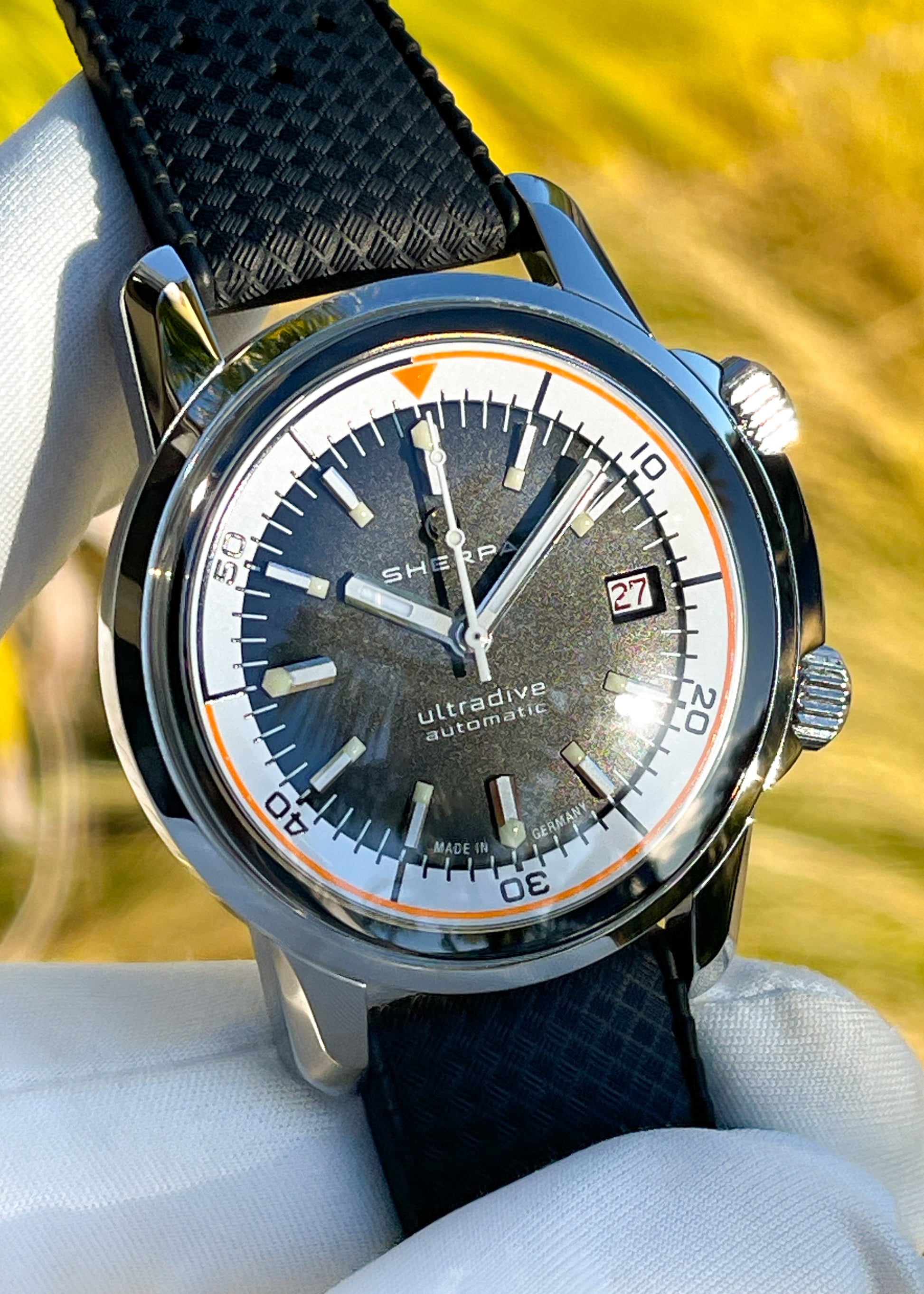 A modern take on the vintage icon, the Sherpa Ultradive has all the charm of the original with its 'double lollipop' seconds hand and robust crown guard protection.