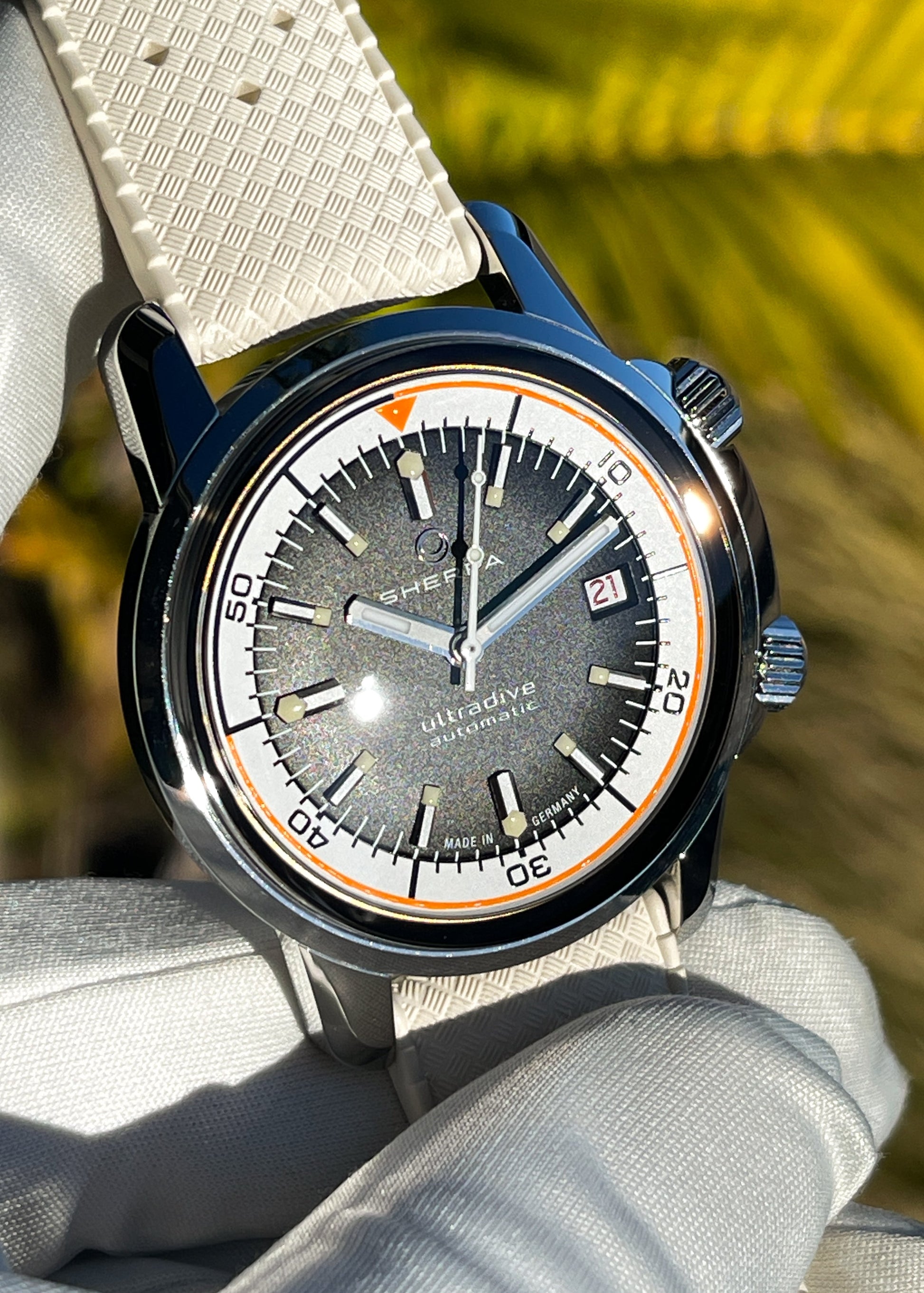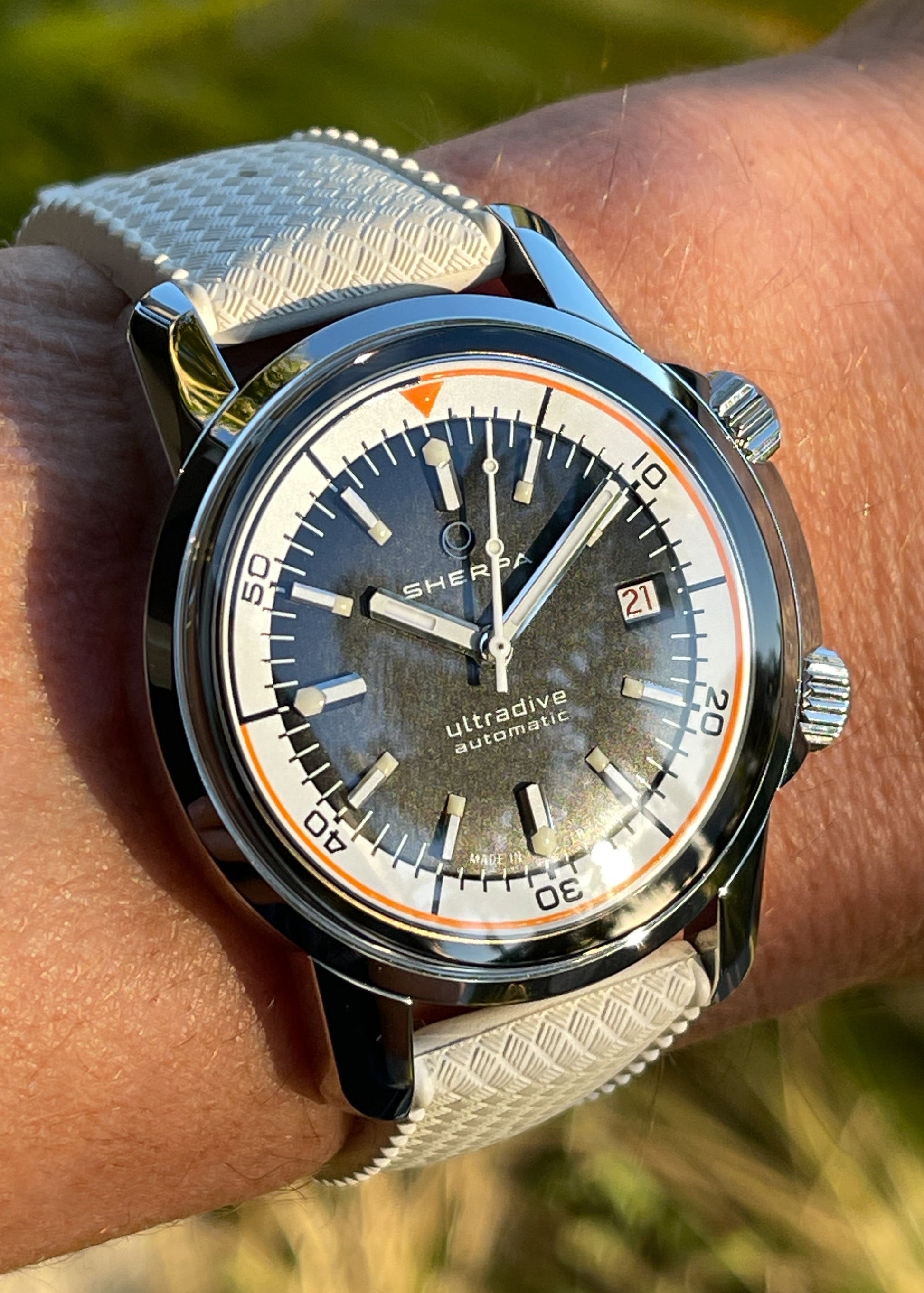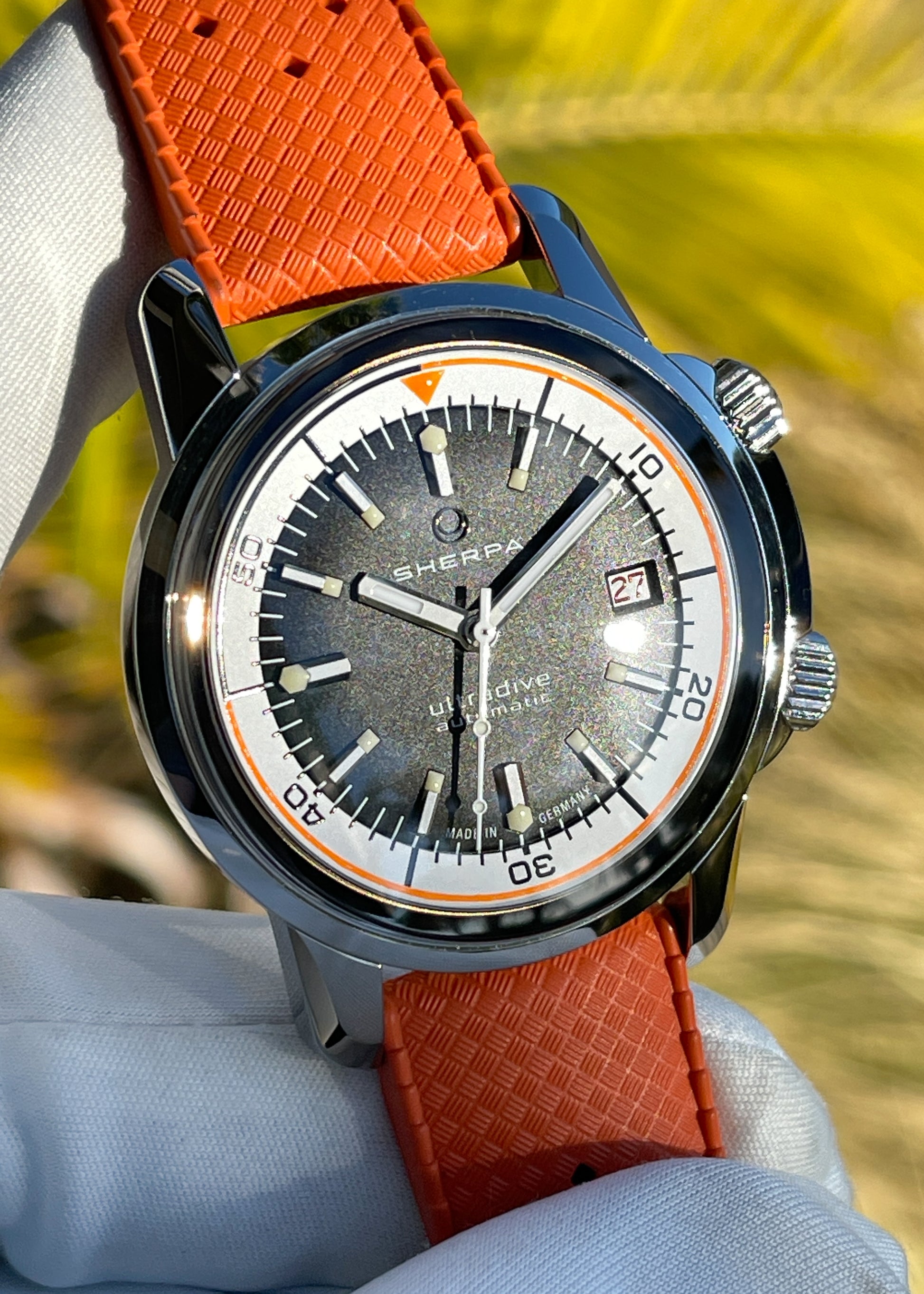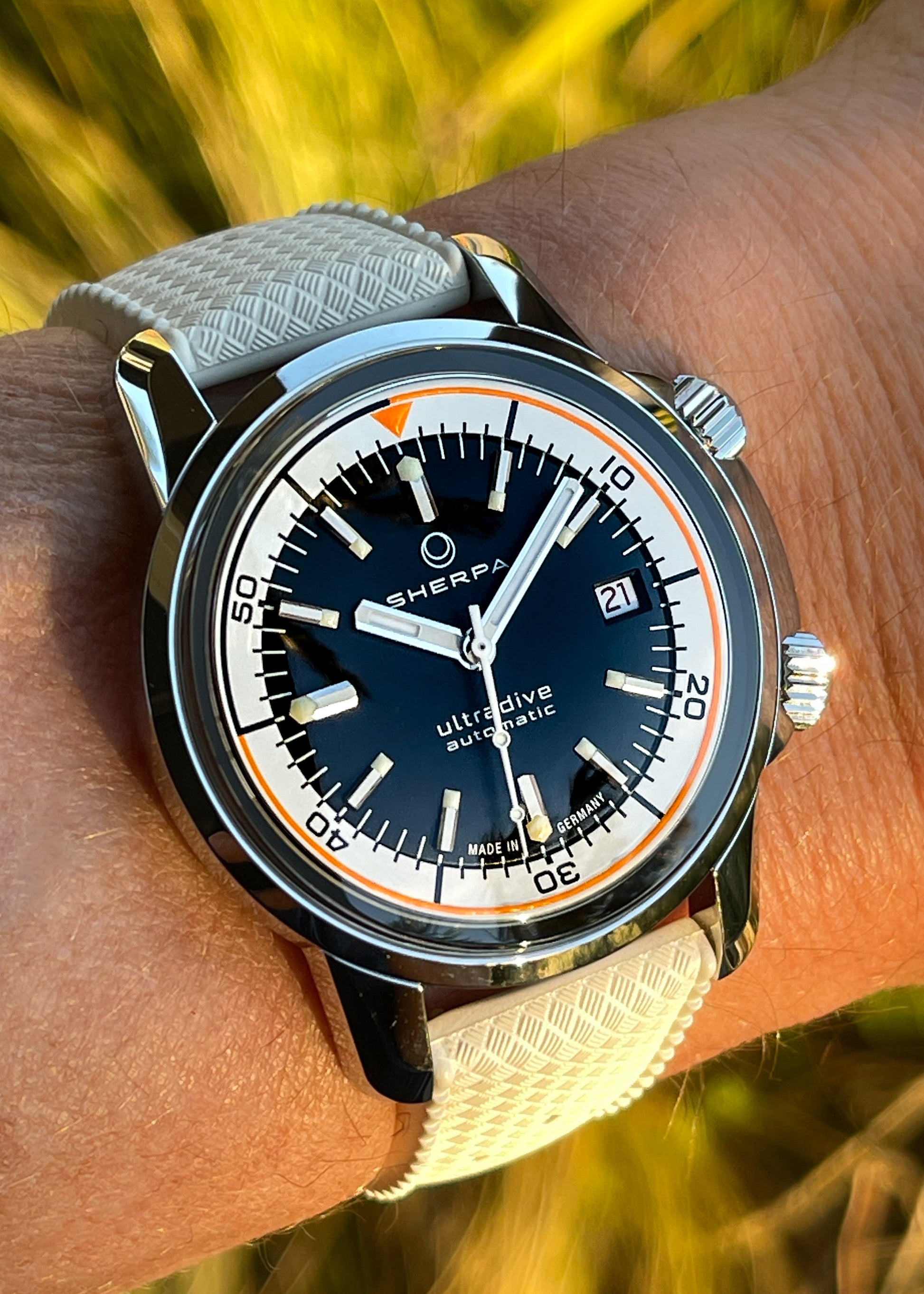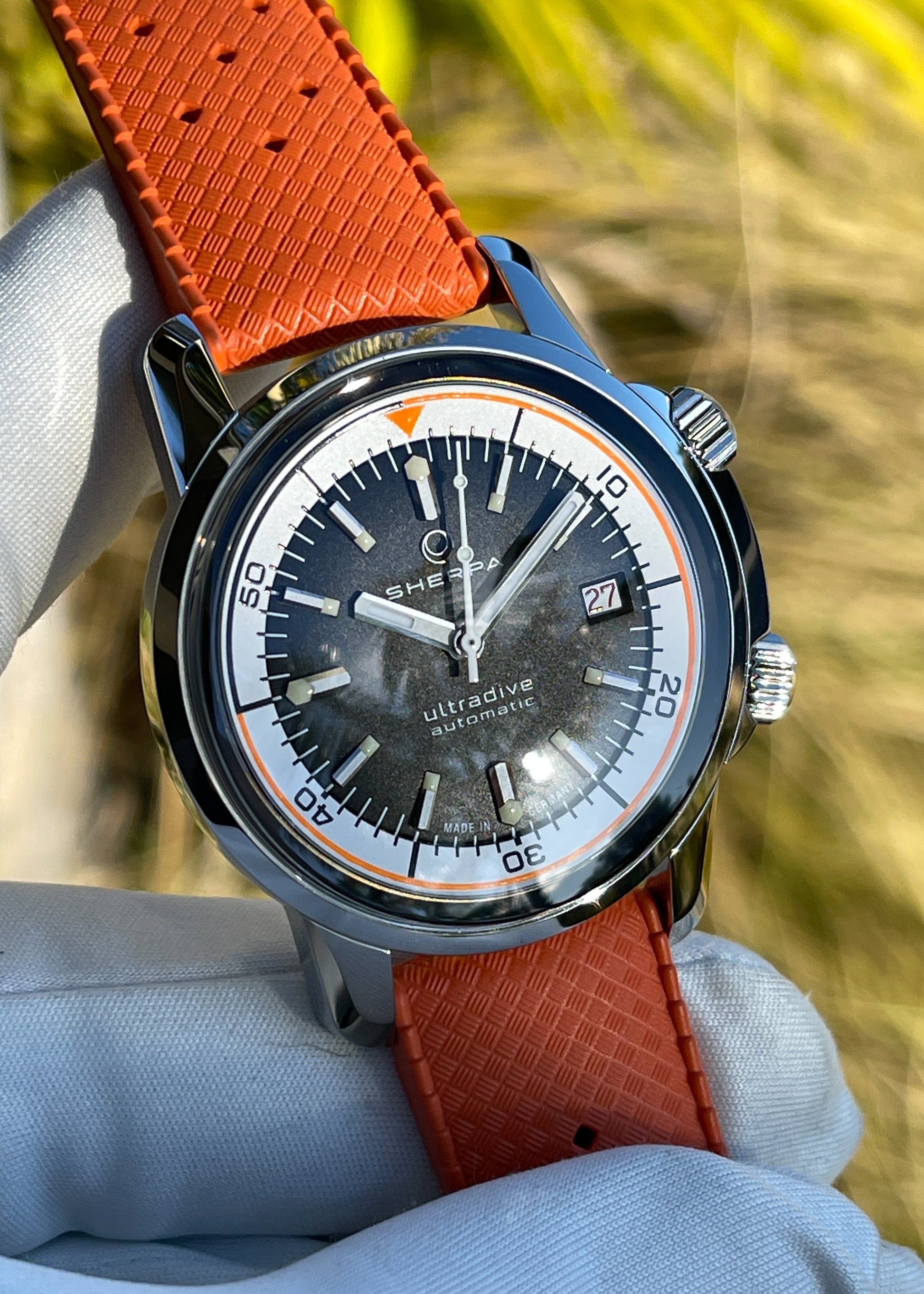 A modern take on the vintage icon, the Sherpa Ultradive has all the charm of the original with its 'double lollipop' seconds hand and robust crown guard protection.