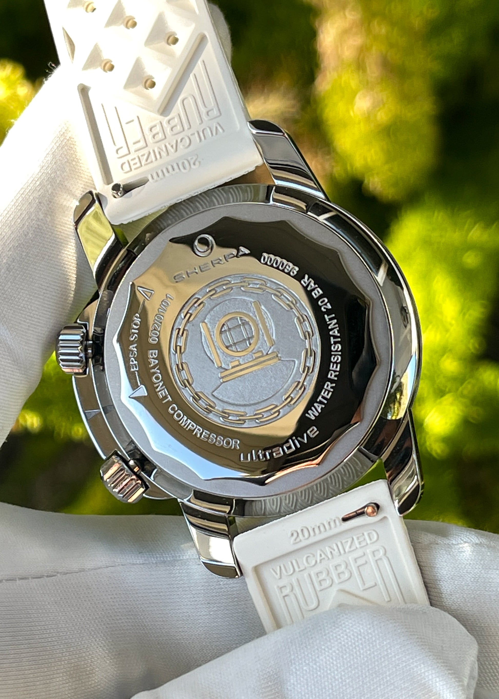 The Ultradive carries 200M/660ft water resistance and features the unique compressor mechanism in the caseback and crowns. This watch features true "Super Compressor" crown construction that allows for the seals to further tighten as the watch experiences increased amounts of water pressure. The end result are crowns with considerable water resistance without the need to be screwed down.
