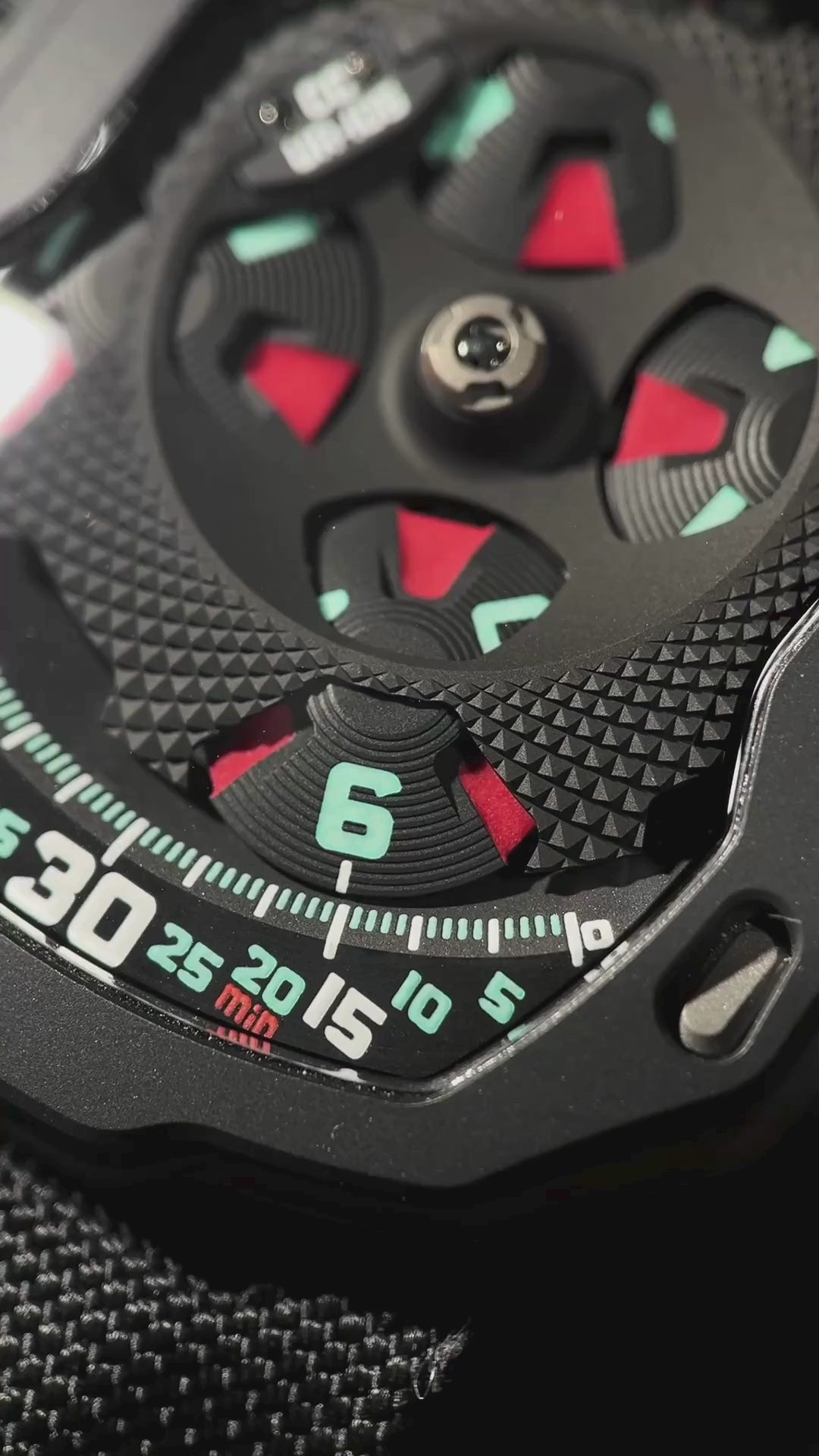 The reverse side reveals a glimpse of the self-winding mechanism coupled to dual turbines of the in-house Calibre UR 5.02. A lever on the caseback allows the user to reduce the effectiveness or completely decouple the turbines where needed. The movement beats at 4 Hz and carries a 48-hour power reserve. Near the crown is the engraving "8/15" which is the special edition number of this watch.