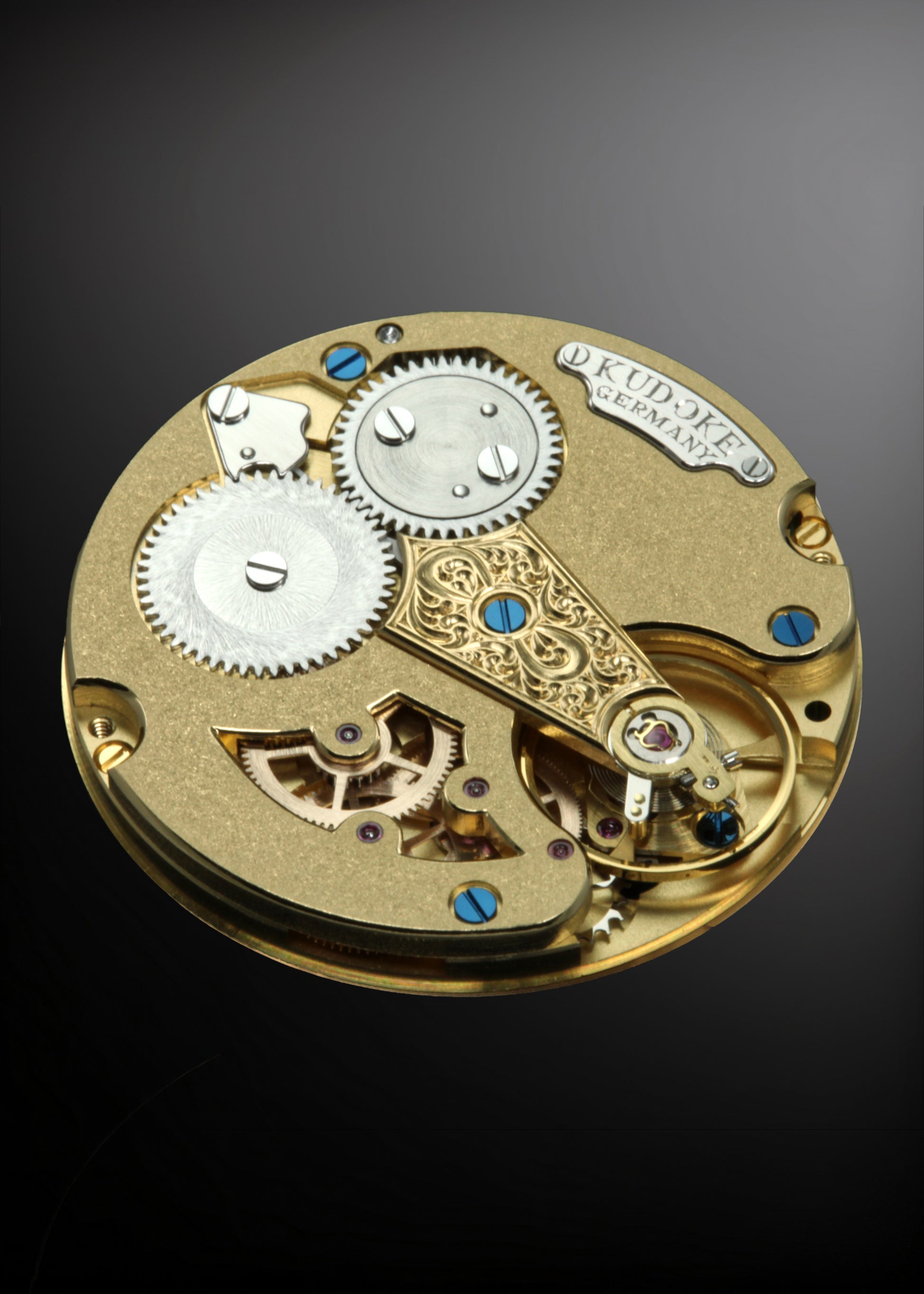 When placing a Special Order of a Kudoke 1, Kudoke 2, Kudoke 3, or Kudoke 5 the bridges of the Kaliber 1 can be skeletonized to reveal the gear train underneath. Alternate plating treatments (rose gold, dark rhodium, white rhodium) are also possible on request.