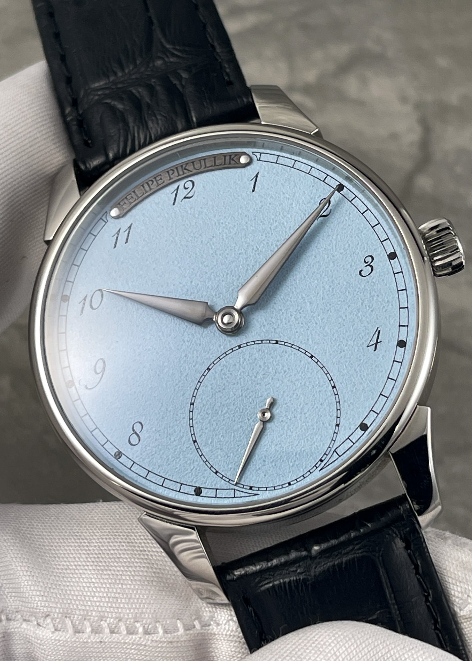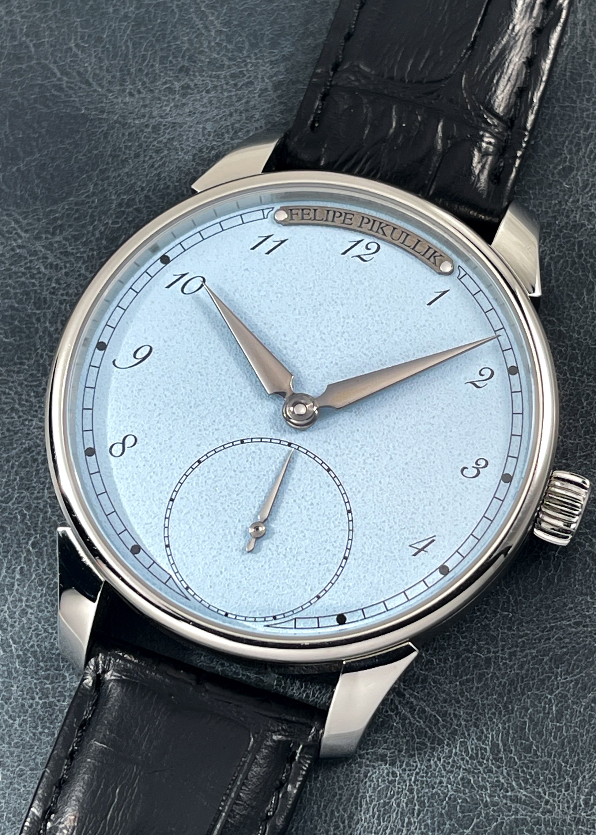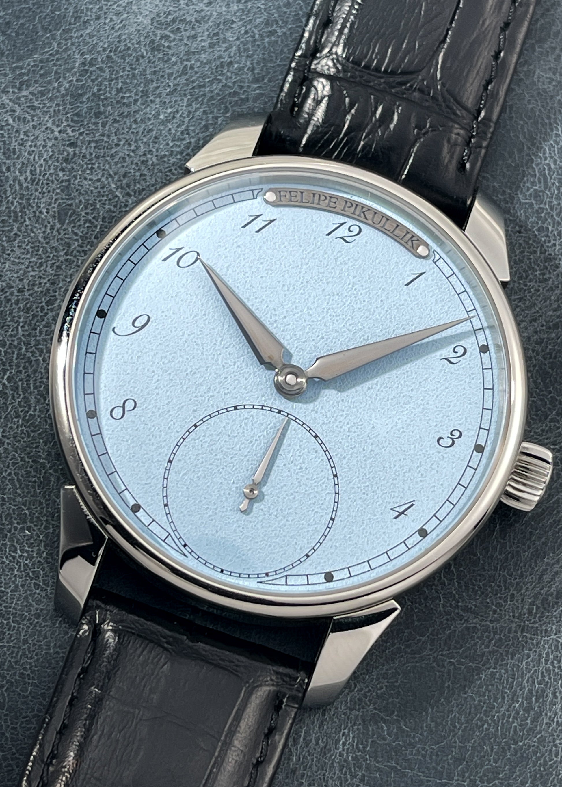 The movement is a work of art, showcasing dark rhodium-plated bridges with frosted surfaces, mirror-polished anglage, and hand-engraved accents on the balance cock. The crown and ratchet wheel feature elegant snailing, while circular graining adorns the hour, minute, and second wheels. Each component is meticulously finished by hand, reflecting Felipe Pikullik’s dedication to horological artistry. The movement operates at 2.5 Hz and carries a power reserve of 46 hours.