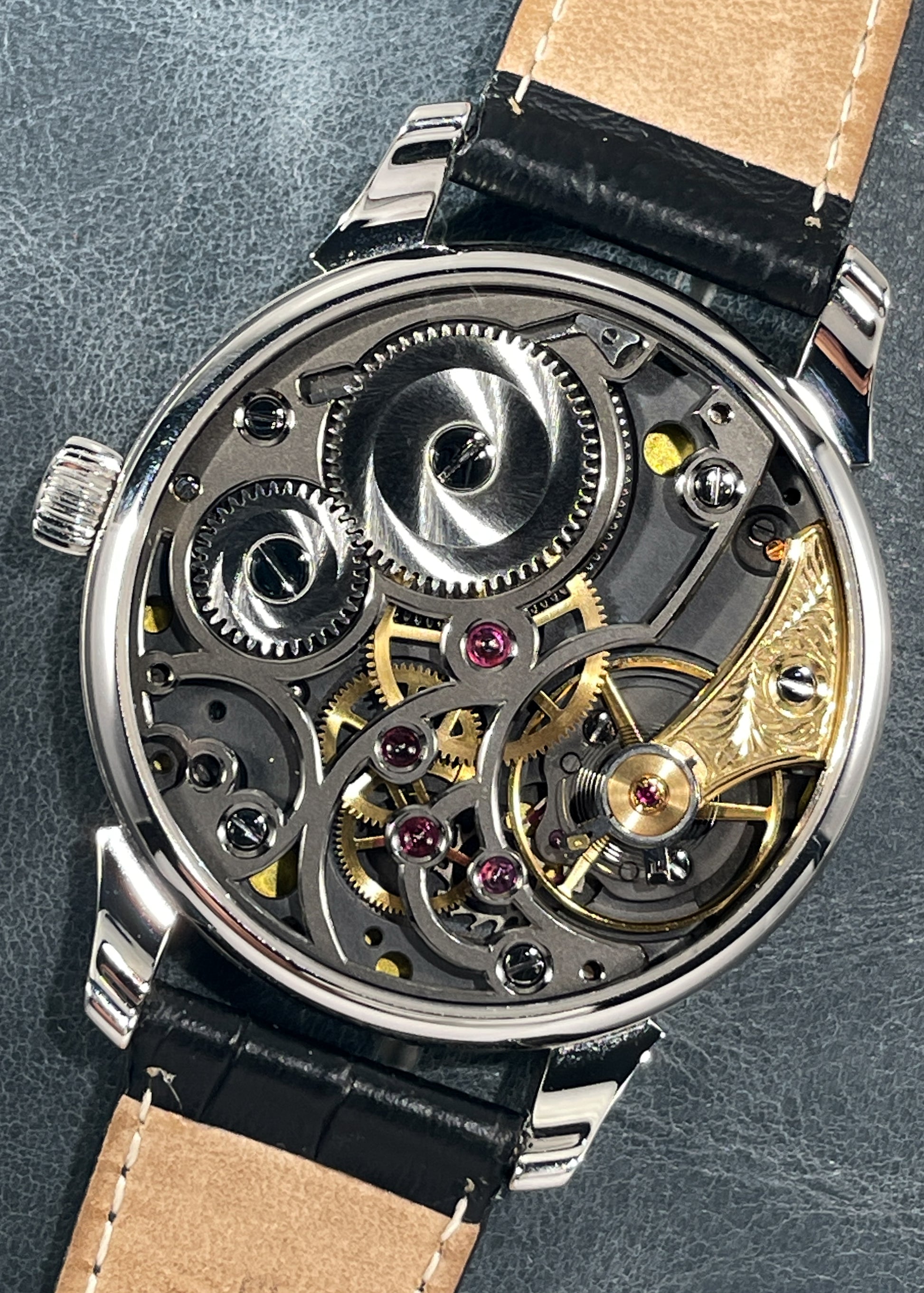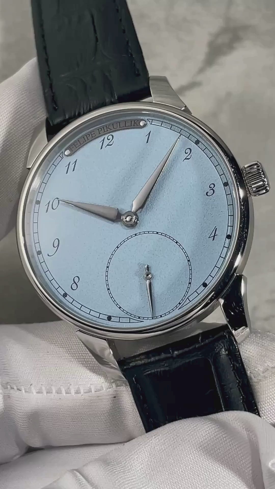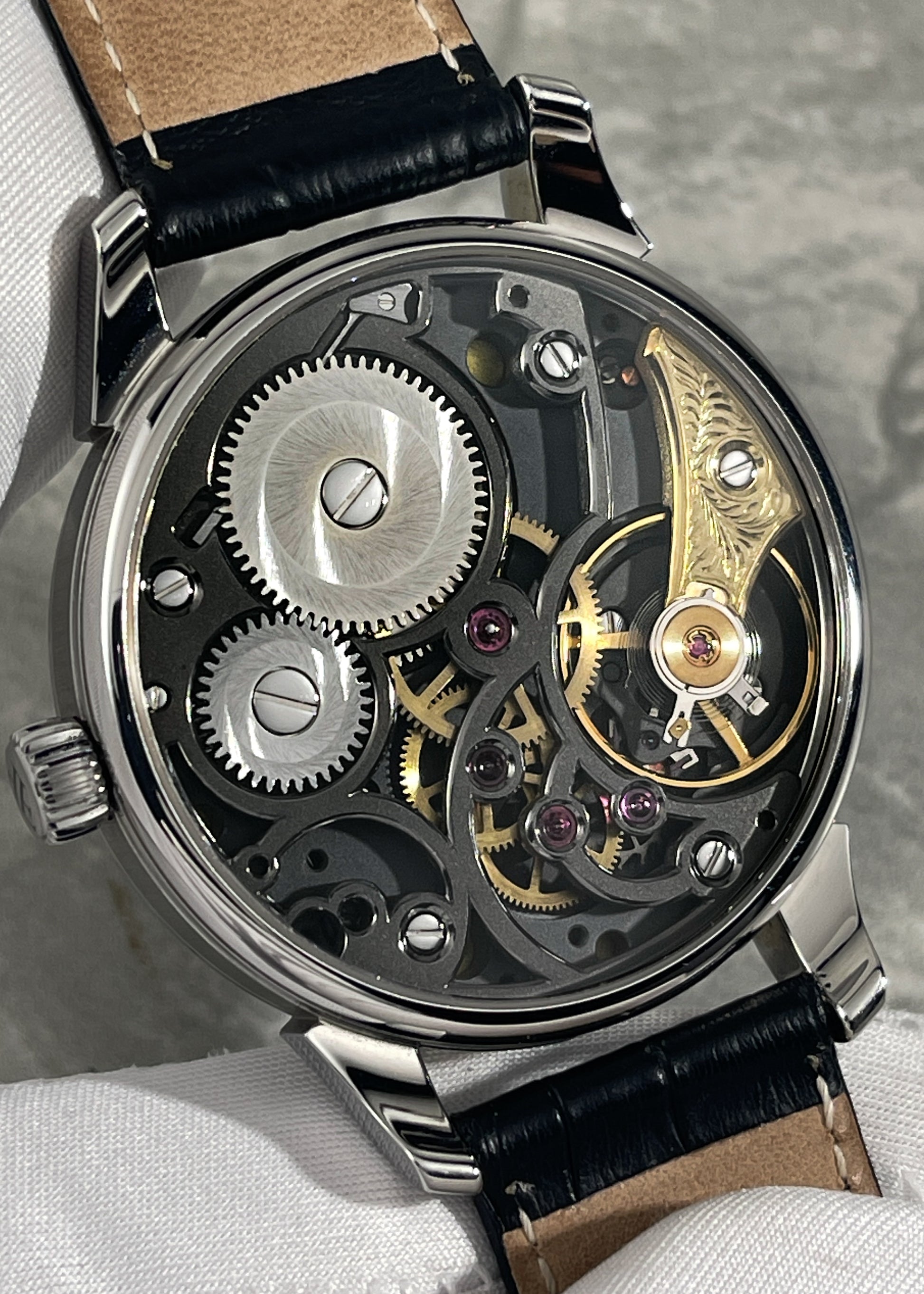 The movement is a work of art, showcasing dark rhodium-plated bridges with frosted surfaces, mirror-polished anglage, and hand-engraved accents on the balance cock. The crown and ratchet wheel feature elegant snailing, while circular graining adorns the hour, minute, and second wheels. Each component is meticulously finished by hand, reflecting Felipe Pikullik’s dedication to horological artistry. The movement operates at 2.5 Hz and carries a power reserve of 46 hours.