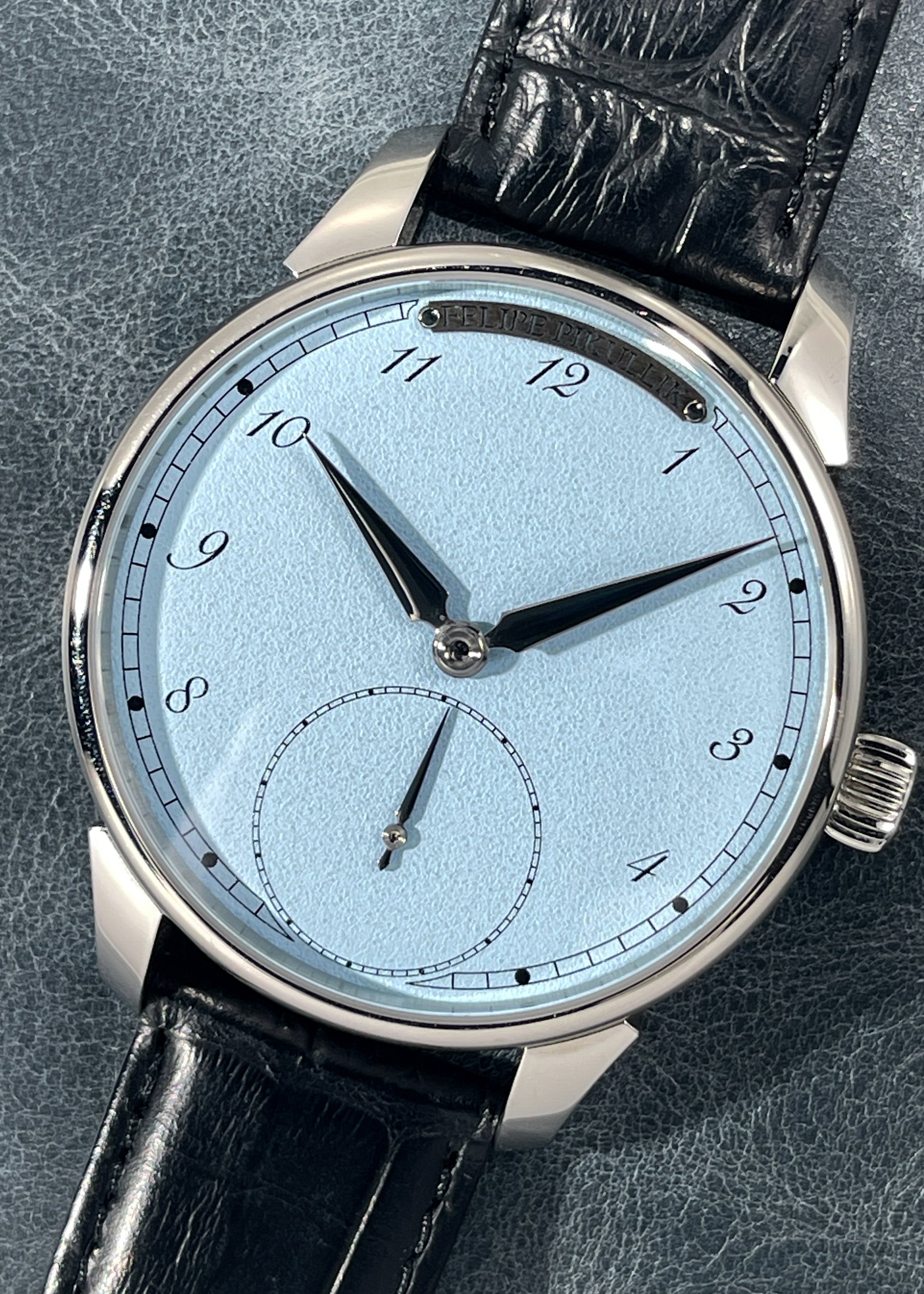 Underneath beautiful dauphine shaped hands, this bespoke version of the Sternenhimmel features a grained baby blue dial with printed Breguet numerals. Running seconds exist in the generously sized subdial at 6 o'clock.