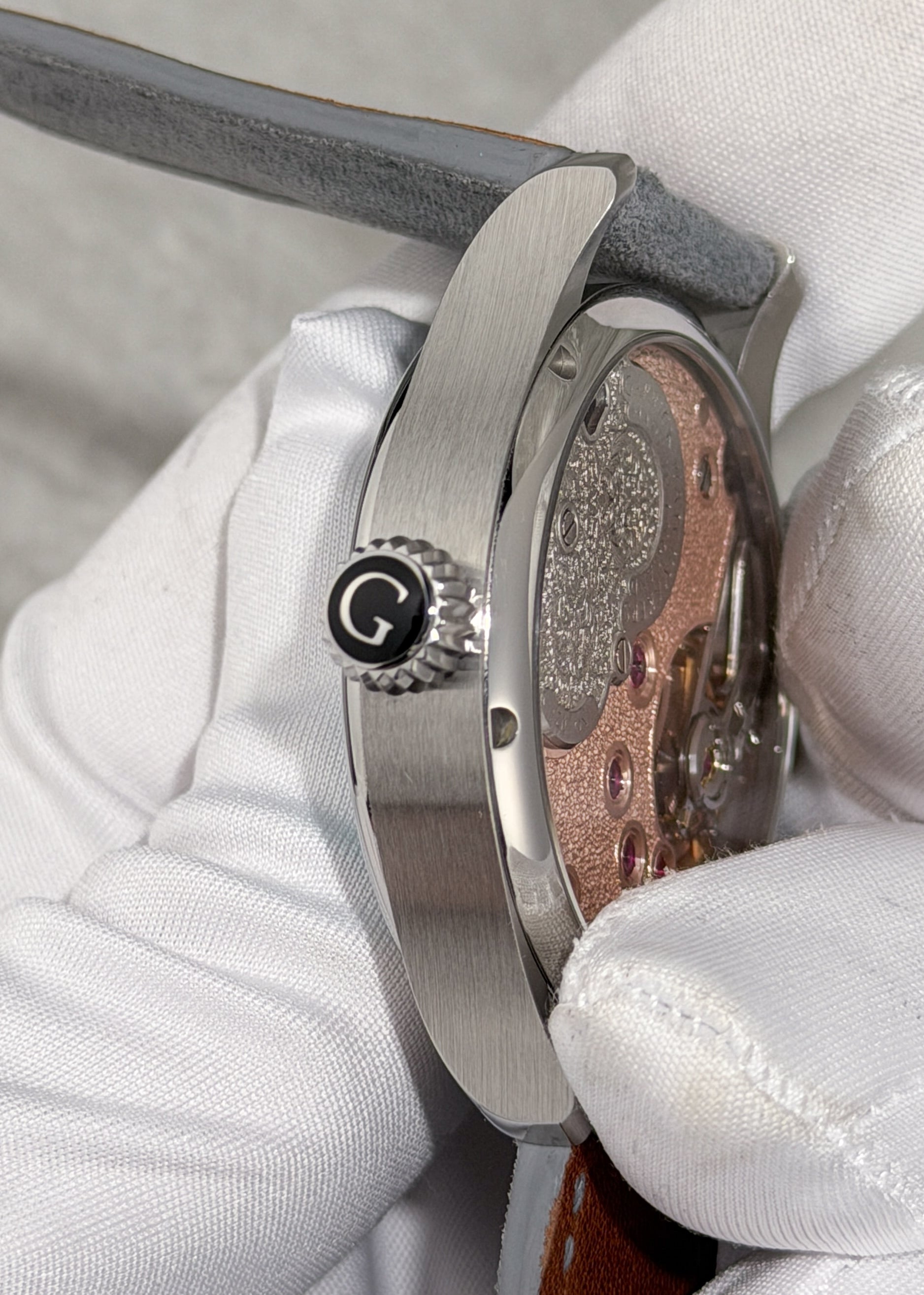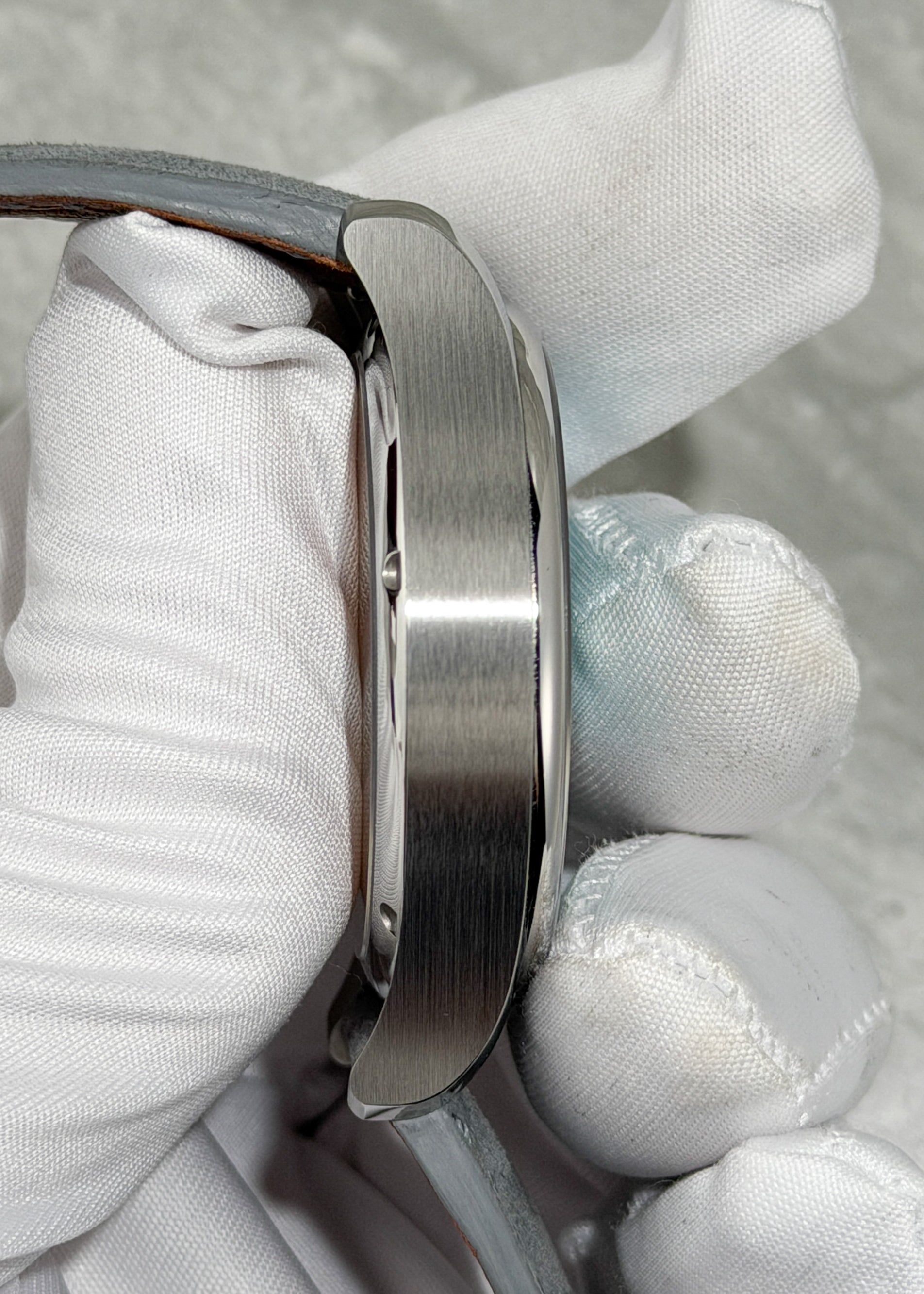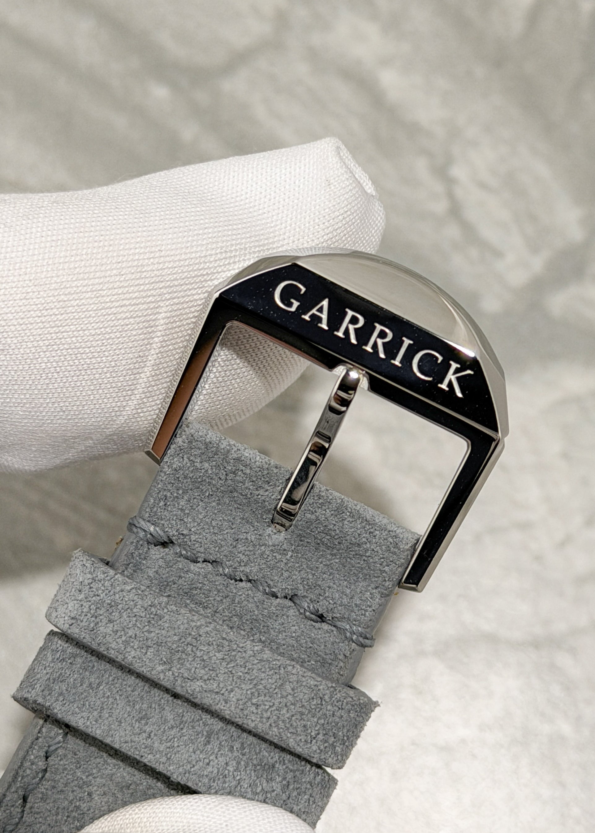The 904L Stainless Steel case measures 41mm x 11.3mm x 50.5mm lug-to-lug and is in excellent condition. Some scratches are evident underneath the lugs from a strap change (wasn't me). Furnished on a long length grey suede calfskin strap with signed Garrick pin buckle. Complete with Box & Papers dated May 14th, 2025.