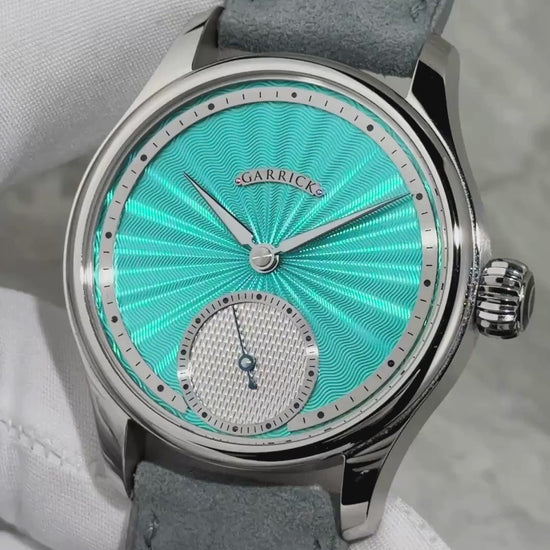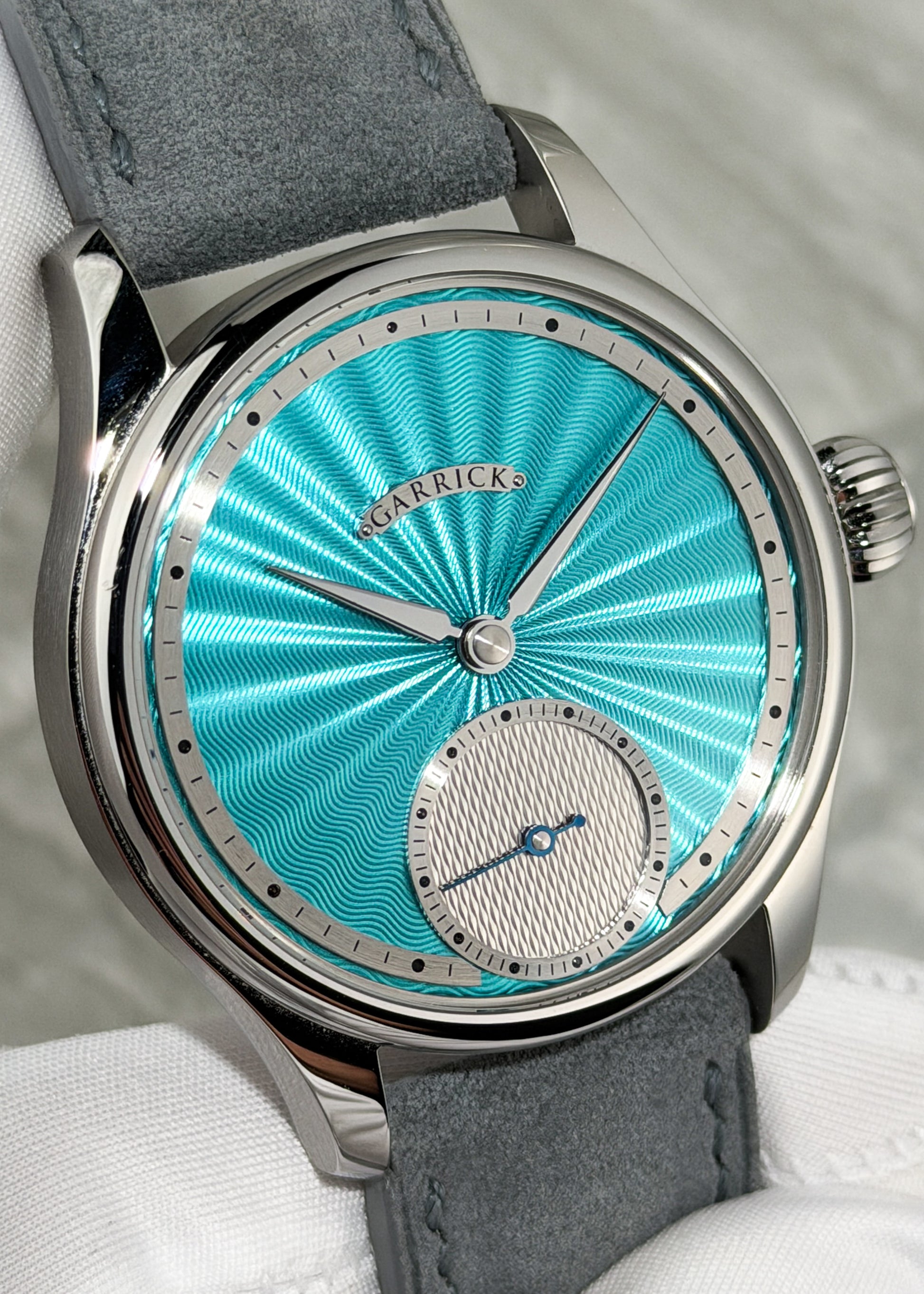 Horology By The Sea is proud to present this Garrick S6 with a stunning Aqua Blue guilloché dial and polished Lancine-shaped hands. The seconds are found atop to an engine turned silver subdial with basketweave pattern. A circular-grained chapter ring is applied to the dial for added depth and legibility.