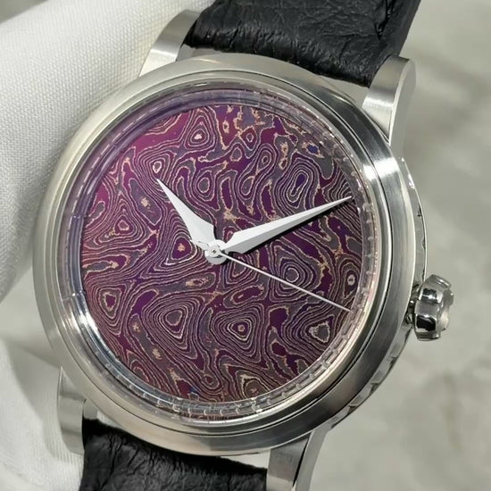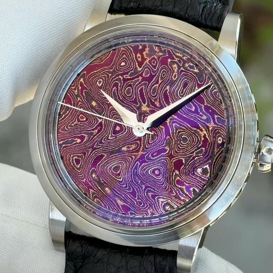 Horology By The Sea is beyond thrilled to present this unbelievable Sarek "Afterglow" from the GoS' atelier in Sweden. The steel dial with triangular swirl patterns was masterfully heated purple by Patrik Sjögren. The dynamic range of color spans from purple and pink and orange, then over to a monochrome of grey elevations and valleys of black.