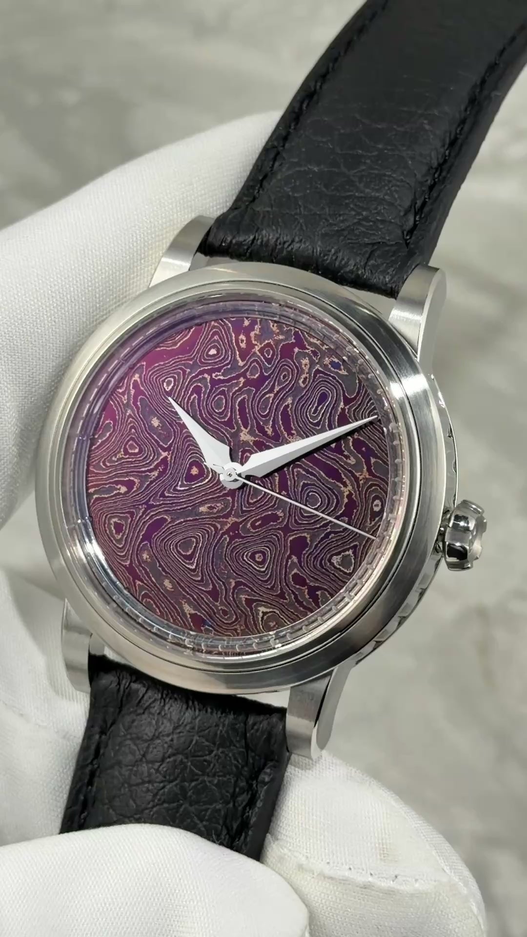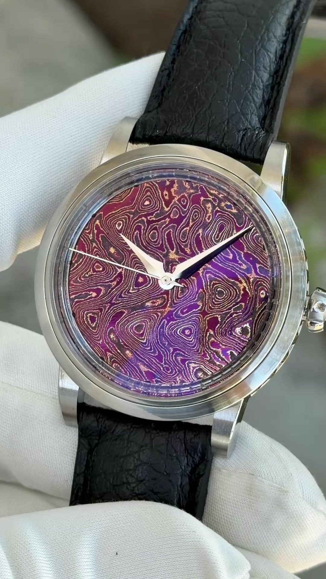 This Sarek "Afterglow" with a tempered Purple Damascus Dial is IN STOCK and available for immediate delivery.