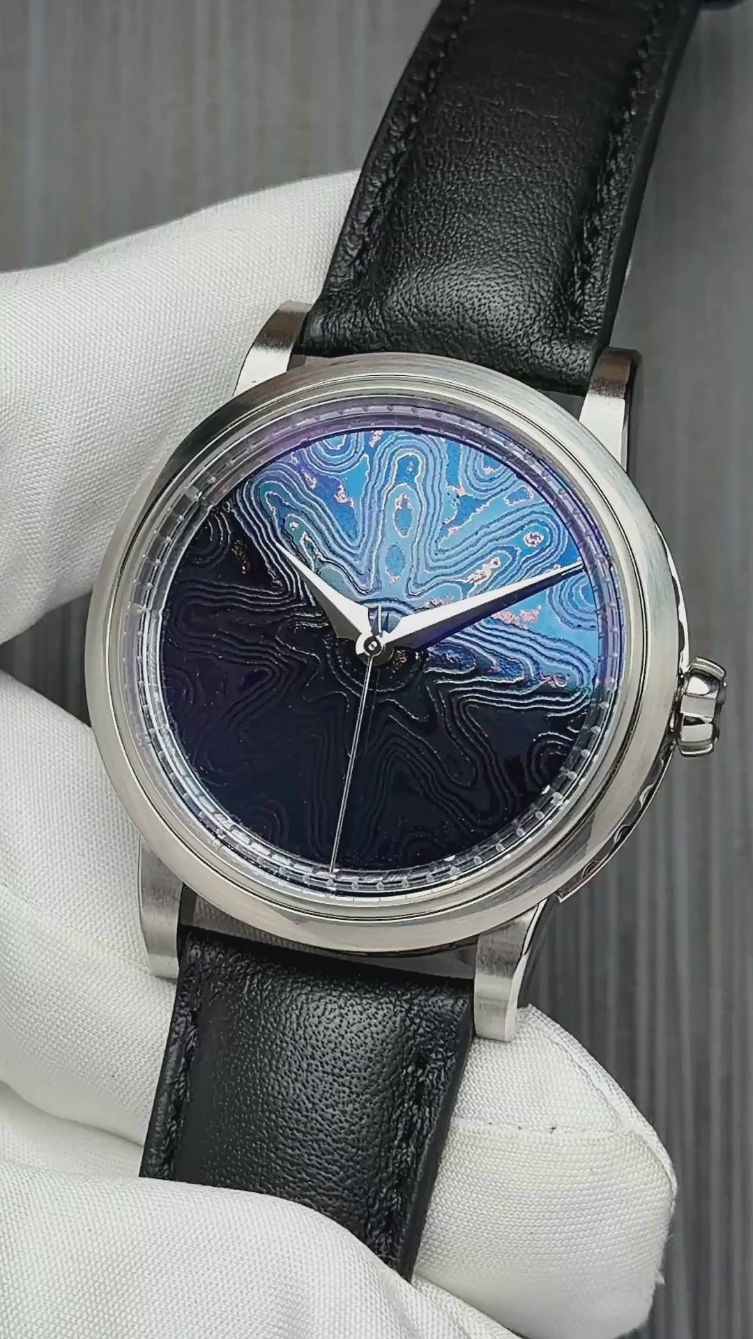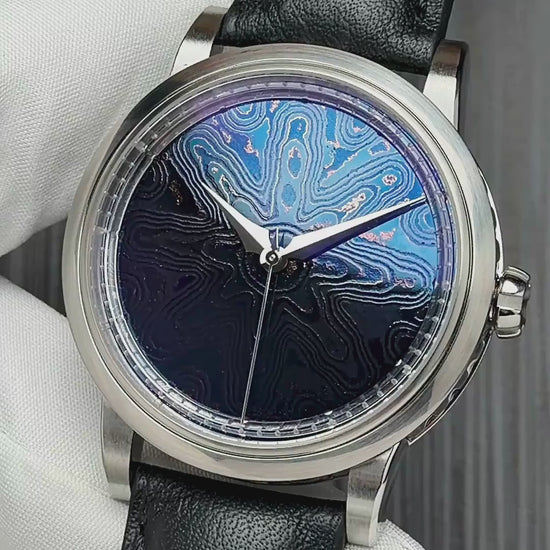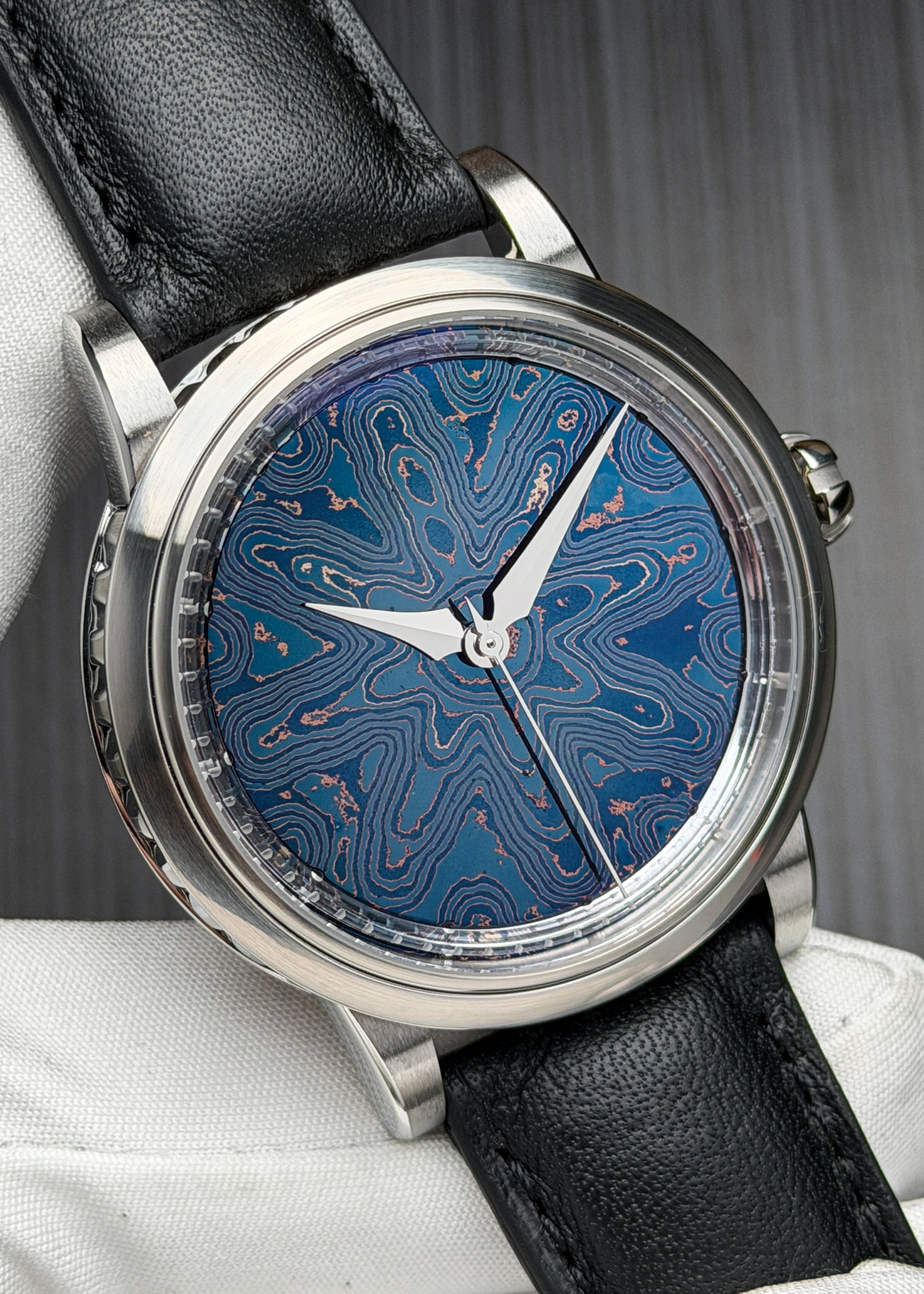 Presenting a new and improved "Sarek" from GoS of Sweden. The stainless steel case has been reduced from 43mm to 41mm while the relative size of the dial has increased thanks to minimalist and tasteful chapter ring crafted from sapphire crystal. The Damascus steel dial features a "Wildflower" pattern with wave patterns emanating from the cener of the dial.Â