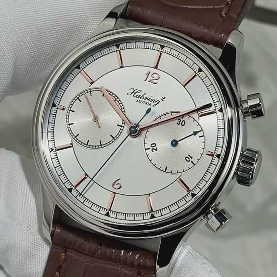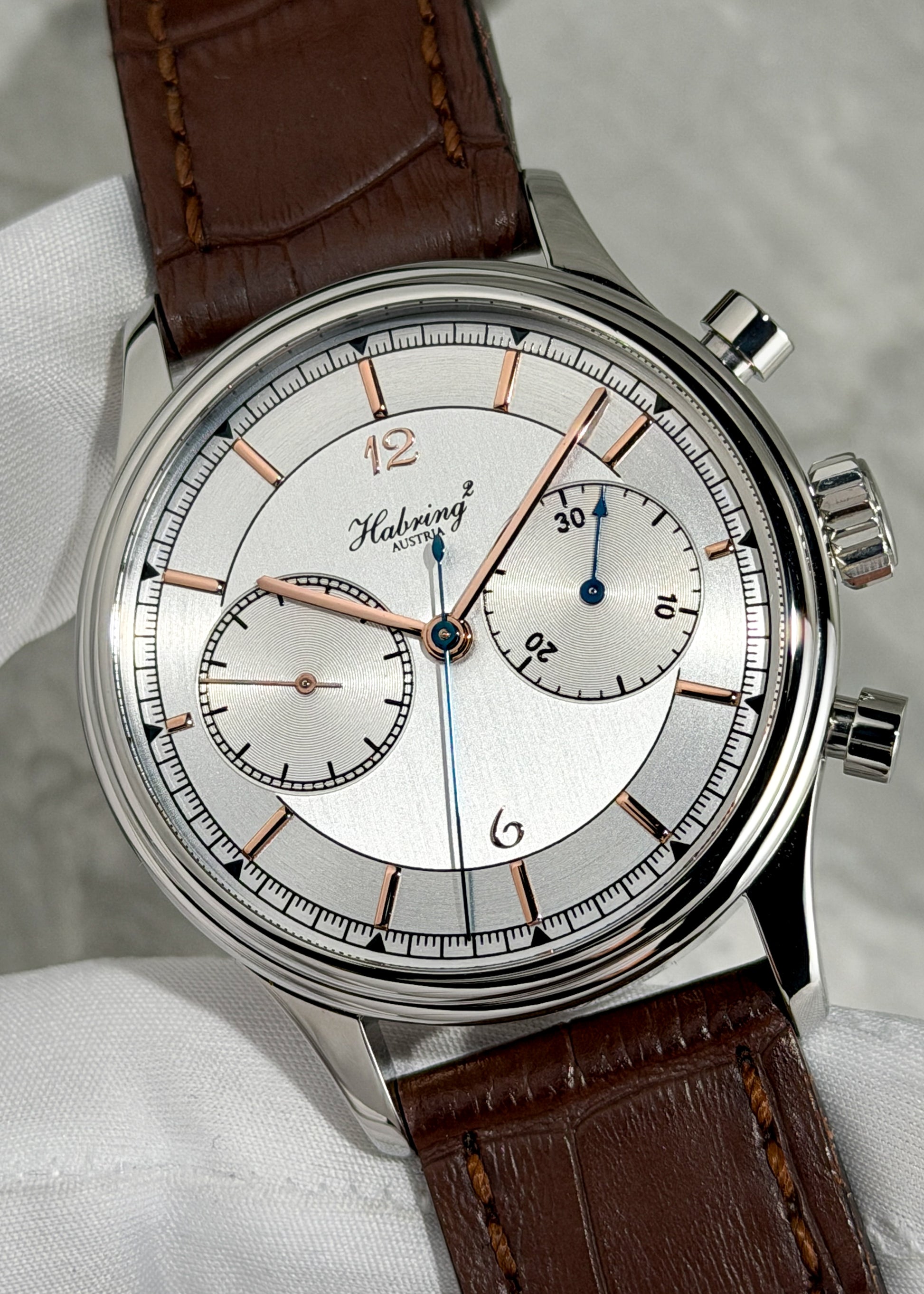 A blast from the past, this Habring² "Chrono" is indeed rare in that it's one of the very few Habring²'s to feature a two pusher setup. Rose gold colored hour and minute hands compliment the appliqué hour markers and Breguet numerals. Blued chronograph seconds and minutes hand measure up to 30 minutes of elapsed time.