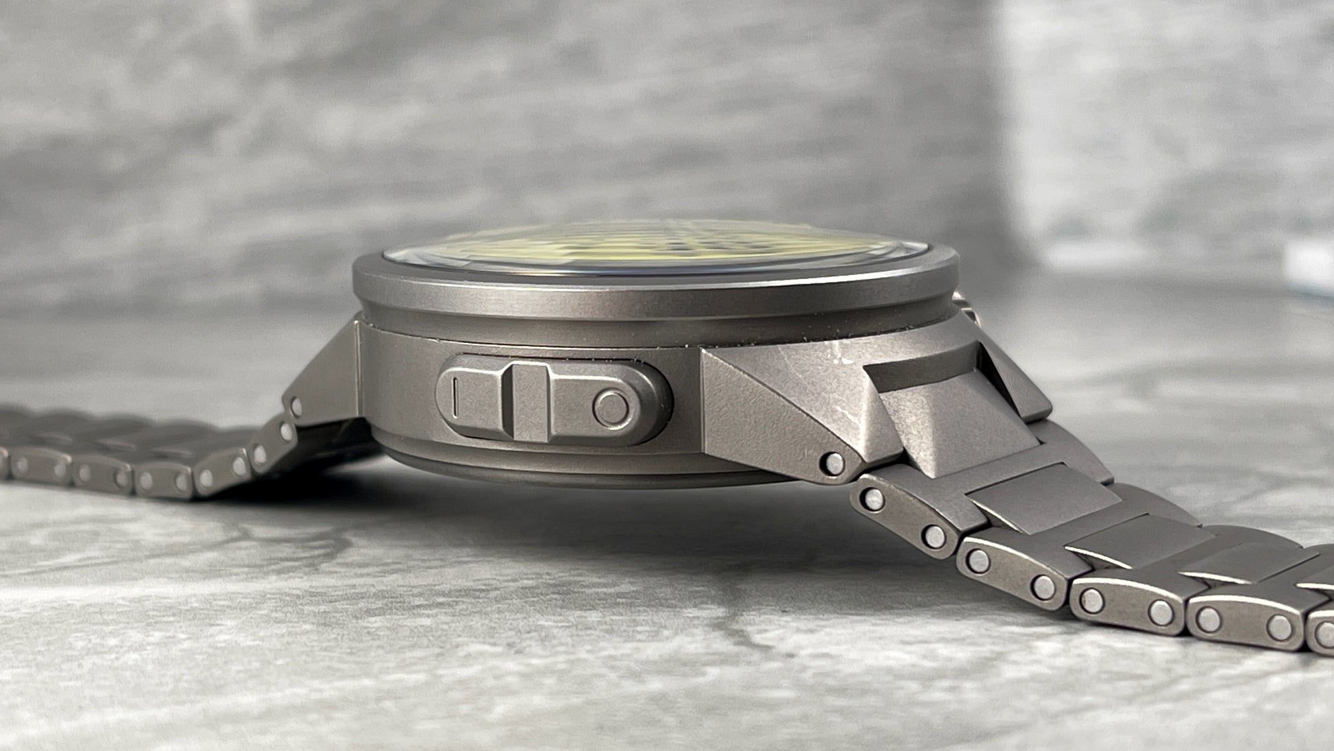 3. A "Split Minute" complication whereby toggling the trigger at the 8 o'clock position freezes the black and yellow hand in place (seen in the photos frozen at the 23 minute mark). As the minute hand travels away from the frozen hand the user can measure the elapsed time between the two hands. Toggling the trigger at 9 o'clock will send the black and yellow hand back underneath the minute hand.