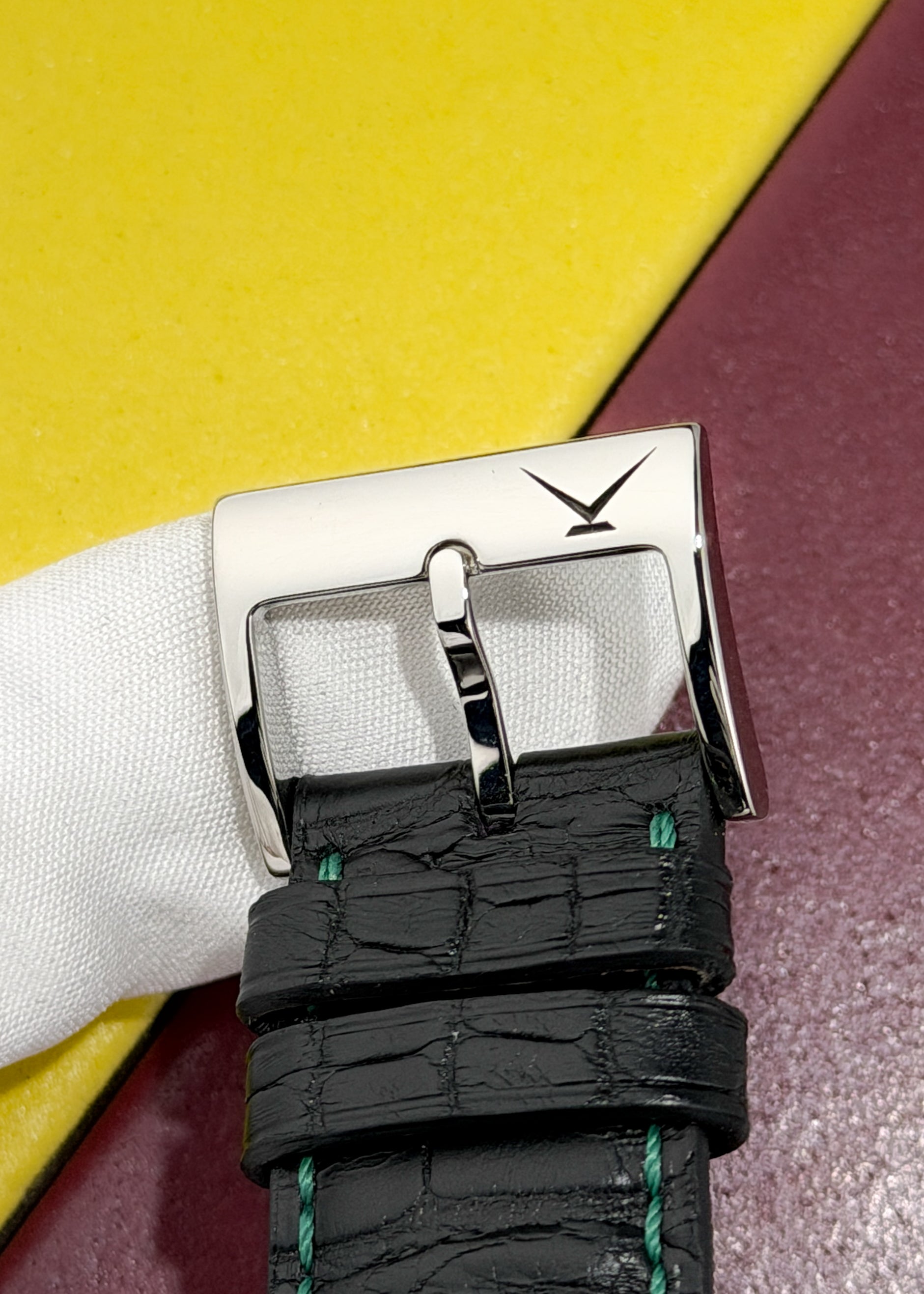 The Stainless Steel case measures 40mm x 13.7mm x 46mm lug-to-lug and is mint condition. Furnished on a black Alligator strap with green stitching and stainless steel Chaykin pin buckle. Complete with Box & Papers dated December 2022.