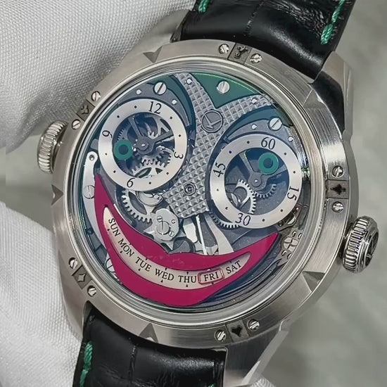 Celebrating the fifth anniversary of Konstantin Chaykin's "Wristmons" that redefined independent watchmaking, this 40mm stainless steel marvel transitions the Joker from a playful provocateur to a piece of high-horology theater.