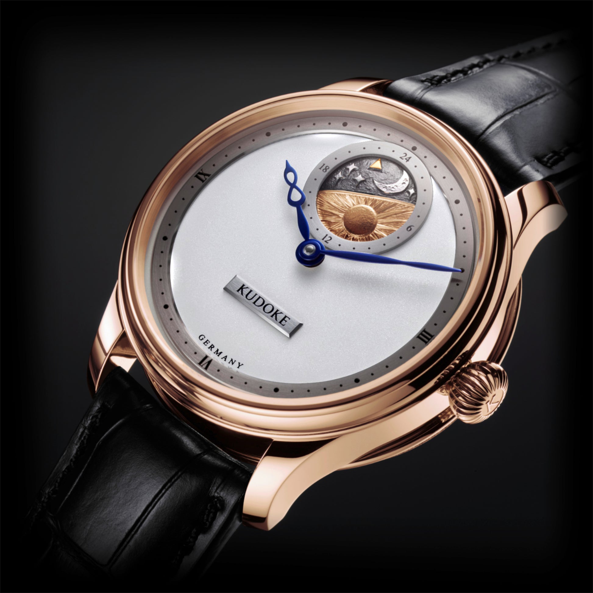 The solid 18 karat rose gold case measures 39mm x 10.7mm x 46.mm lug-to-lug and carries 50M Water Resistance. Furnished on a black alligator strap and signed 18 karat rose gold Kudoke pin buckle. All new Kudoke watches are backed by a 2 year International Warranty.