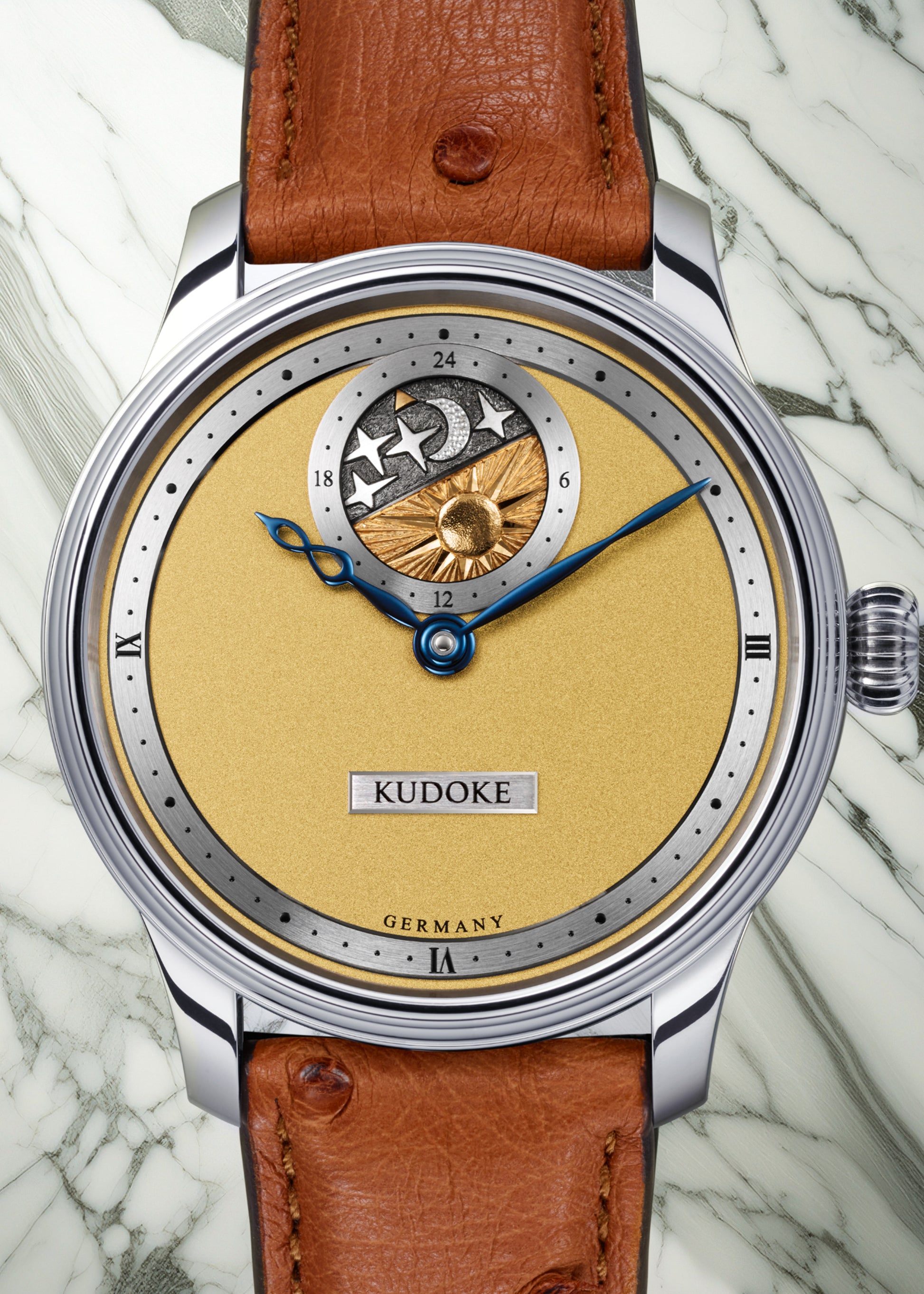 The plated yellow gold dial features a fine-grain that diffuses light evenly across the surface. This matte backdrop provides high contrast for Kudoke's iconic blued hour hand hallmarked with the infinity symbol and lancet styled minute hand. A brushed and rhodium-plated minute chapter sits elevated on the dial carrying Roman numerals at the quarter markers. The bevels are diamond-cut for sharpness.