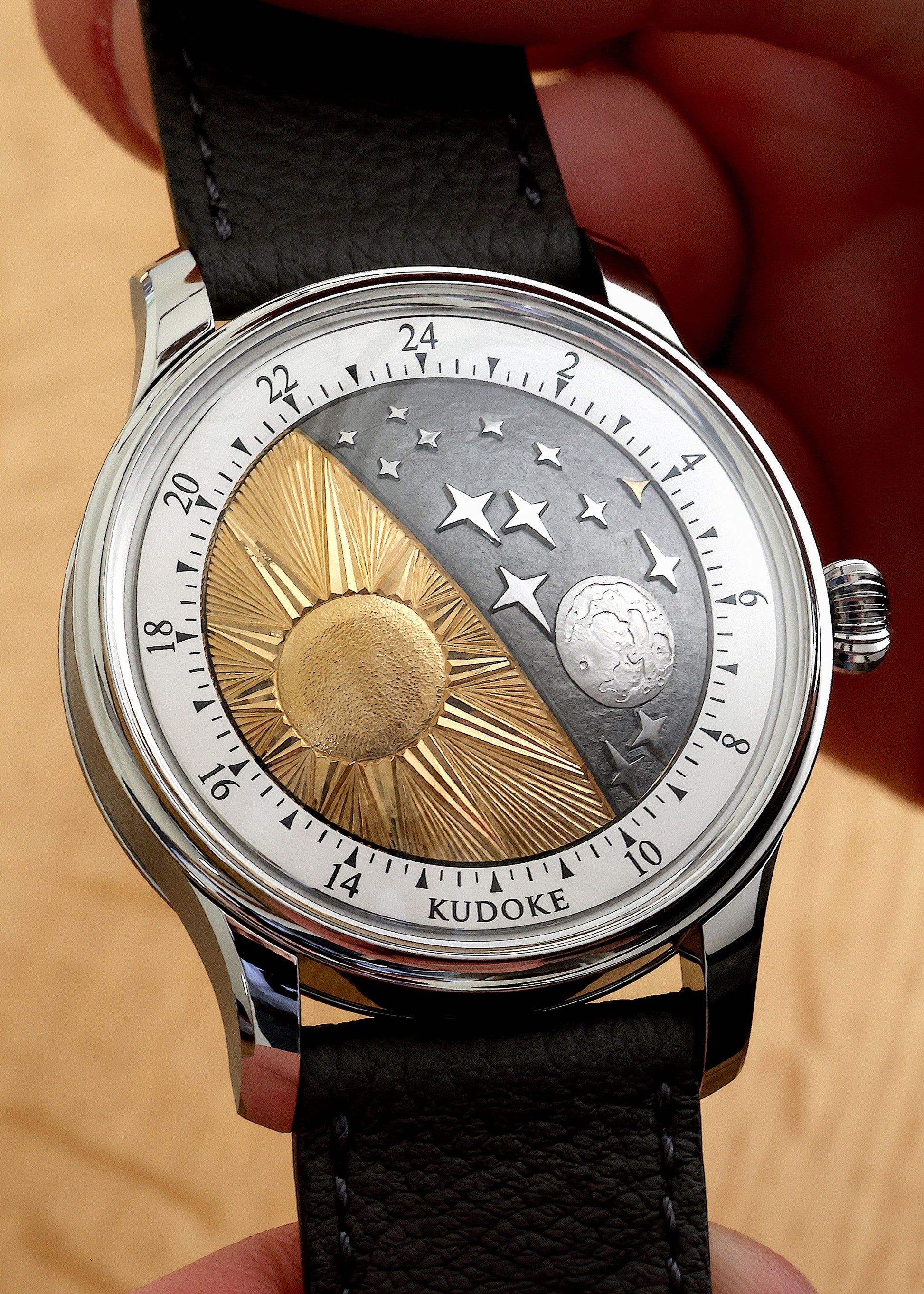 Building upon Kudoke's award-winning model K2, the K5 sets new standards in design, technology, and craftsmanship. Unlike K2 where the 24-hour display plays a supporting role, in K5, it literally becomes the star. At its heart is the large, domed, and hand-engraved celestial disk, which completes one full rotation every 24 hours with a golden triangle on the night side to mark time in 15-minute-intervals.