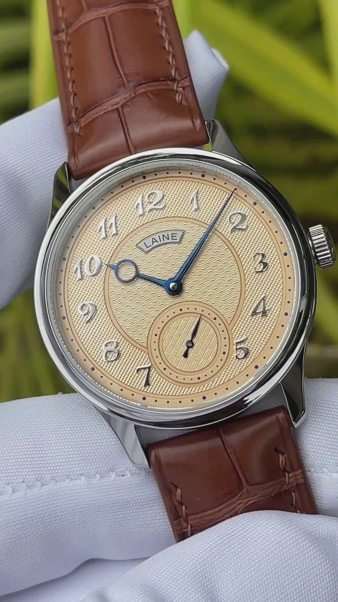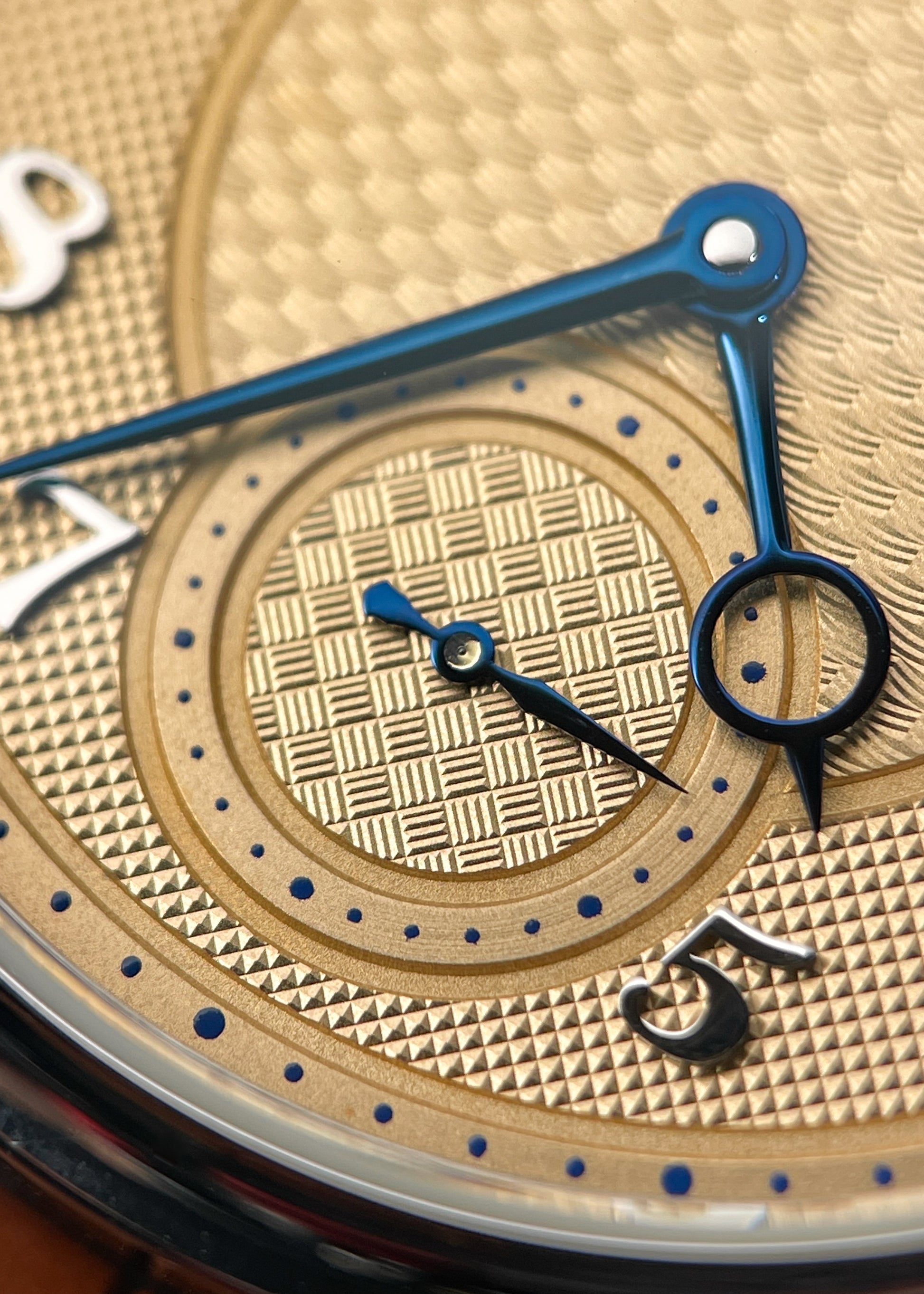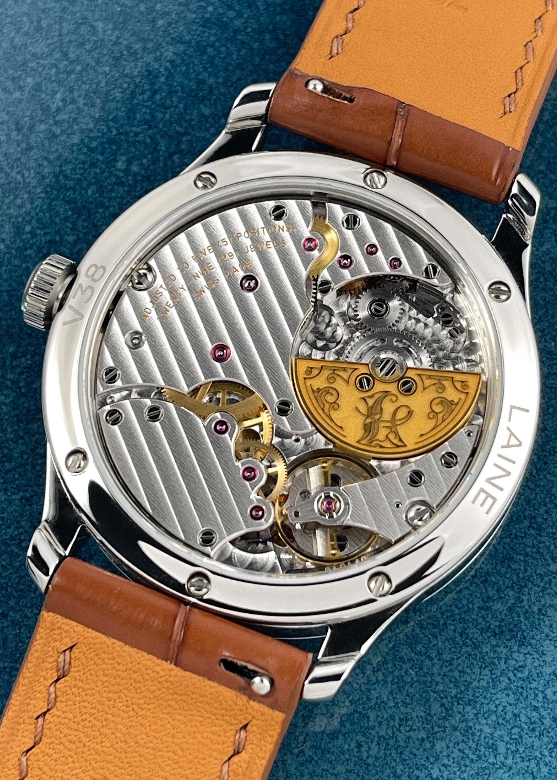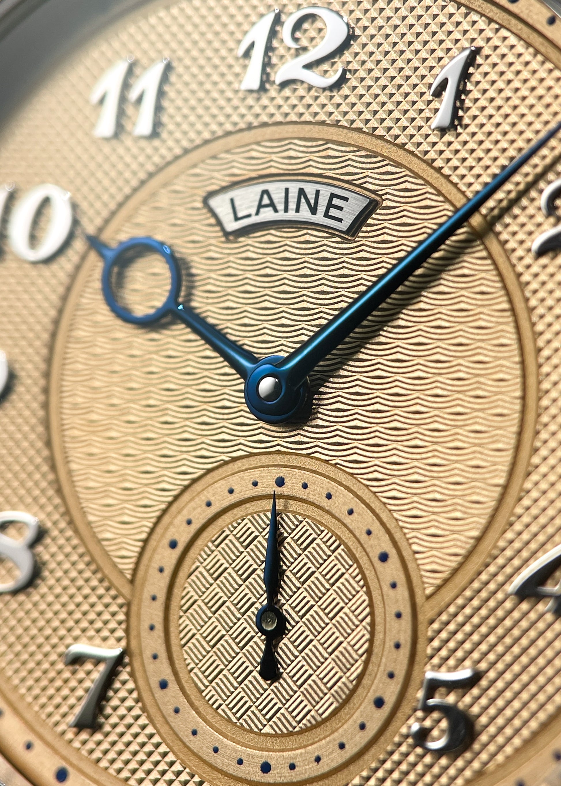 Presenting a beautiful custom example of the V38 from Laine. For this watch the client chose three patterns of straight-line guilloché... Panier pattern found on the inside, Clous De Paris for the hour chapter, and Basket Weave in the subdial. Additionally, Breguet style blued steel hands were crafted to complete the look for an additional charge.